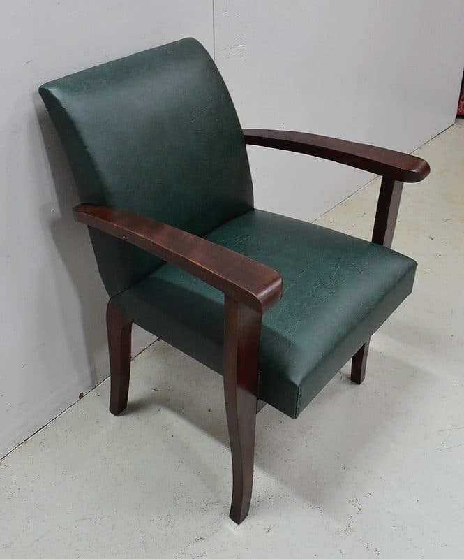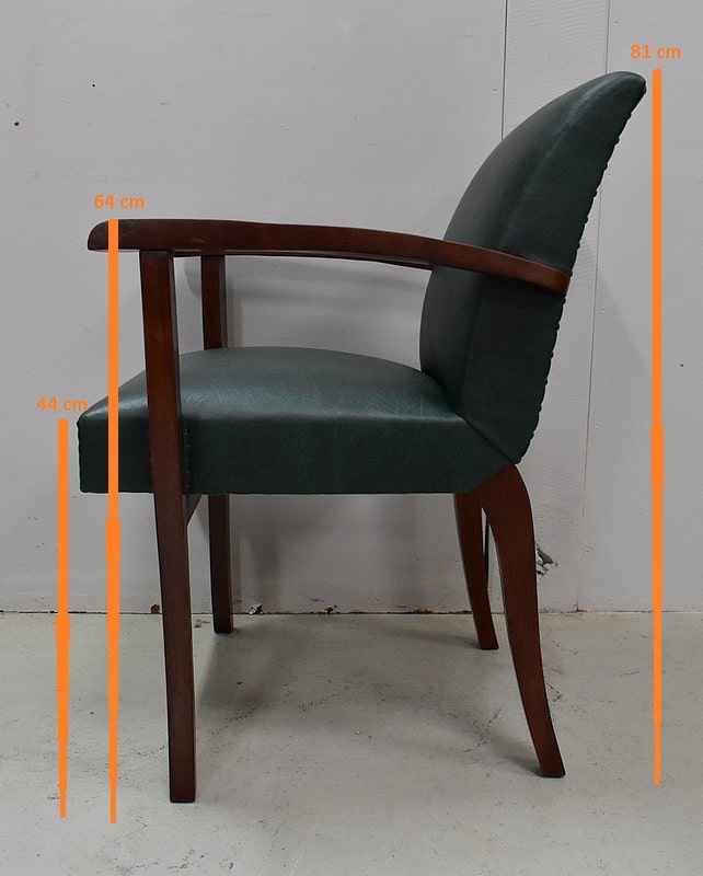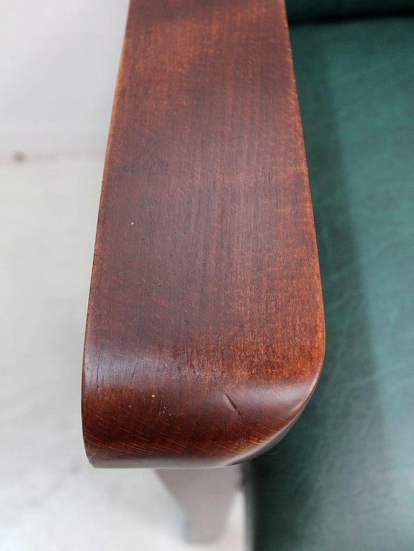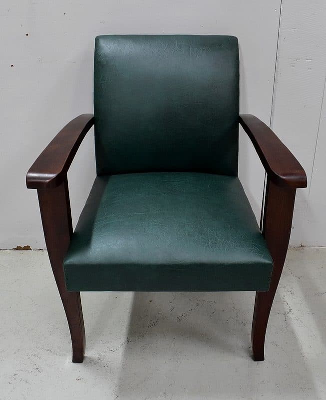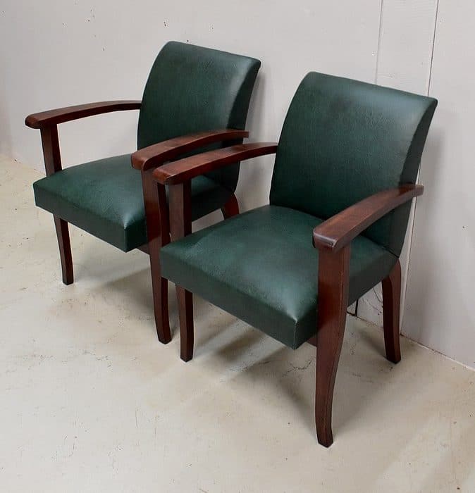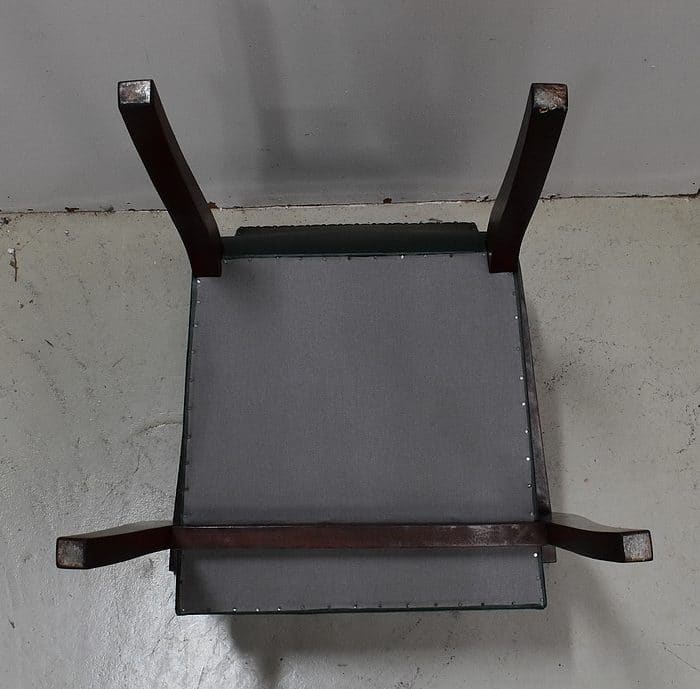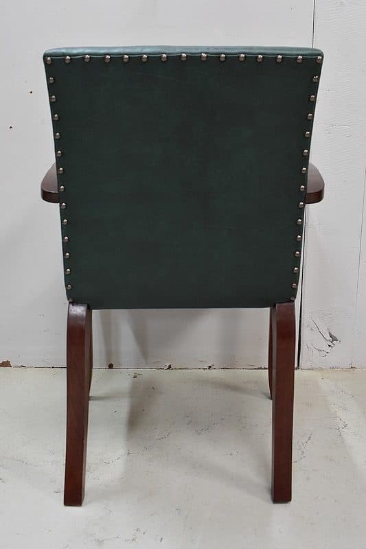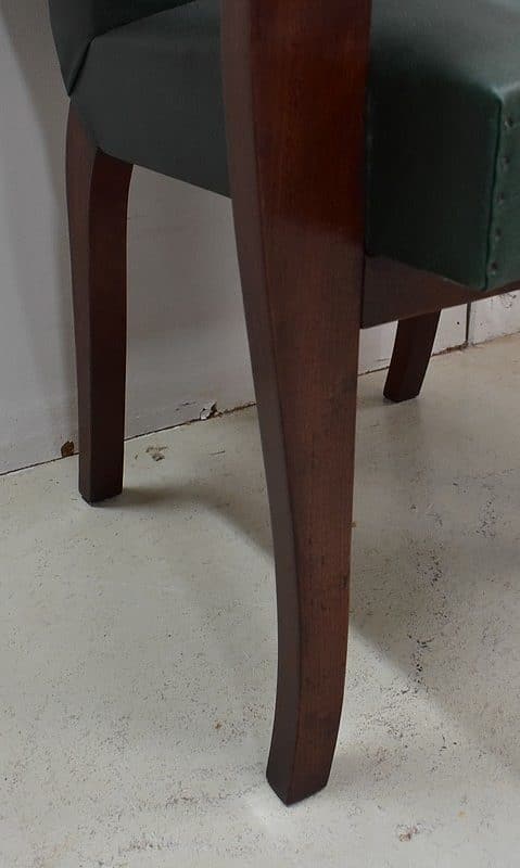 Les dossiers, sensiblement inclinés, ainsi que les assises, sont confortablement garnis. Ils sont recouverts d’un joli Skaï couleur Vert Forêt, très tendance. Ce revêtement, actuel mais artisanal, est à finitions Clous sur l’arrière des dossiers.