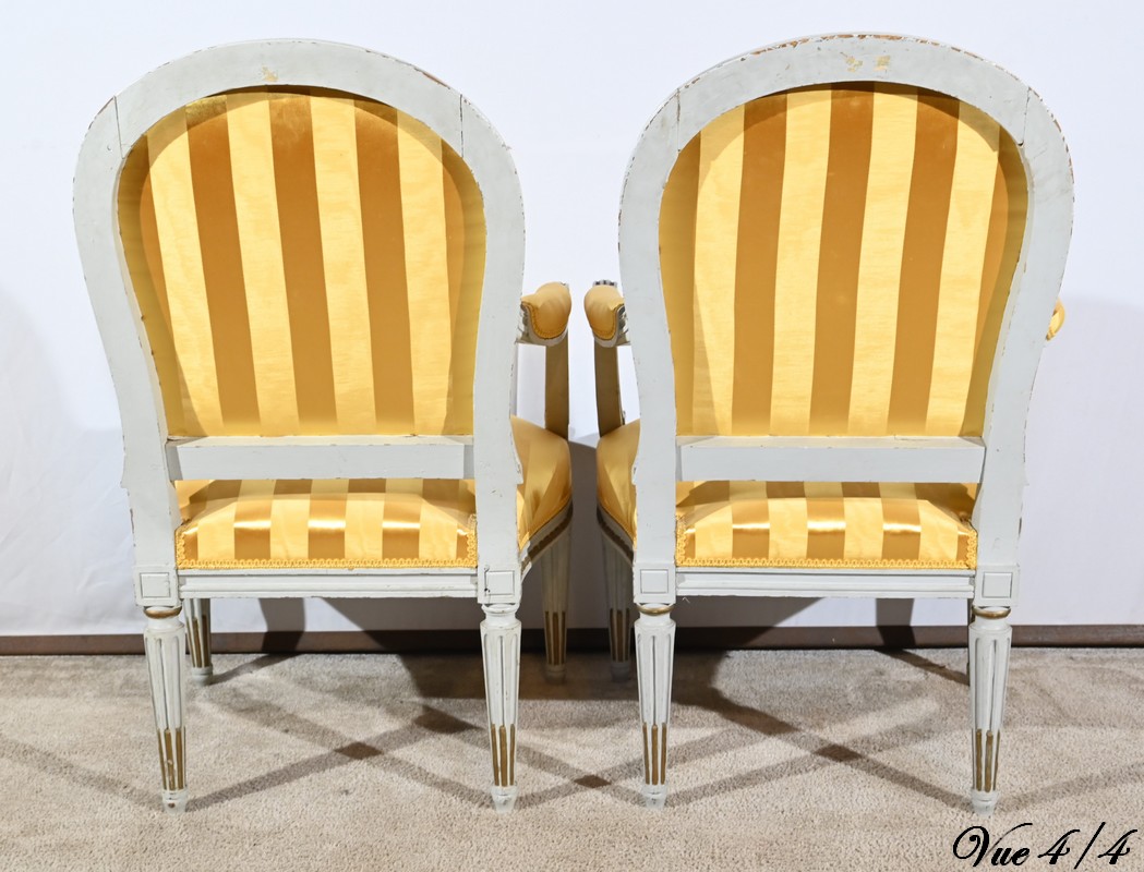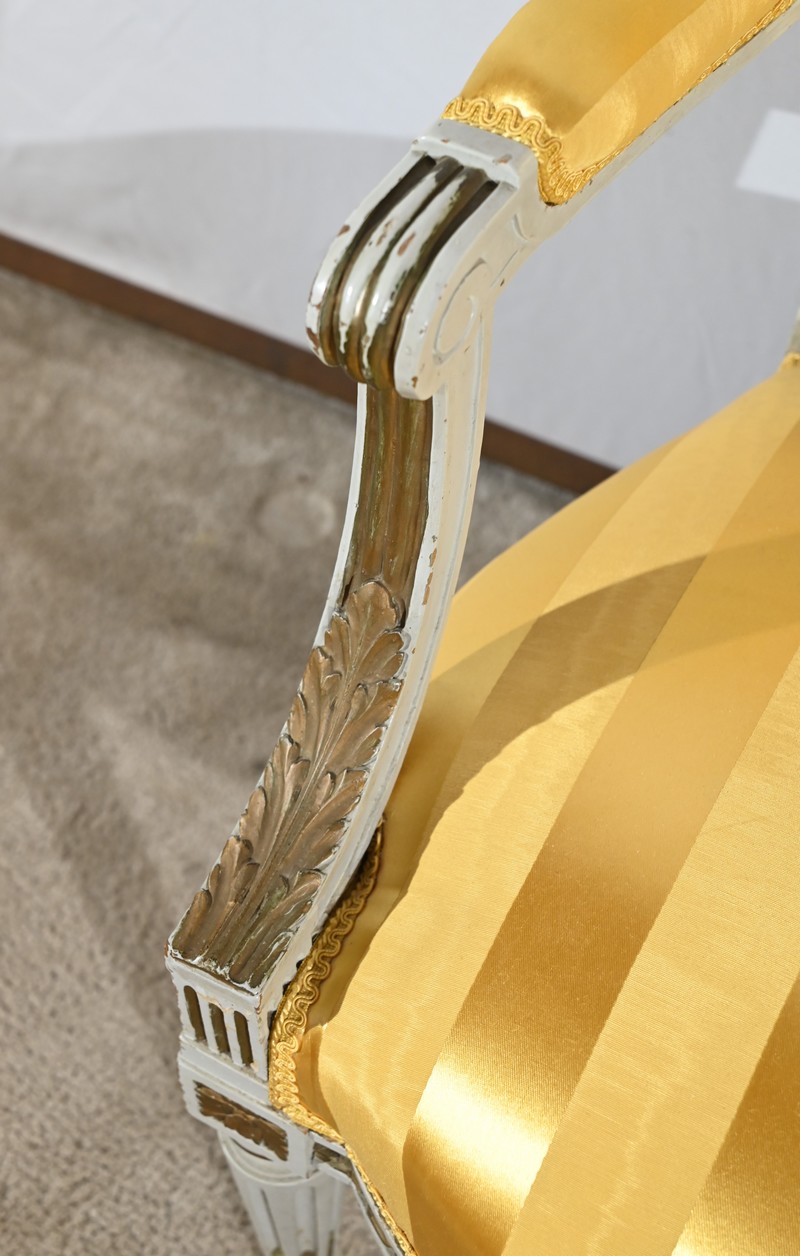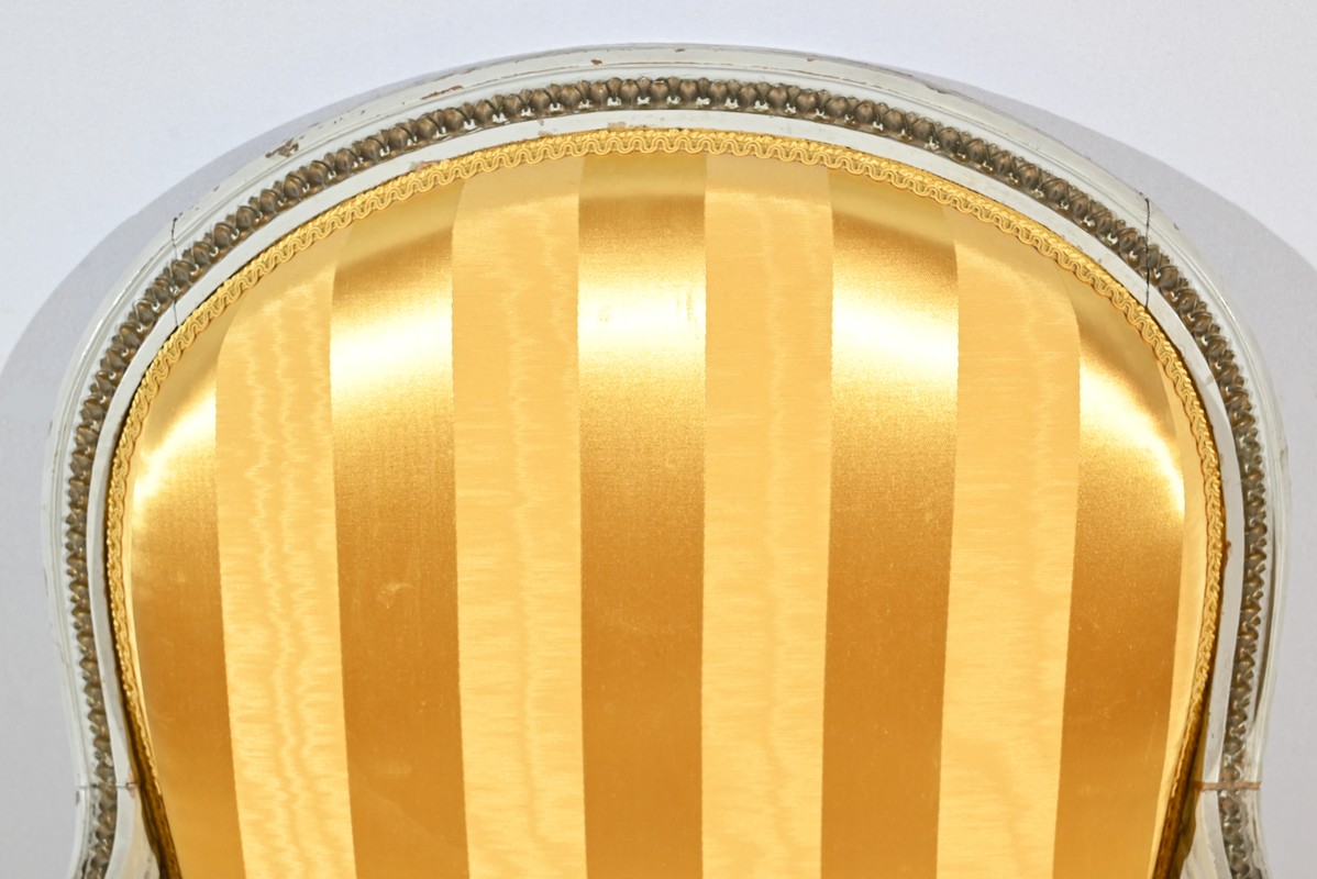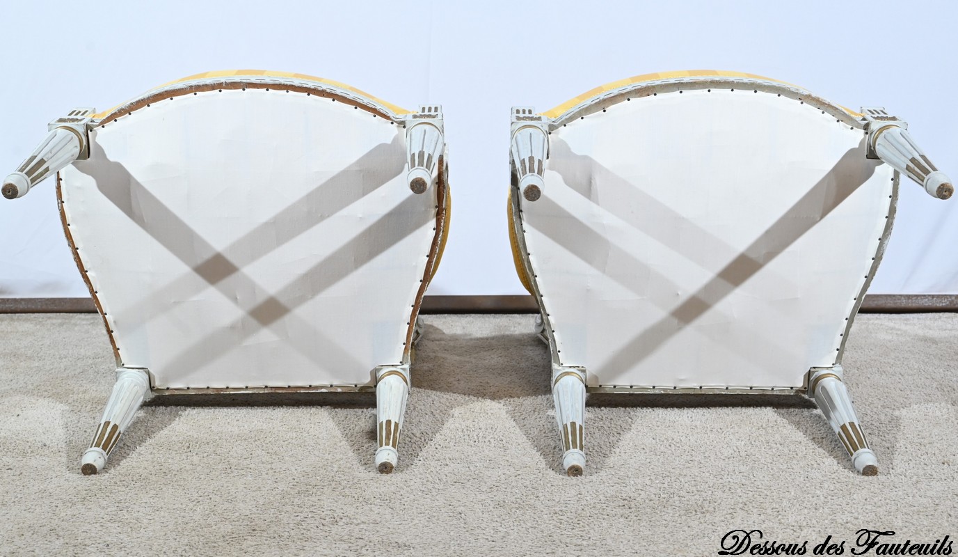 Élégante paire de fauteuils cabriolet, en bois réchampi, reposant sur des pieds tournés.