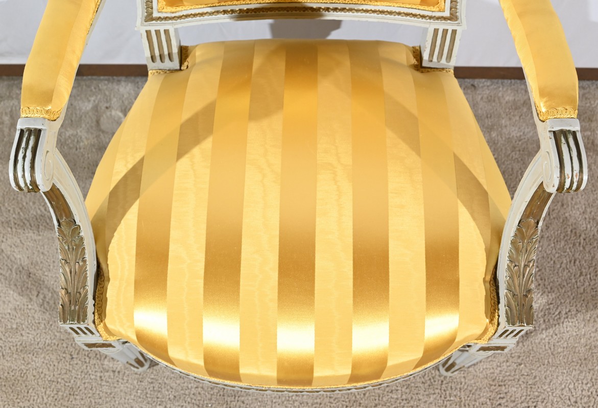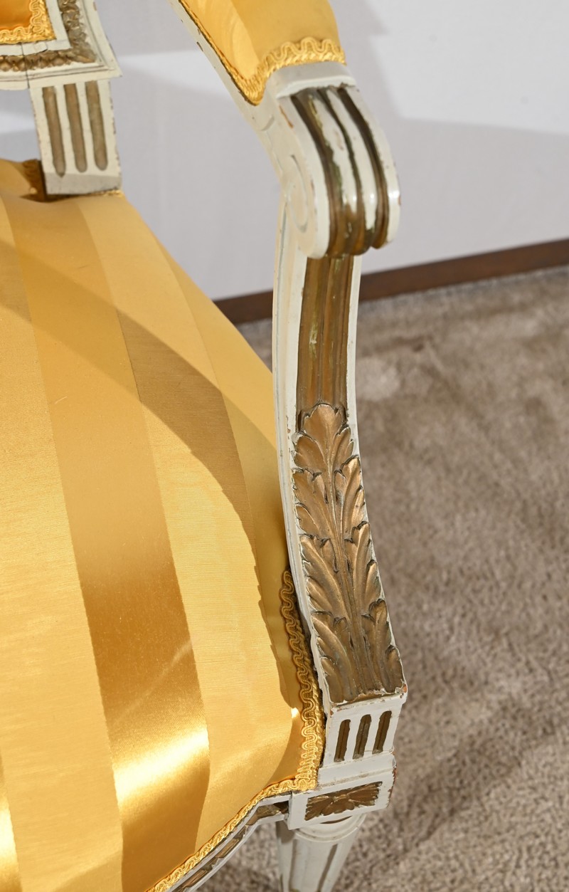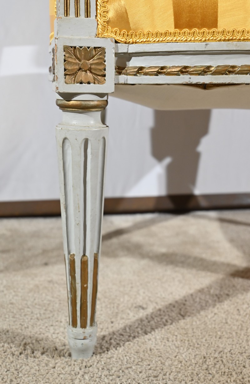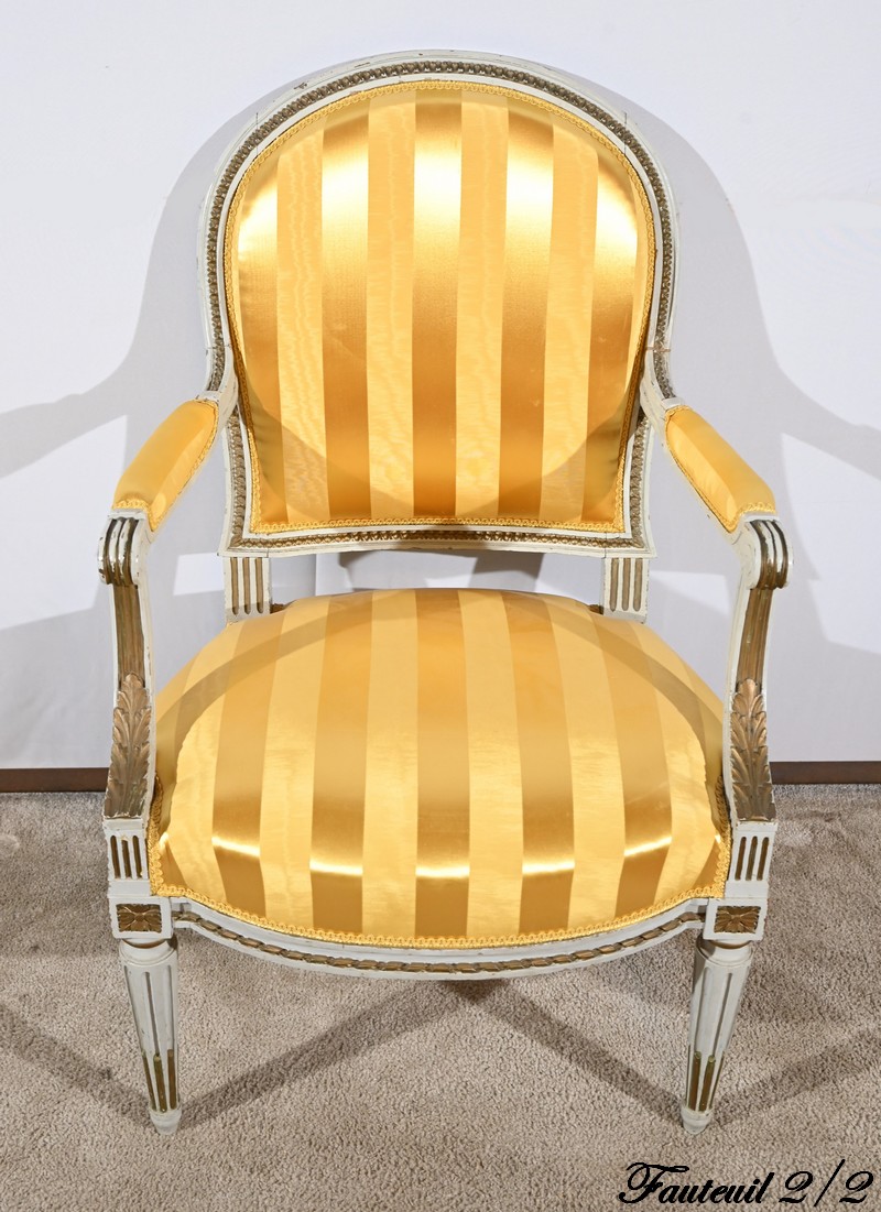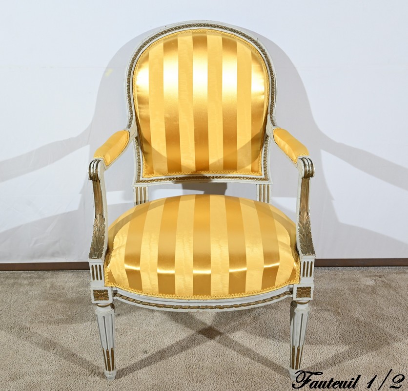 Élégante paire de fauteuils cabriolet, en bois réchampi, reposant sur des pieds tournés.