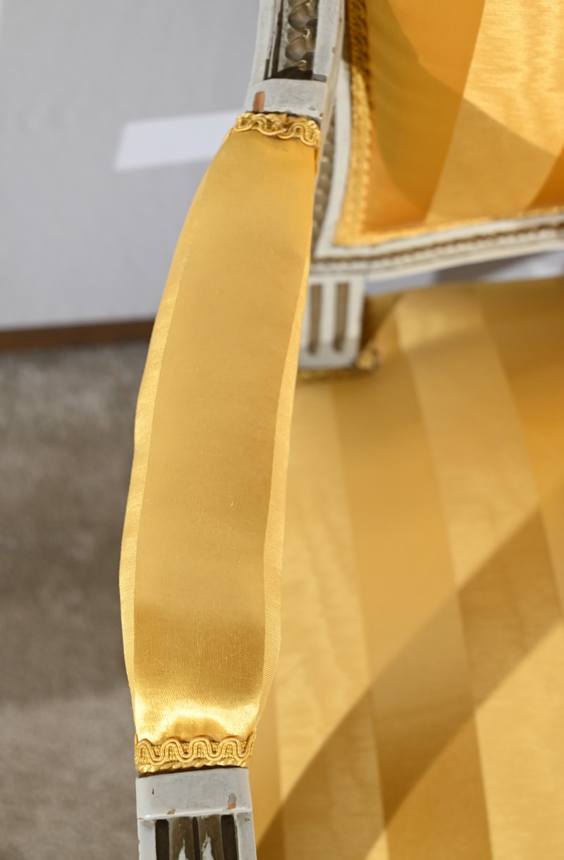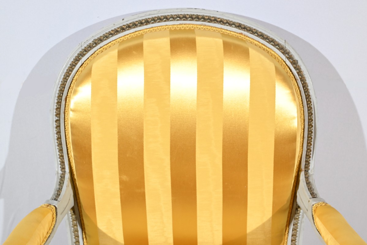 Ces fauteuils sont habillés d’un tissu jaune avec alternance de rayures claires et satinées.