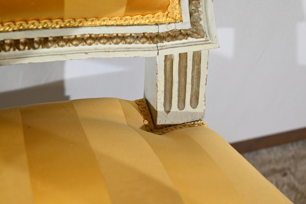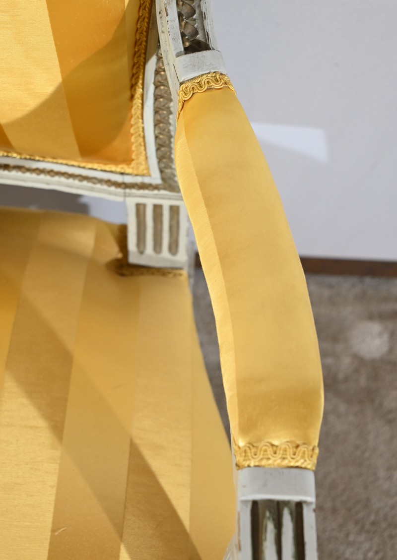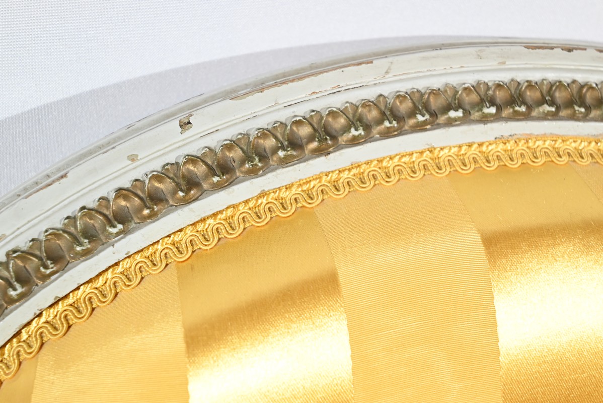 La continuité des pieds avant se fait par des éléments concaves ornés de moulures de feuilles d’acanthe dorées soutenant de petits accotoirs à manchettes.