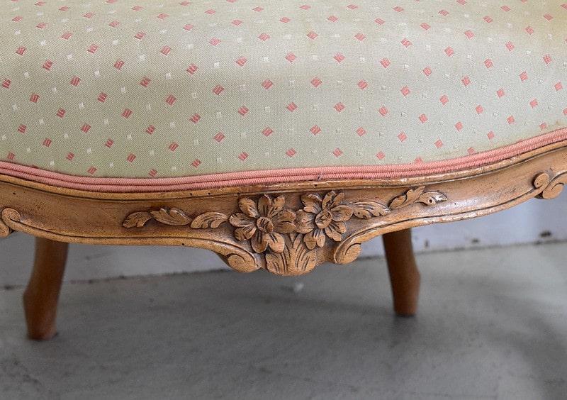 L’ossature moulurée est sculptée de fleurs en partie haute du dossier ainsi que les accotoirs et la traverse basse en façade.