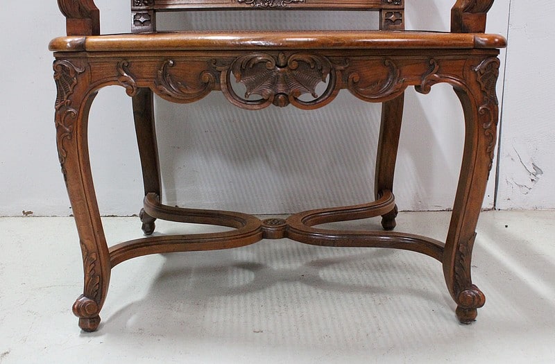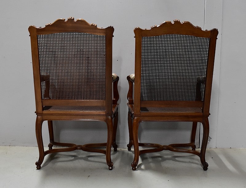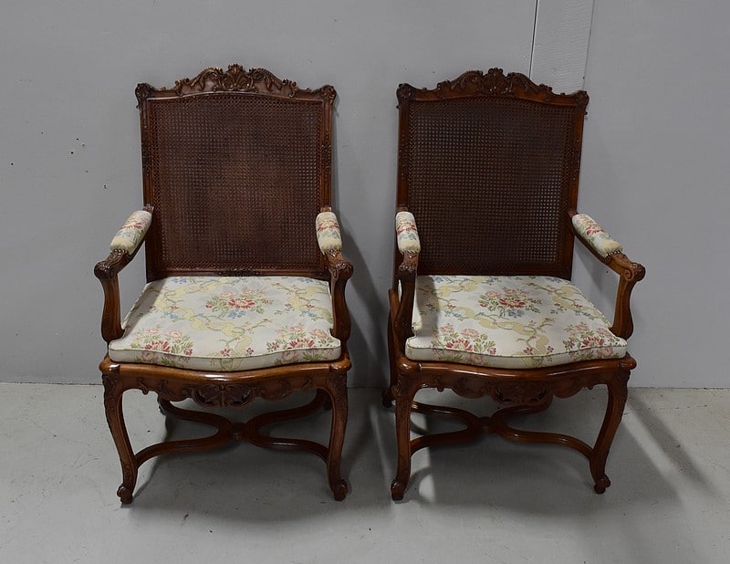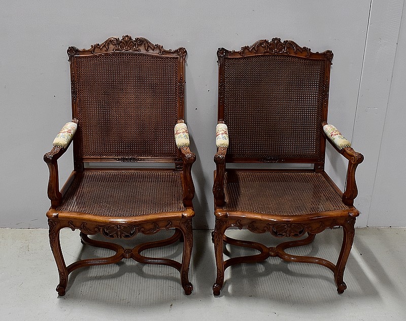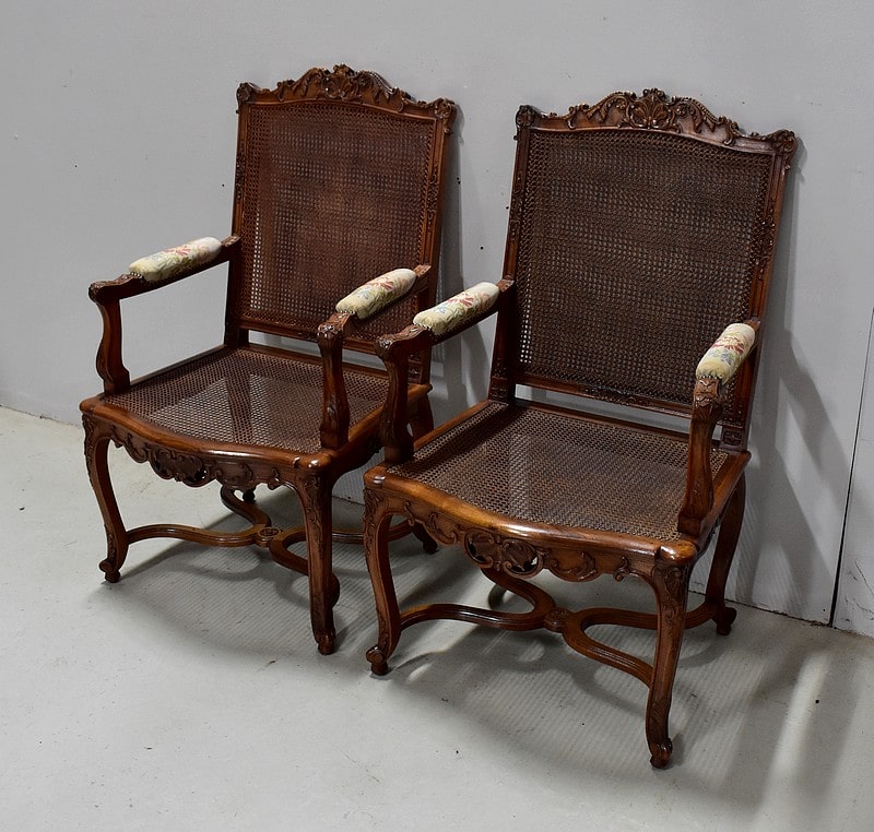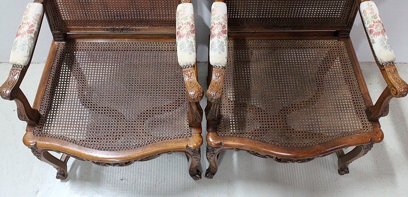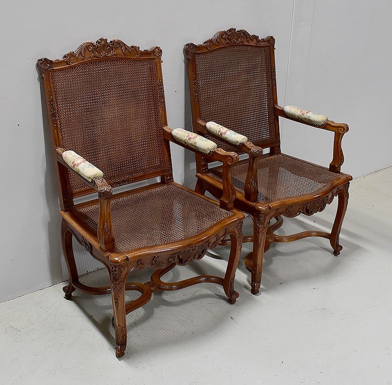Paire de Fauteuils de style Régence, en Noyer massif richement sculpté et aux dimensions généreuses.