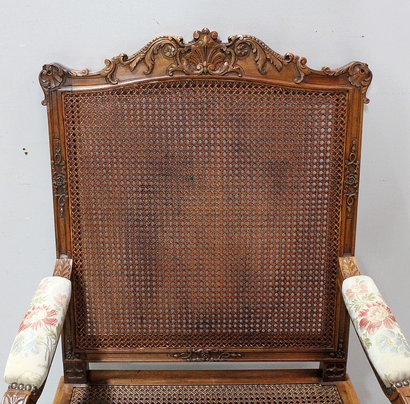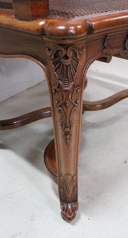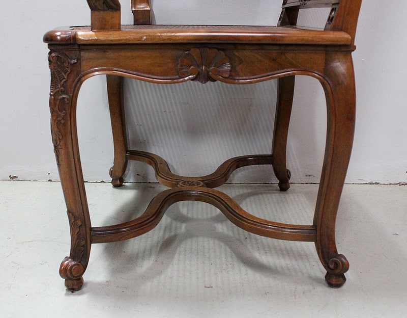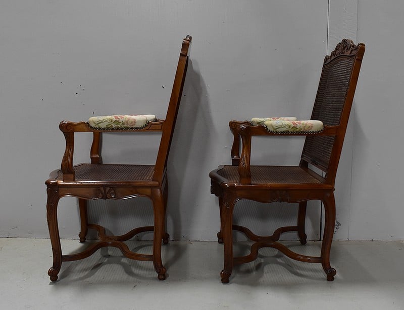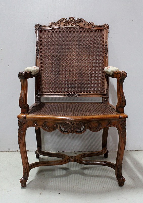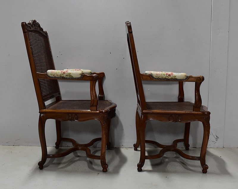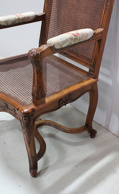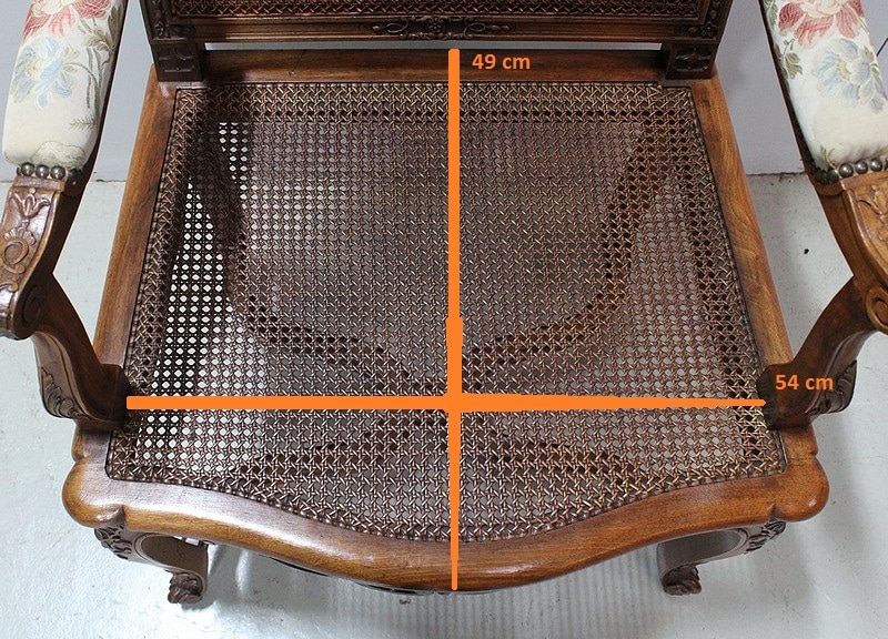 Paire de Fauteuils de style Régence, en Noyer massif richement sculpté et aux dimensions généreuses.