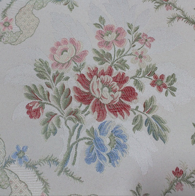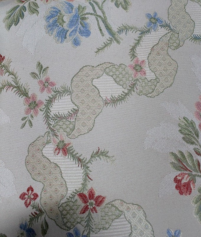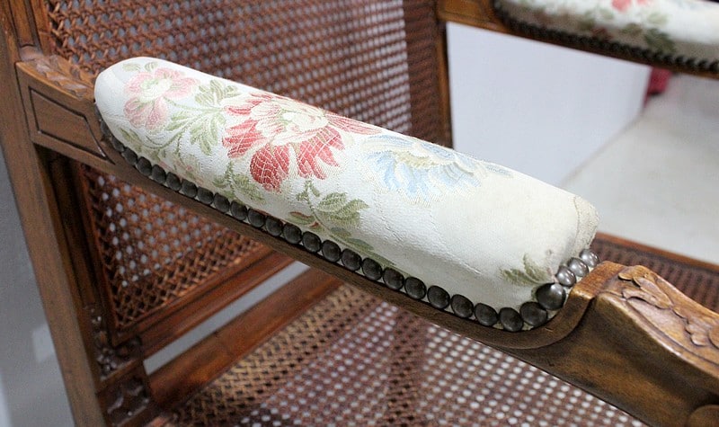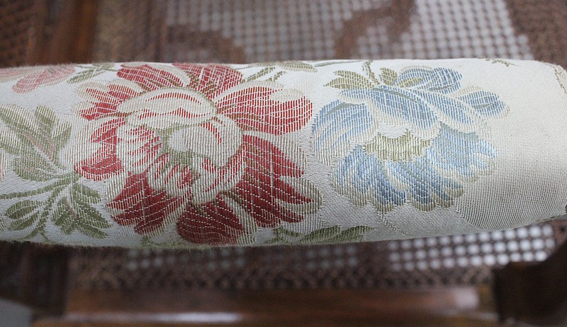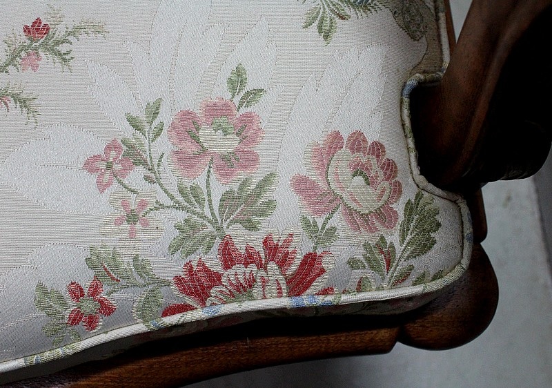 Les accotoirs à consoles courbes en retrait, sont dotés de manchettes recouvertes d’un tissu fleuri à finitions clous.