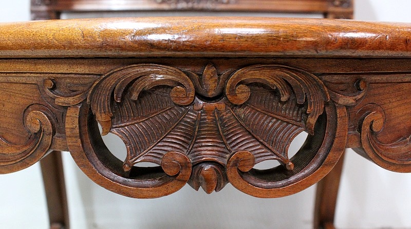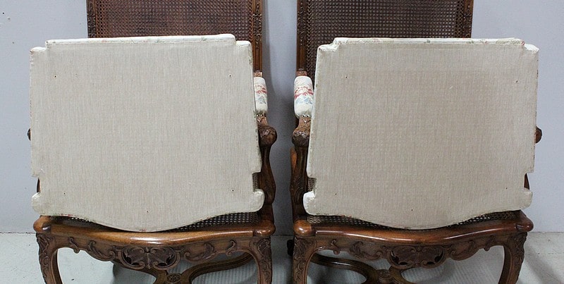 On appréciera l’abondance des sculptures à symétrie parfaite présentes sur toute la structure de ces Fauteuils. Ainsi, Palmettes, Volutes, Fleurettes, Coquilles ou encore feuilles d’Acanthe viennent enjoliver cette Paire de Sièges et lui donner ce caractère propre au style Régence.