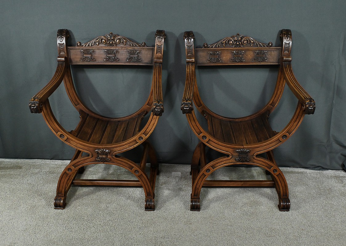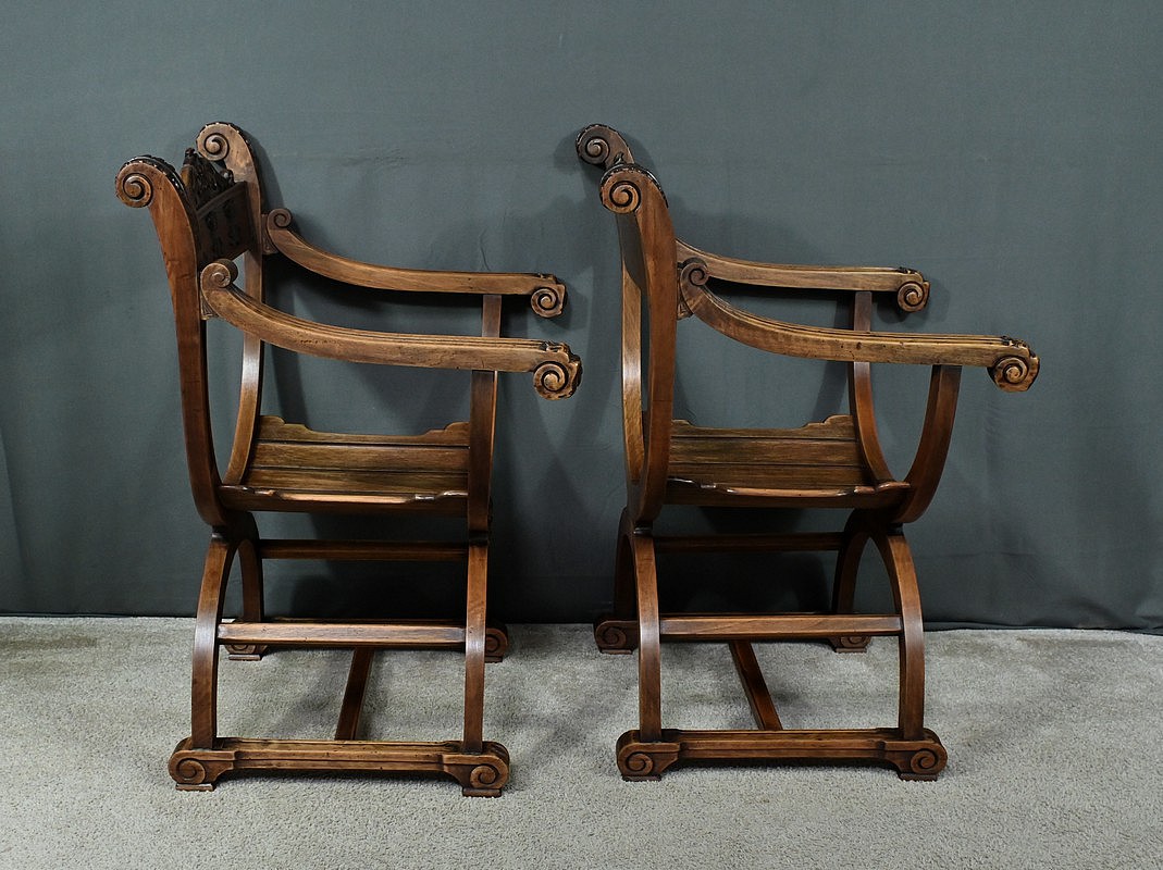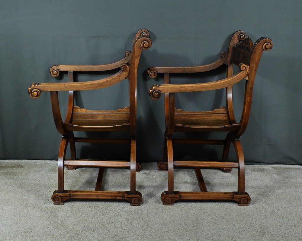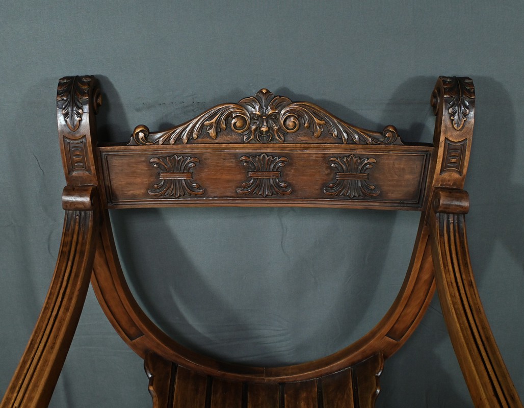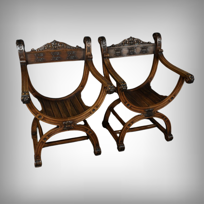 Ces fauteuils reposent sur un piétement en X, renforcé par des entretoises assurant stabilité. Inspirés du trône du roi Dagobert, ces sièges évoquent l’esthétique des mobiliers antiques tout en intégrant des influences médiévales. Son élégante structure incurvée et ses ornements ciselés lui confèrent authenticité et prestance.