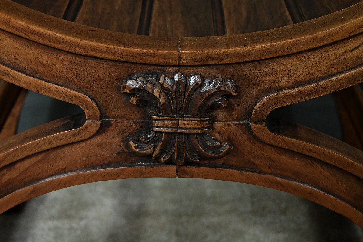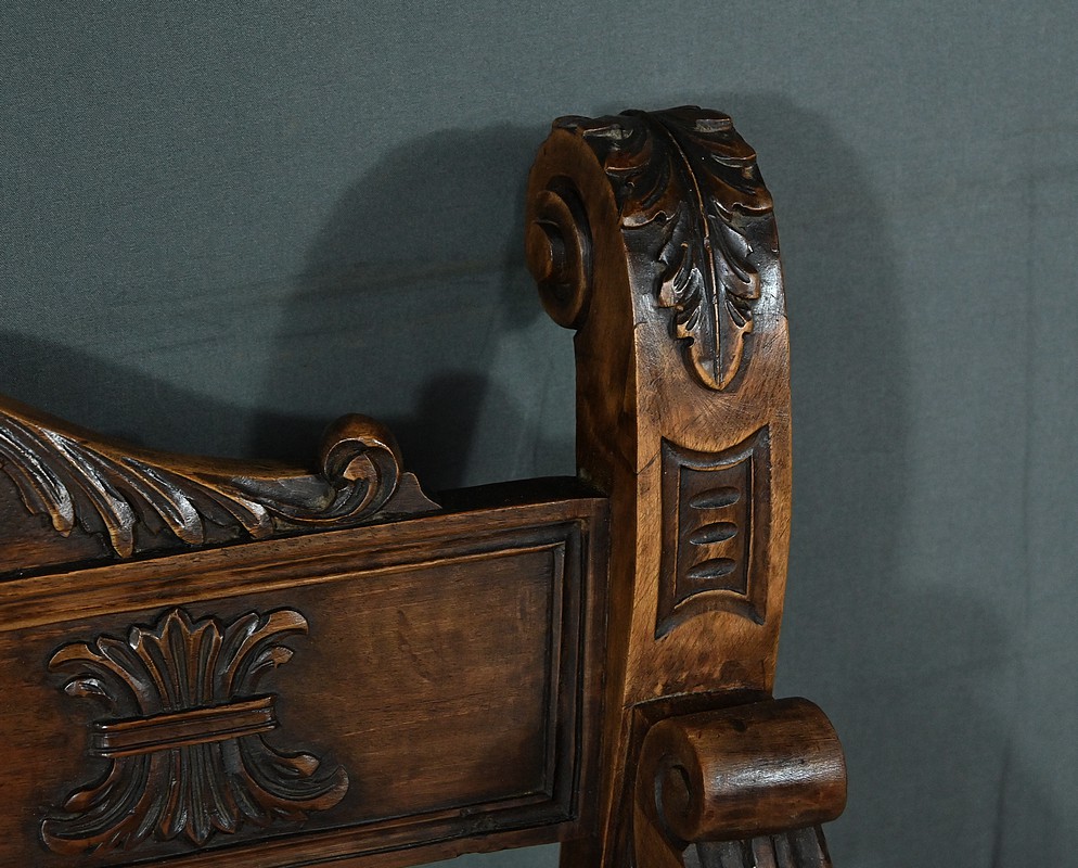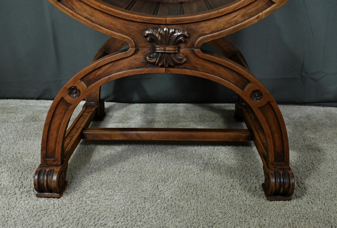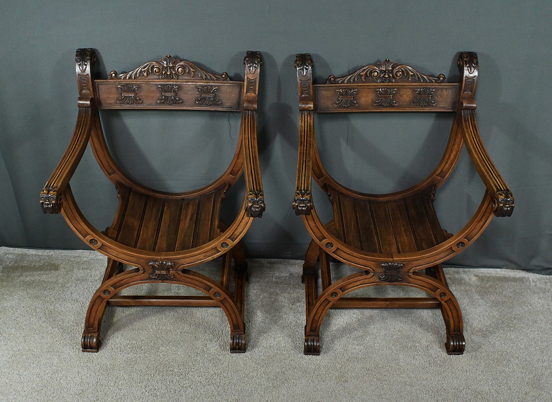 Ces fauteuils reposent sur un piétement en X, renforcé par des entretoises assurant stabilité. Inspirés du trône du roi Dagobert, ces sièges évoquent l’esthétique des mobiliers antiques tout en intégrant des influences médiévales. Son élégante structure incurvée et ses ornements ciselés lui confèrent authenticité et prestance.