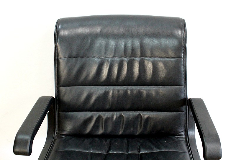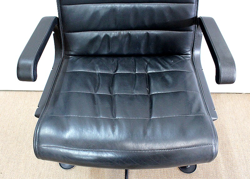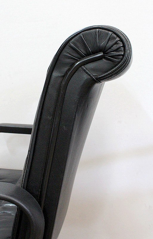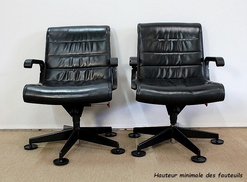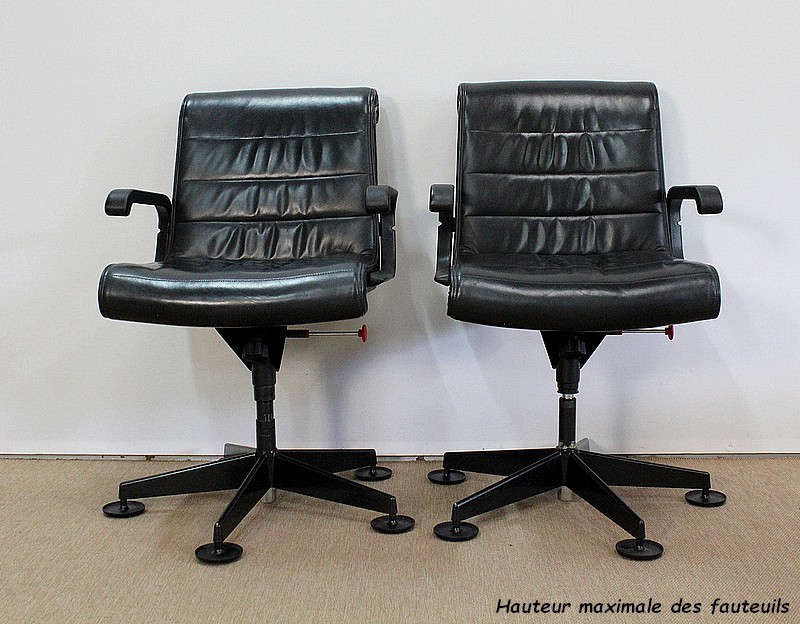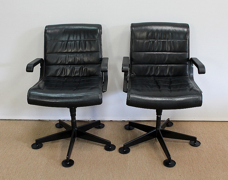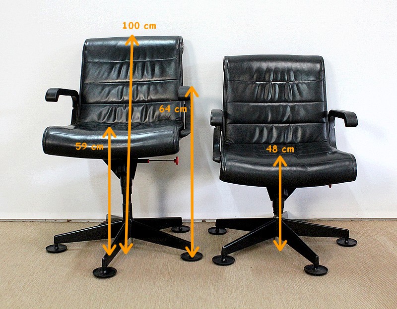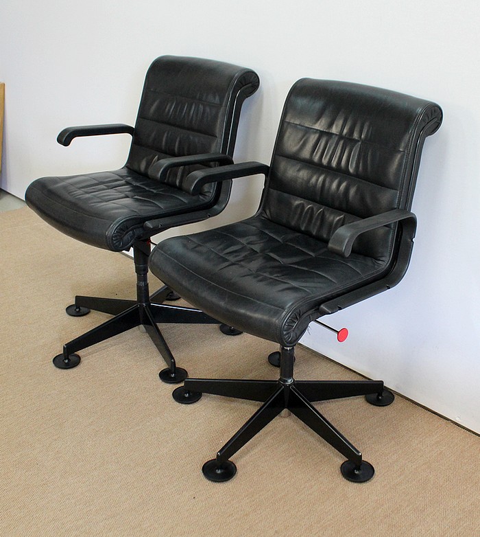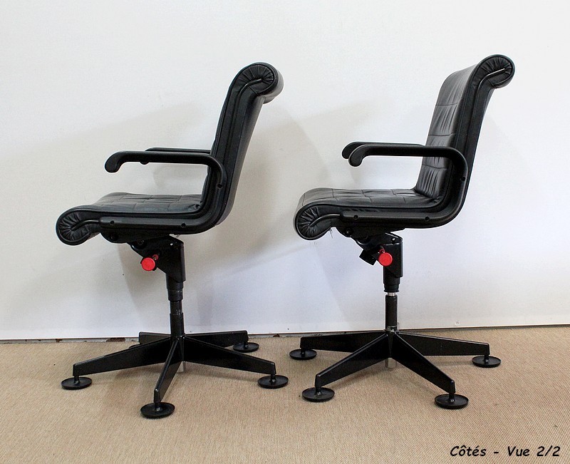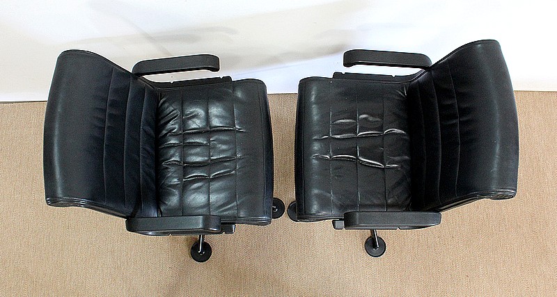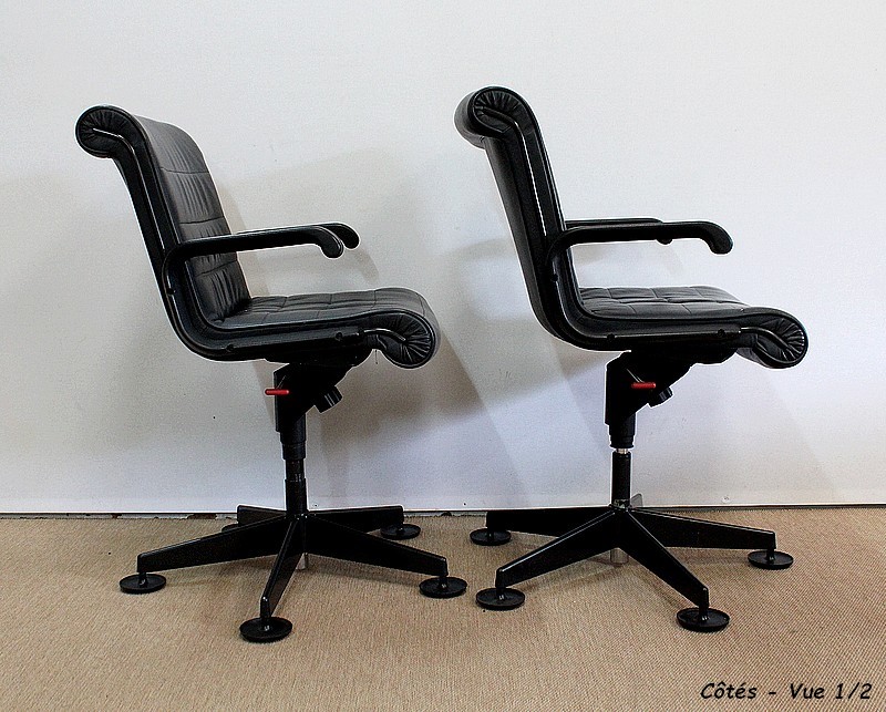 Couple de fauteuils de bureau en cuir datant de 1979 et dessinés par le designer industriel allemand, Richard Sapper (1932-2015), pour la société Knoll. Installé en Italie, Richard Sapper est célèbre dans le monde entier. Il a étudié la philosophie, l’anatomie, l’ingénierie, le graphisme et l’économie. On lui décernera plusieurs récompenses dont dix prix Compasso d’Oro, le Lucky Strike Award de la Raymond Loewy Foundation (1992) et la Grand-croix du Mérite de la République Fédérale d’Allemagne (2012). Ce qui l’intéresse principalement est le design d’objets techniquement complexes, des bateaux aux montres. Sapper continue à créer de nombreux classiques du design, comme la série Sapper Office Chair pour Knoll en 1979.