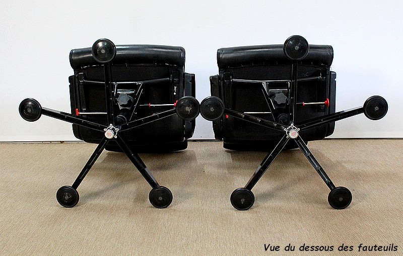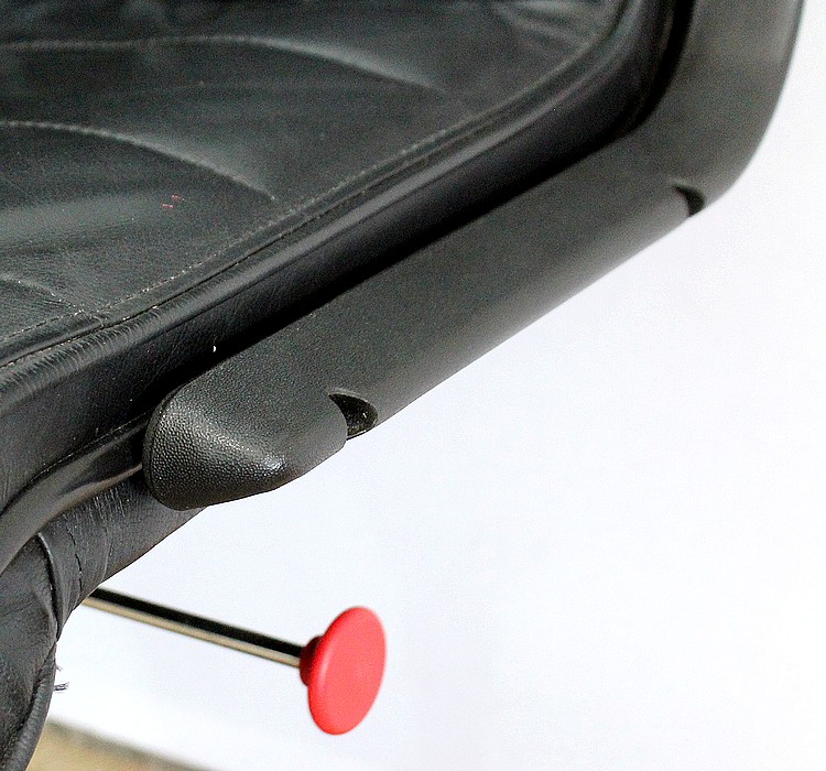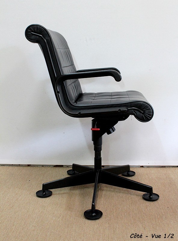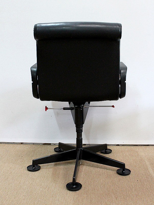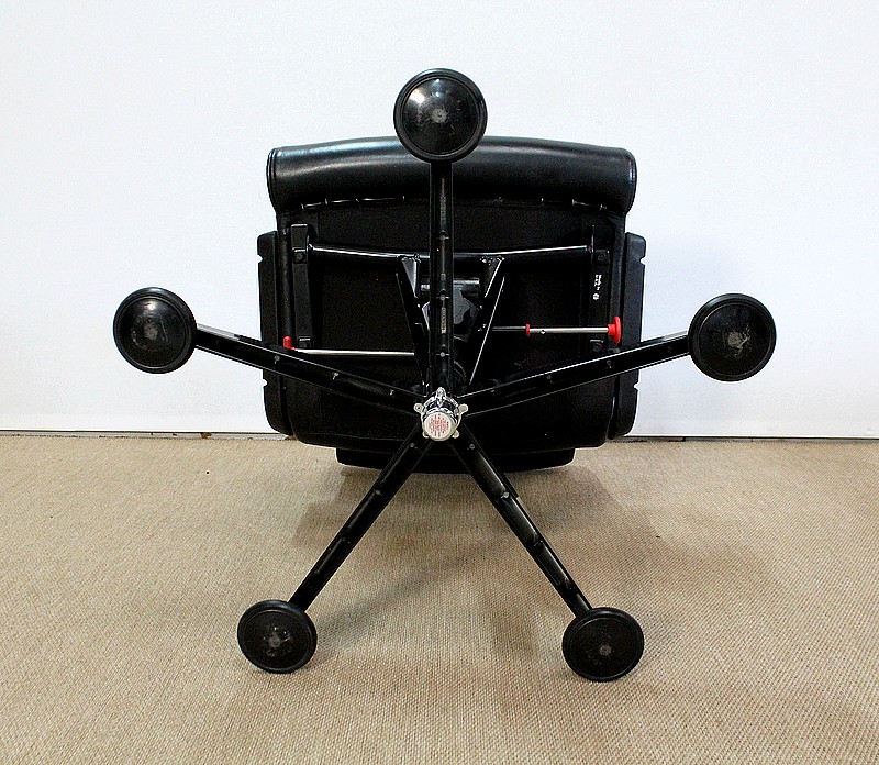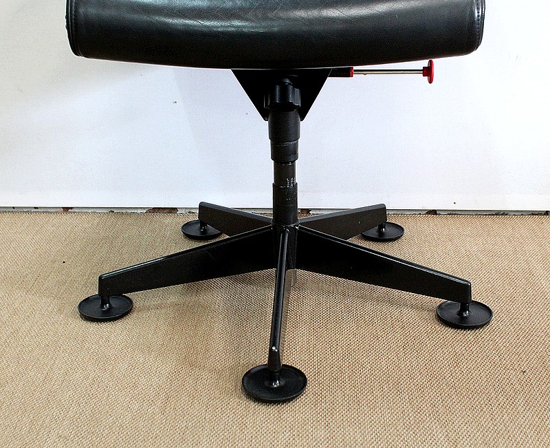 L’ensemble se soutient sur un pied étoile formé de cinq branches, elles-mêmes reposant sur de larges patins ronds en métal noir. Ce pied pivotant permet plusieurs réglages grâce à la présence d’une manette de chaque côté : une à gauche permettant l’ajustement de la hauteur de l’assise puis une seconde, à droite, permettant d’adapter le degré d’inclinaison du siège. Ces leviers sont en parfait état de fonctionnement.