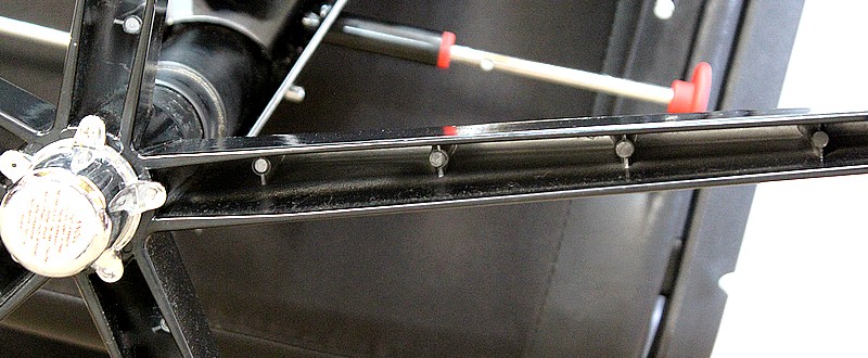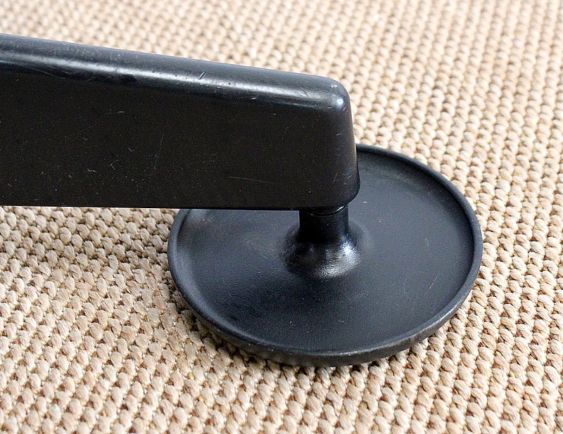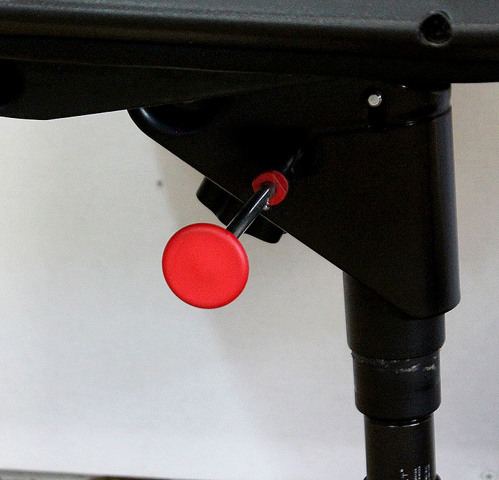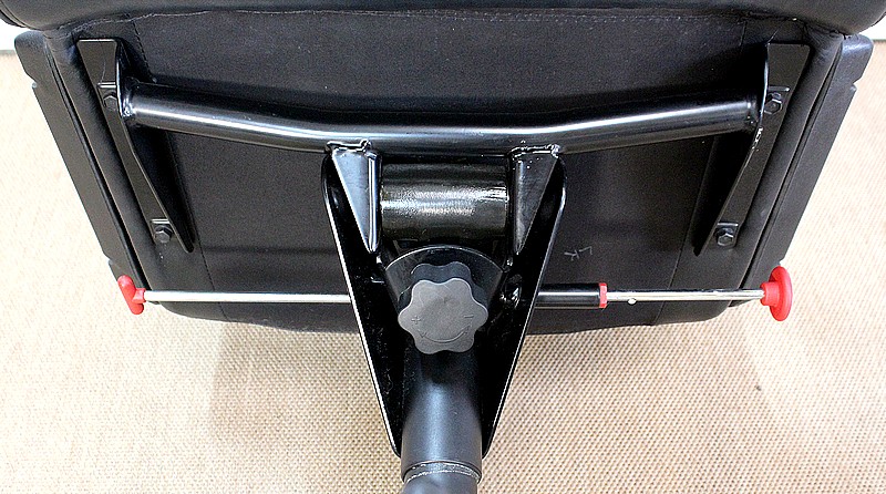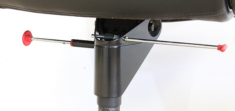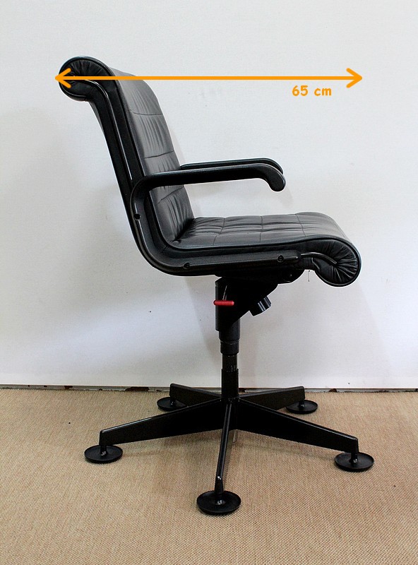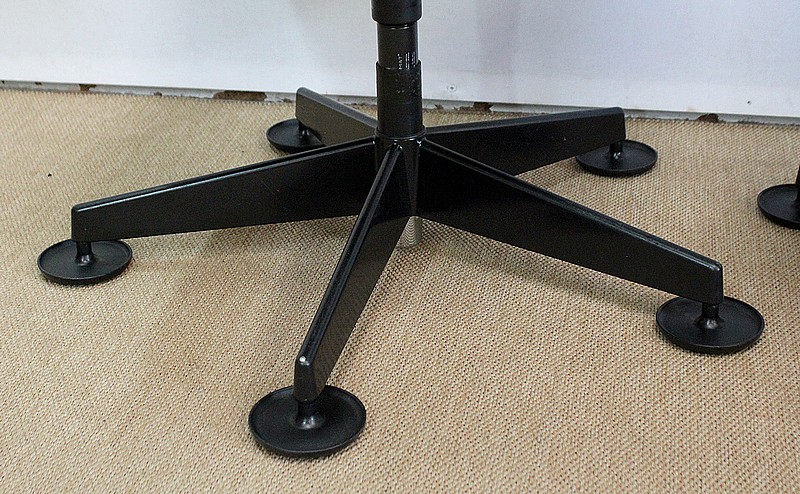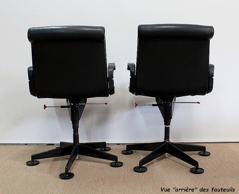 L’ensemble se soutient sur un pied étoile formé de cinq branches, elles-mêmes reposant sur de larges patins ronds en métal noir. Ce pied pivotant permet plusieurs réglages grâce à la présence d’une manette de chaque côté : une à gauche permettant l’ajustement de la hauteur de l’assise puis une seconde, à droite, permettant d’adapter le degré d’inclinaison du siège. Ces leviers sont en parfait état de fonctionnement.