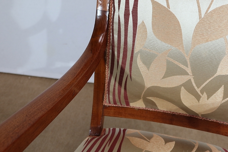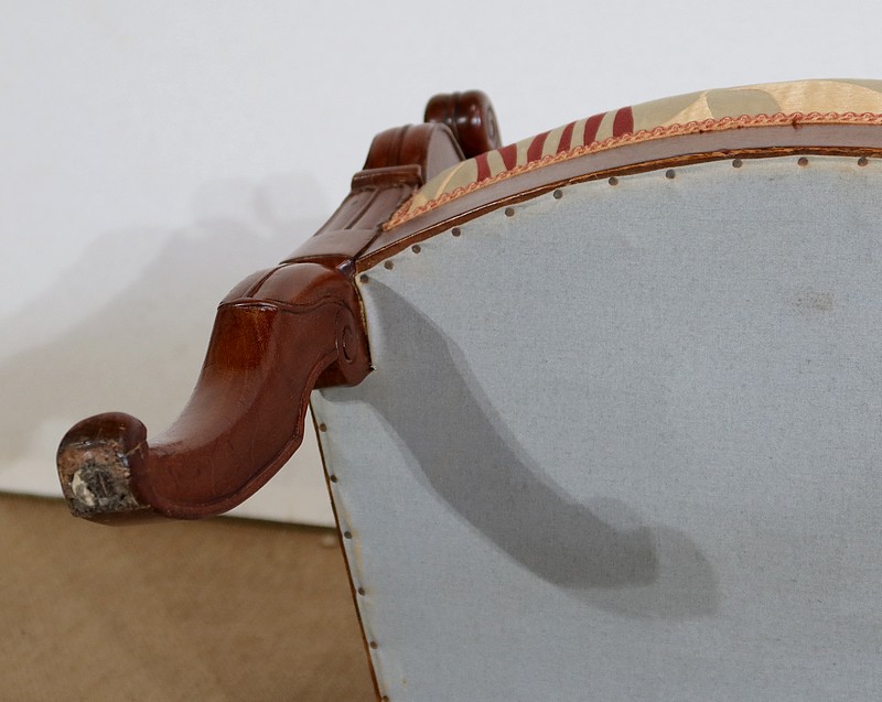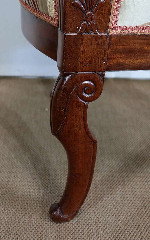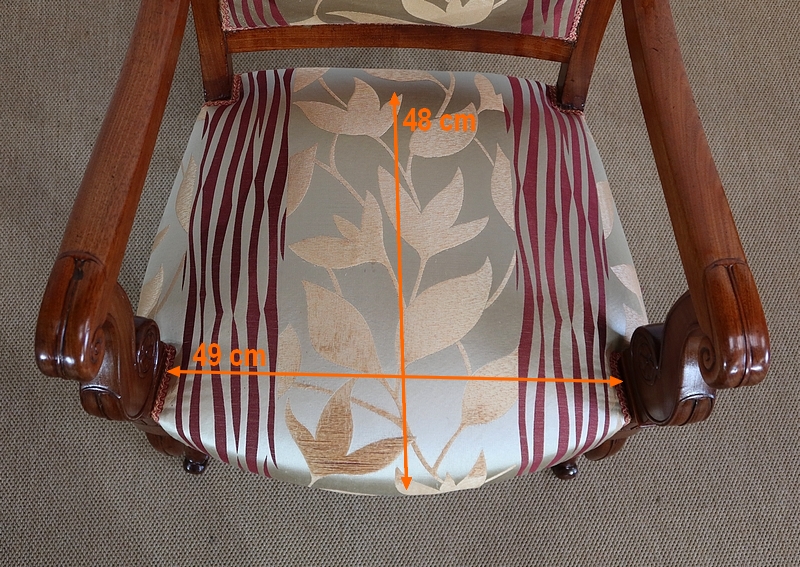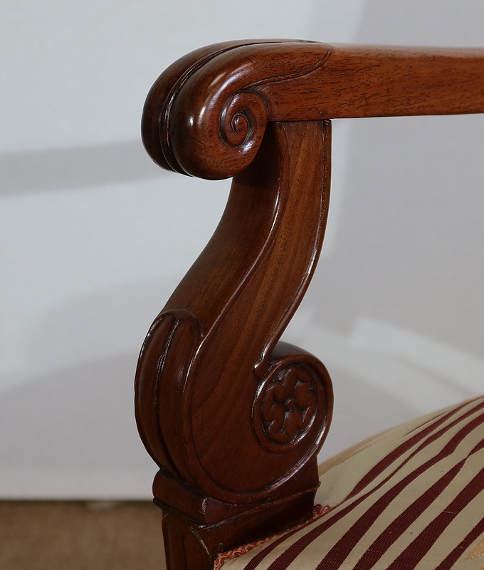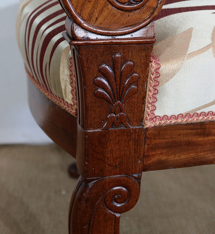 La continuité des pieds arrière se fait par une console renversée soutenant les accotoirs lisses. Sur les côtés, nous découvrons des ornementations sculptées représentant des rosaces et des palmettes.