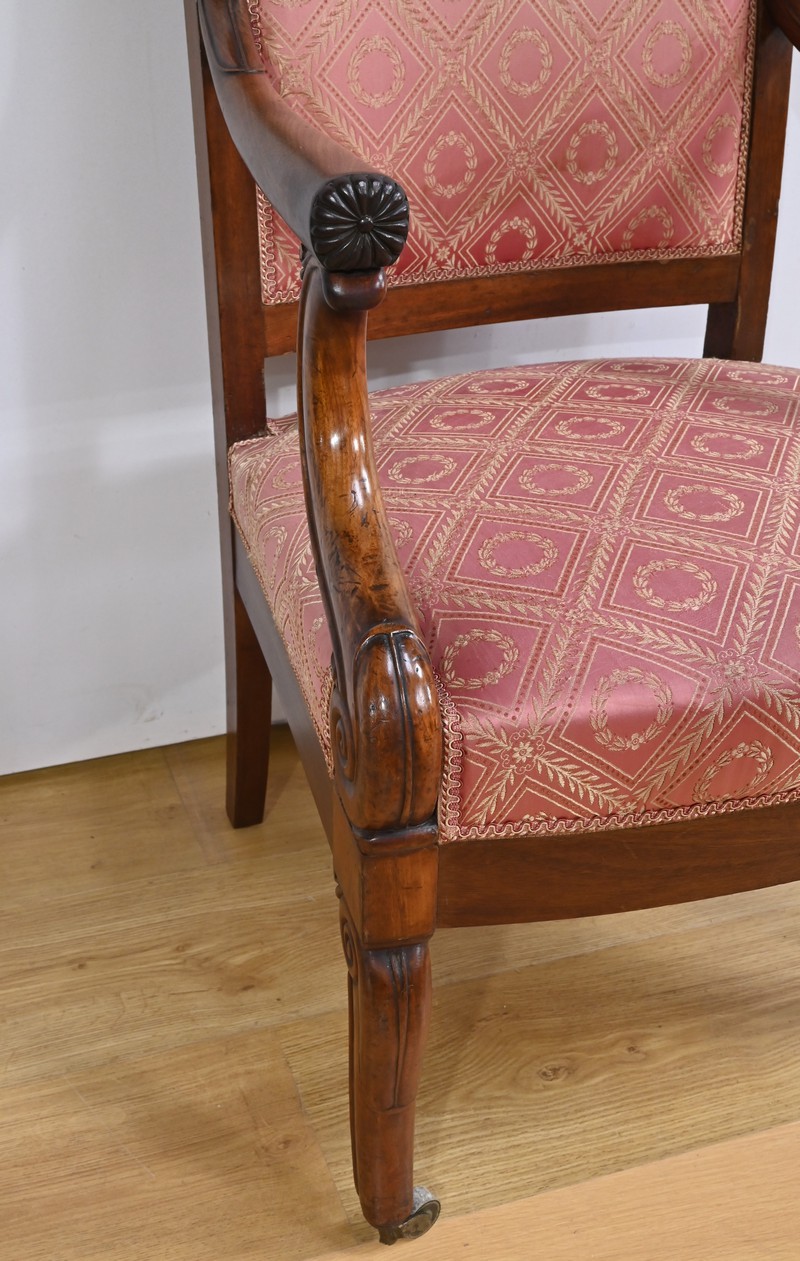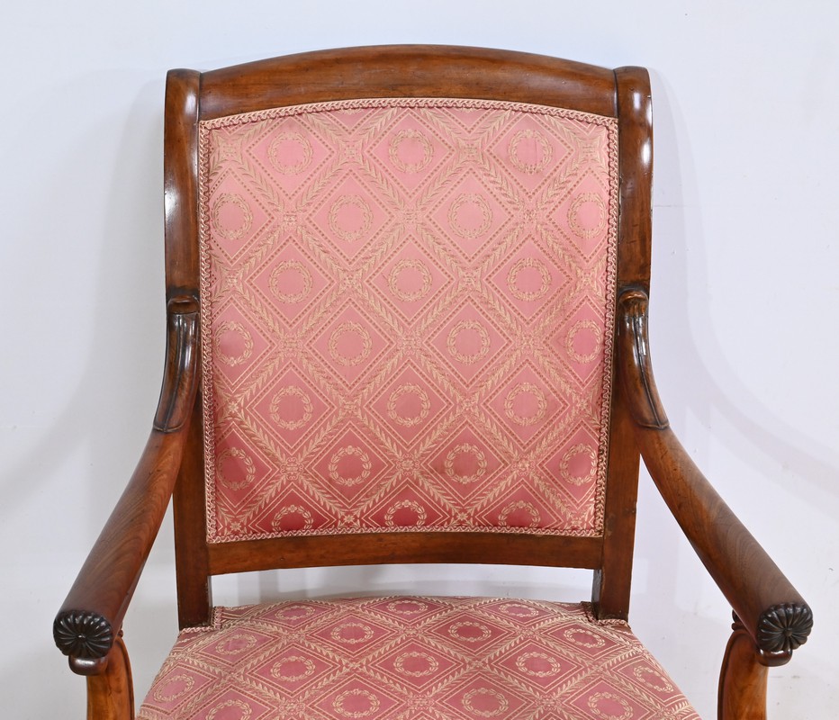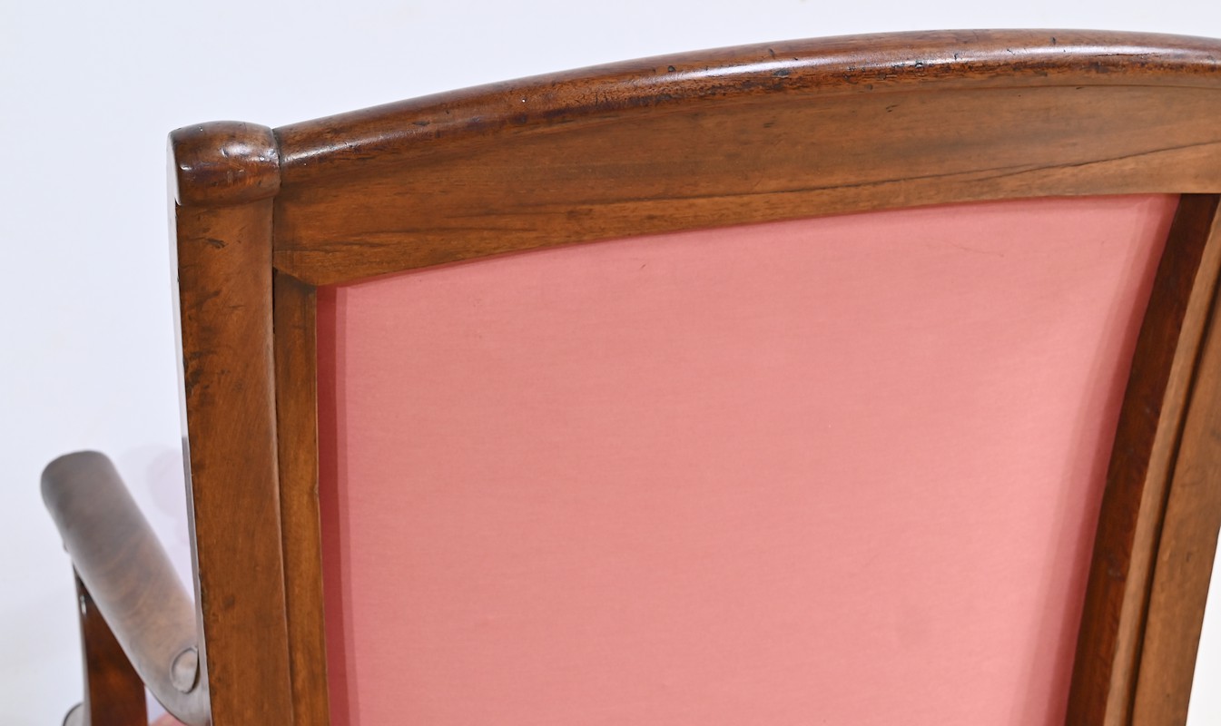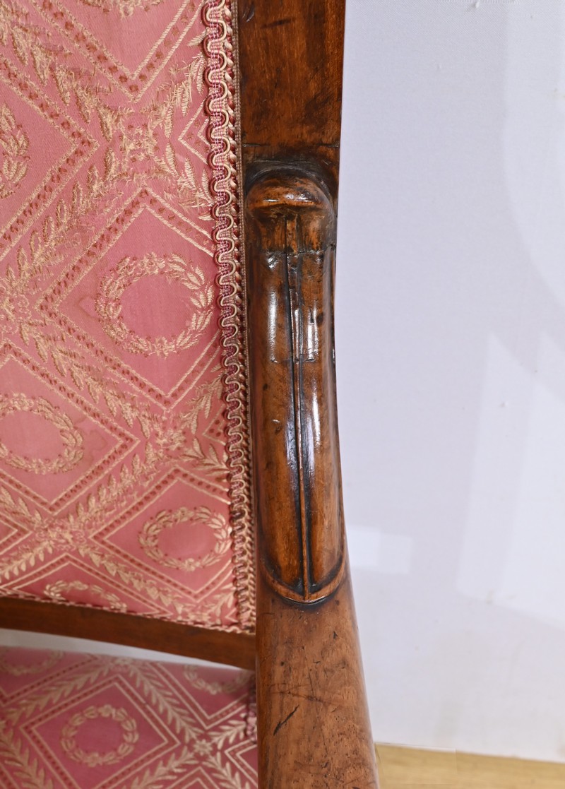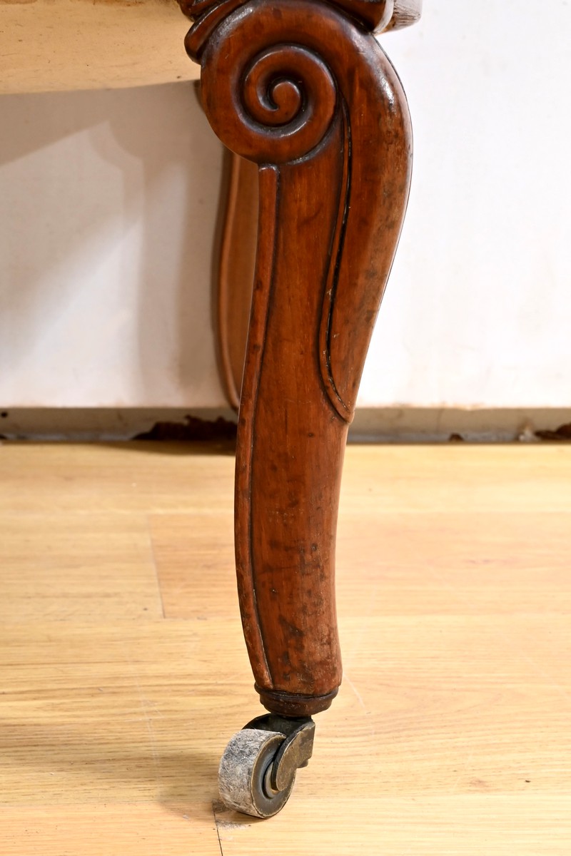 Les accotoirs, ornés de rosaces, sont soutenus par des consoles généreusement mouvementées, ajoutant une dimension sculpturale à ces pièces.