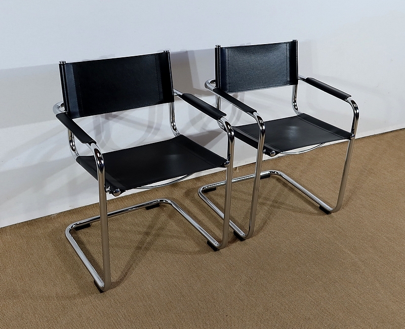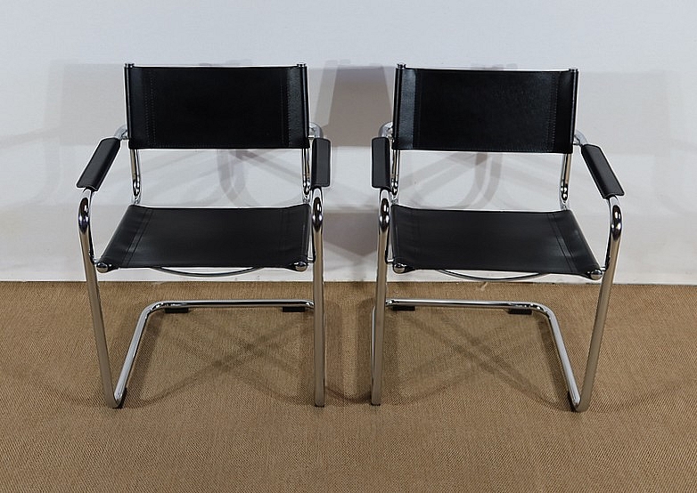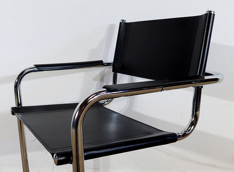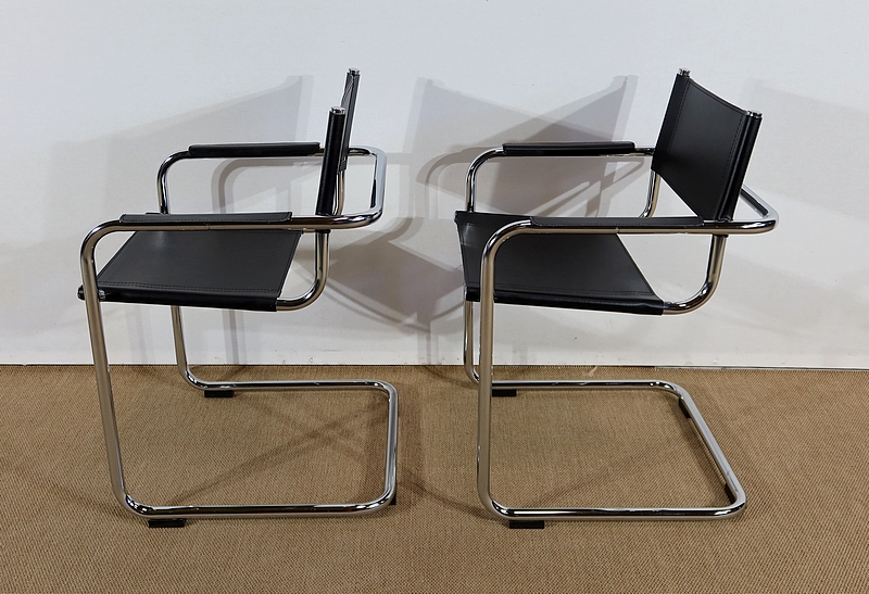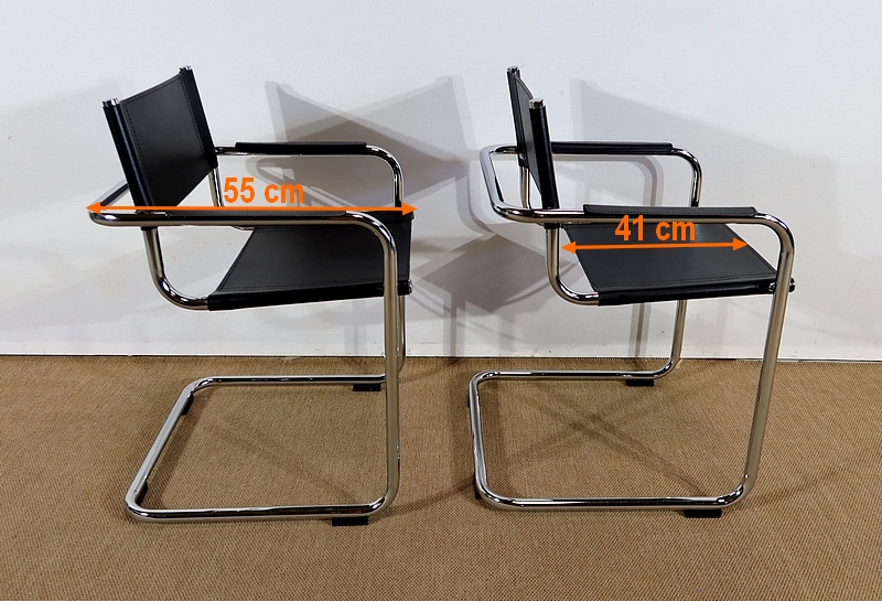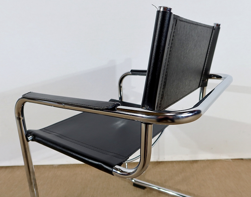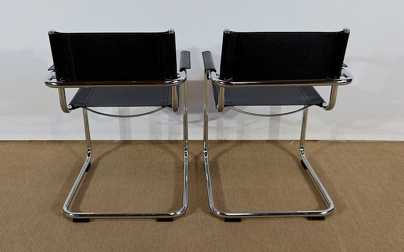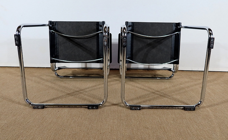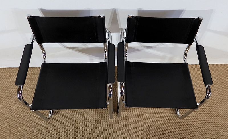 Paire de fauteuils en cuir noir et métal chromé reprenant le modèle B34 de Marcel Breuer édité dans les années 1930.