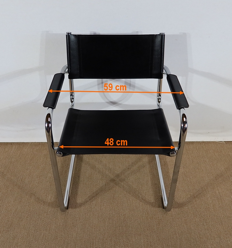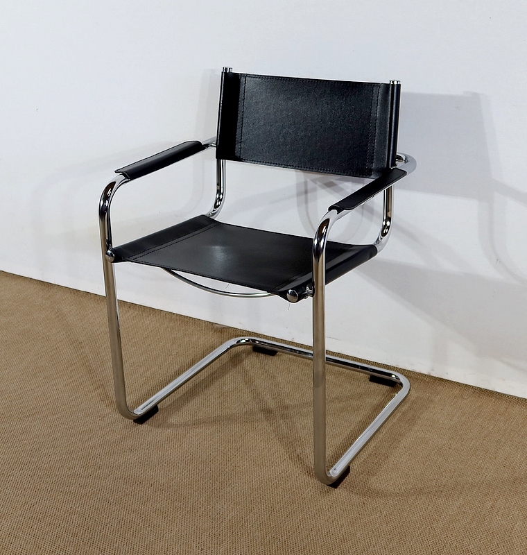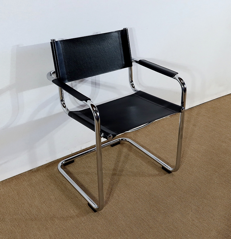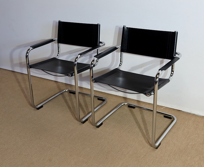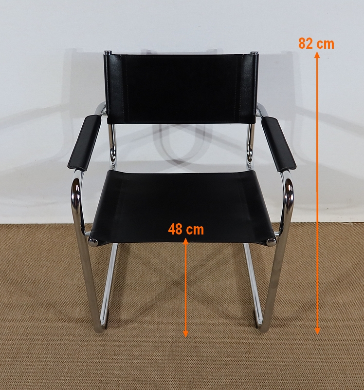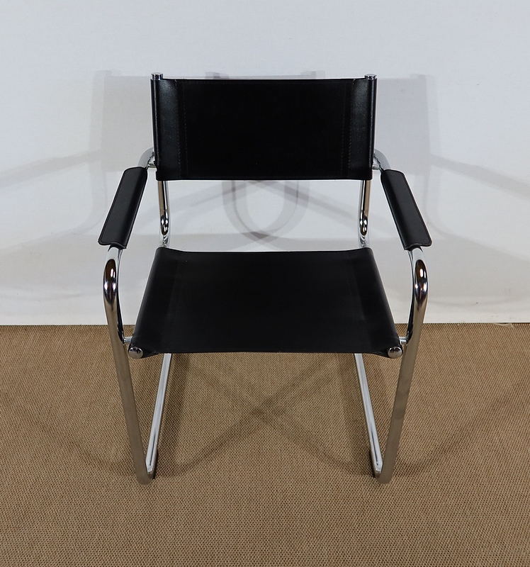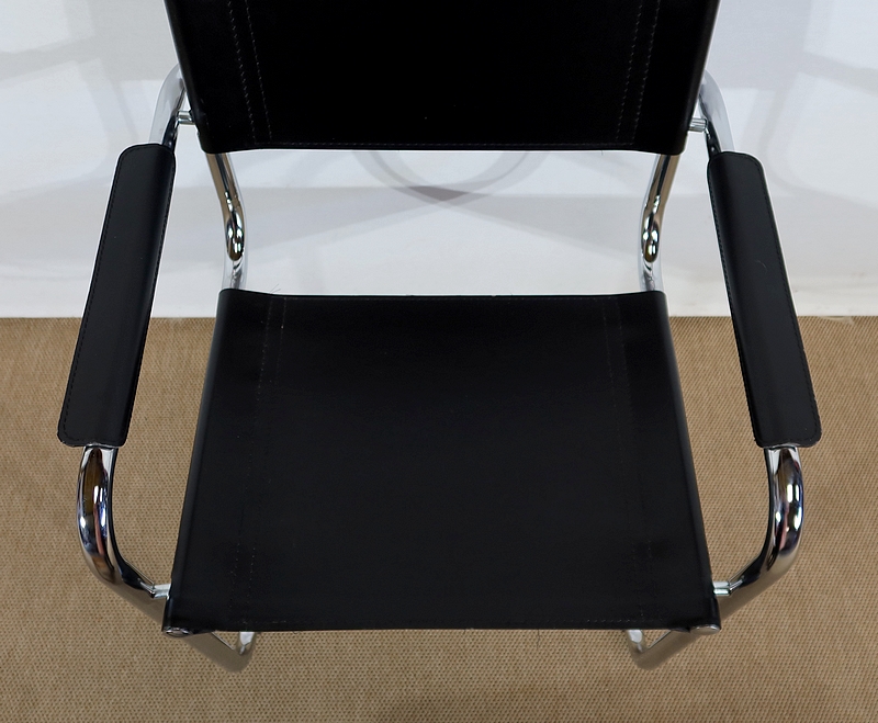 Paire de fauteuils en cuir noir et métal chromé reprenant le modèle B34 de Marcel Breuer édité dans les années 1930.