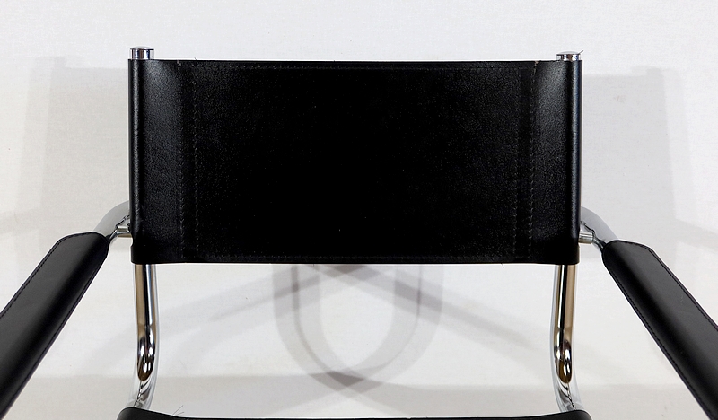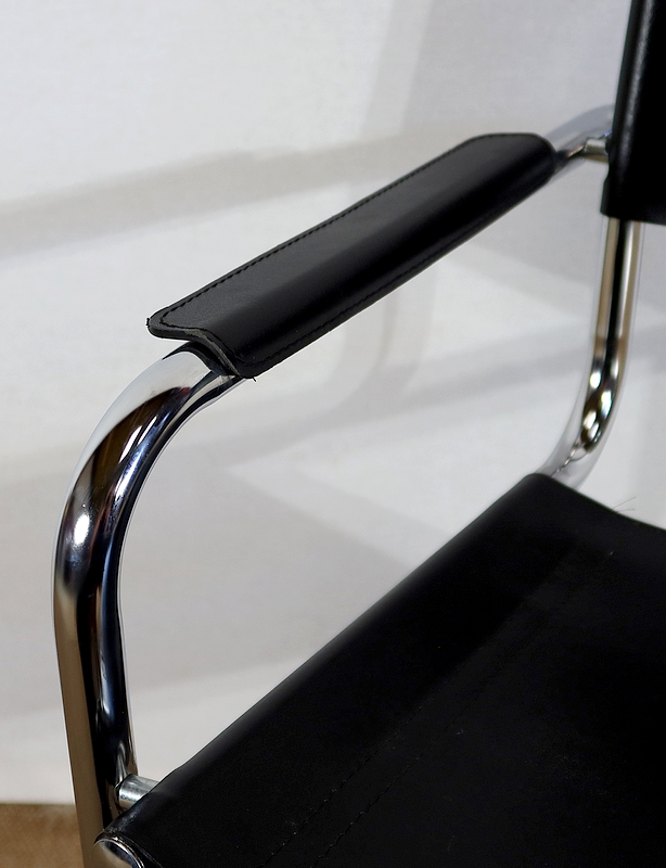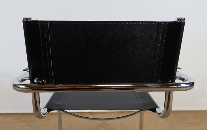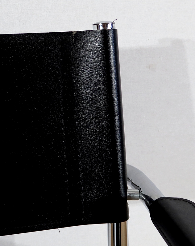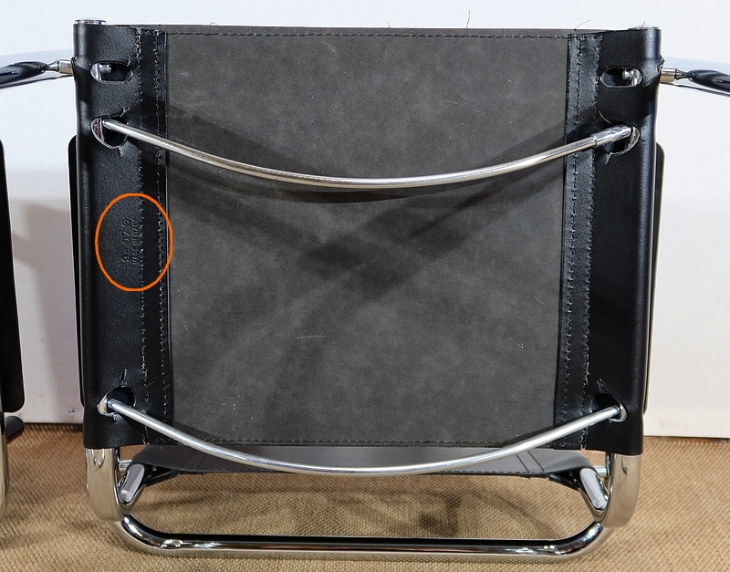 On soulignera la présence sous ces fauteuils de deux arceaux de métal à pas de vis. Ils permettent, de manière simple et rapide, de régler et d’ajuster la tension du cuir et donc la fermeté de l’assise. On notera que cette dernière semble en suspension, de par l’absence de pieds verticaux à l’arrière.