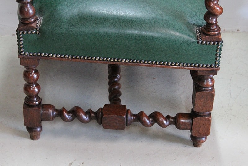 Les dossiers, manchettes et assises refaits à l’ancienne en 2016, sont recouverts d’un cuir vert sapin.