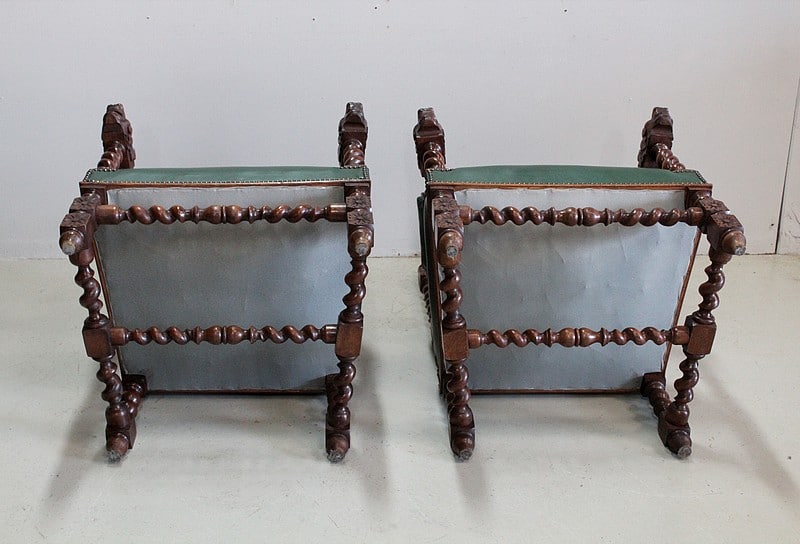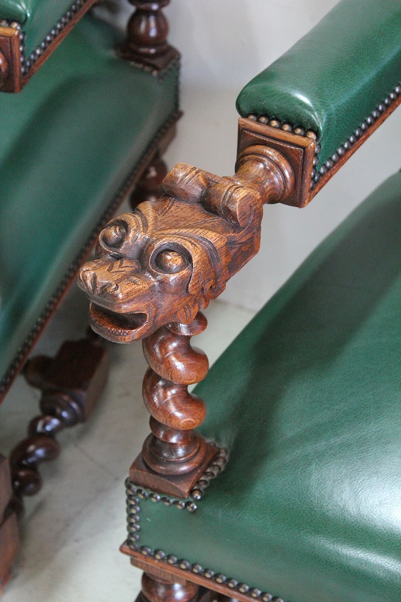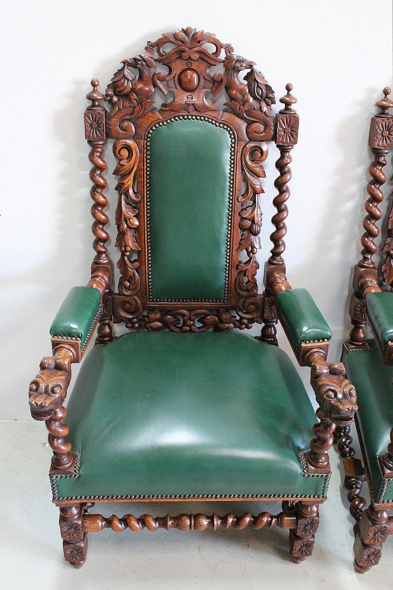 Les dossiers sont sculptés de colonnes torsadées ainsi que de rinceaux, d’un médaillon central et de chimères.