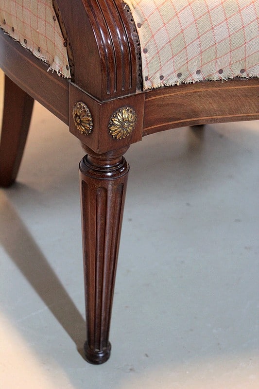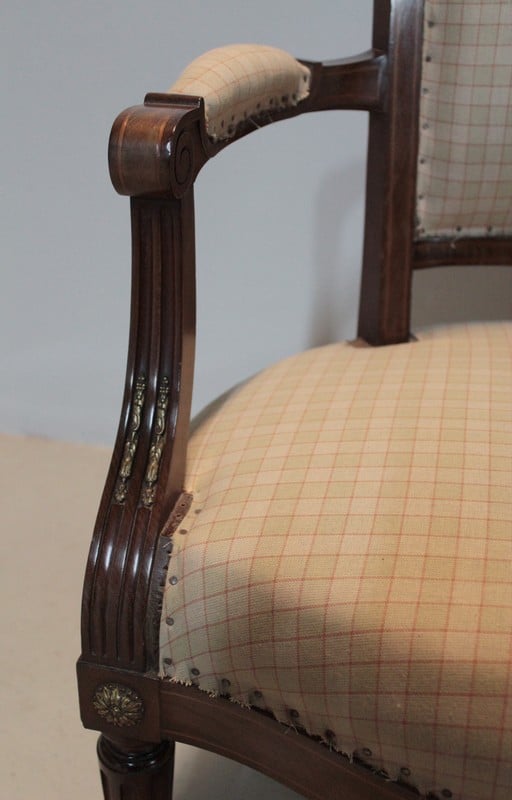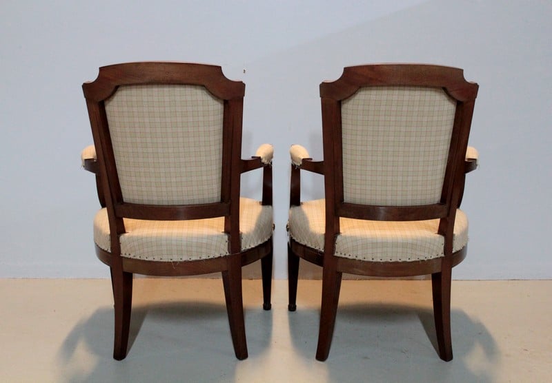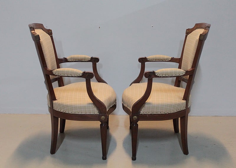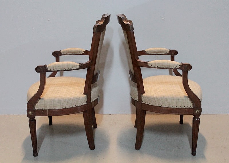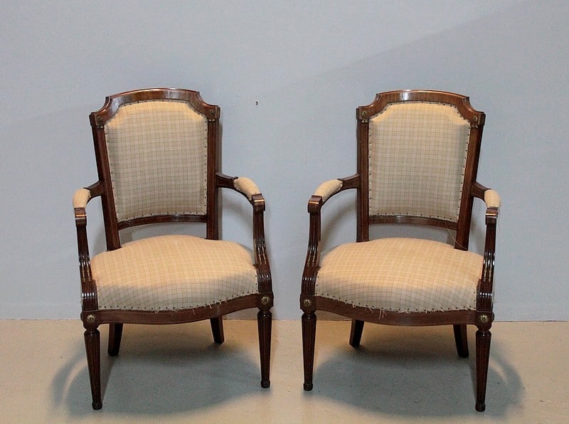 Paire de fauteuils Cabriolets de style Louis XVI en acajou de Cuba massif et placage dans les frises.