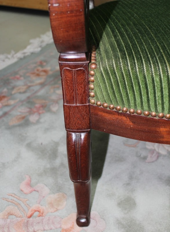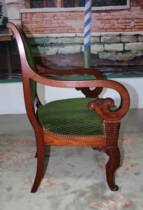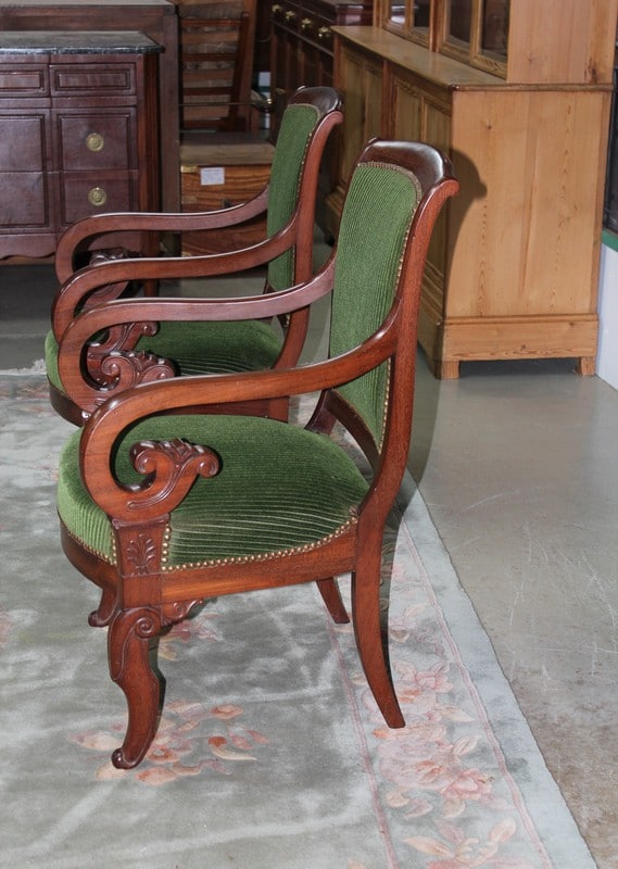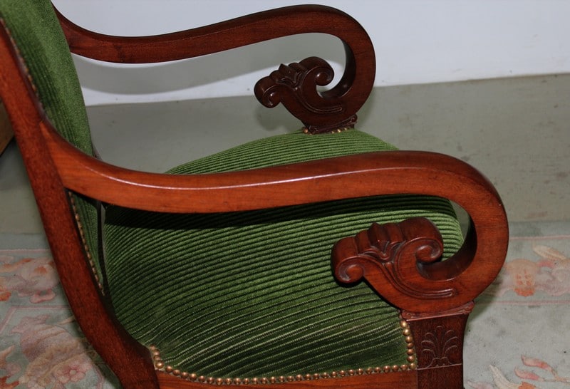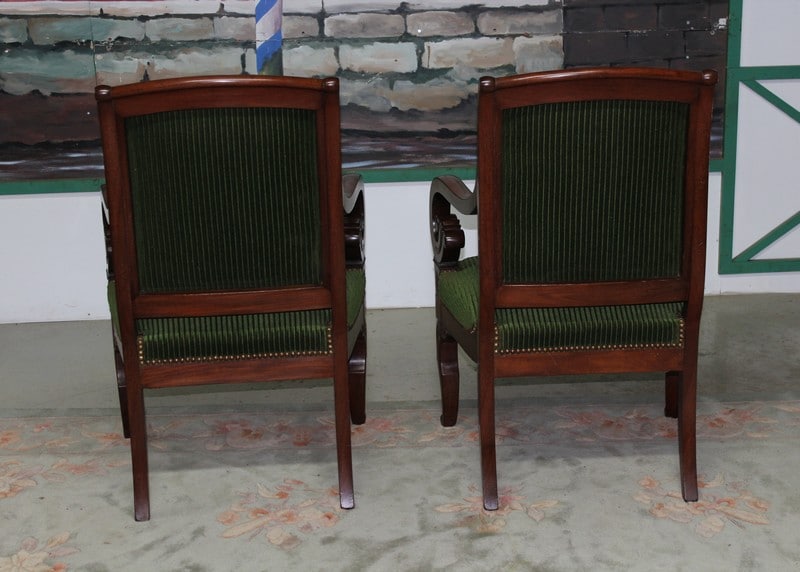 Paire de fauteuils Restauration en acajou de Cuba. Accotoirs en corne d’abondance. Pieds antérieurs en jarret.