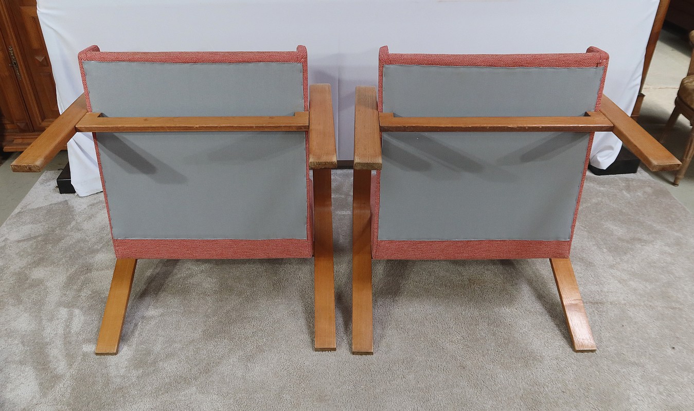 Ces fauteuils de style sont recouverts d’un tissu chiné de couleur rosé. Chaque siège est doté d’une assise confortable. Muni d’un dossier et d’un coussin rembourré, chaque fauteuil bénéficie d’un tissu d’appuie-tête.