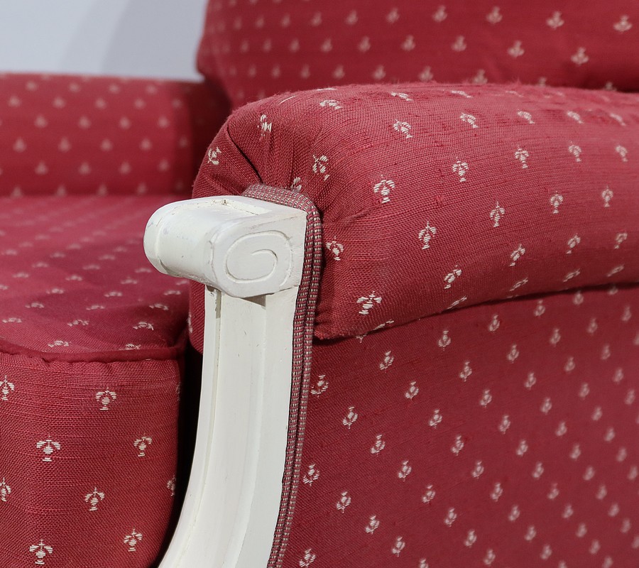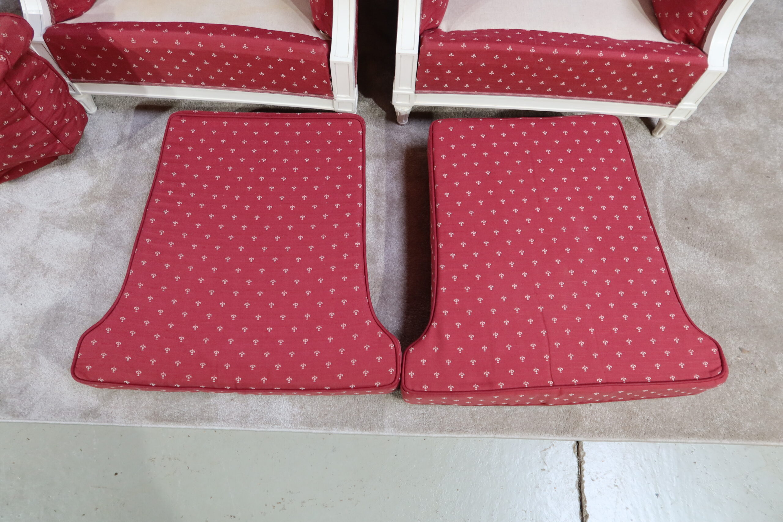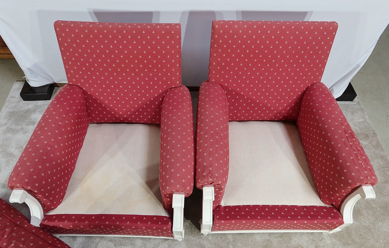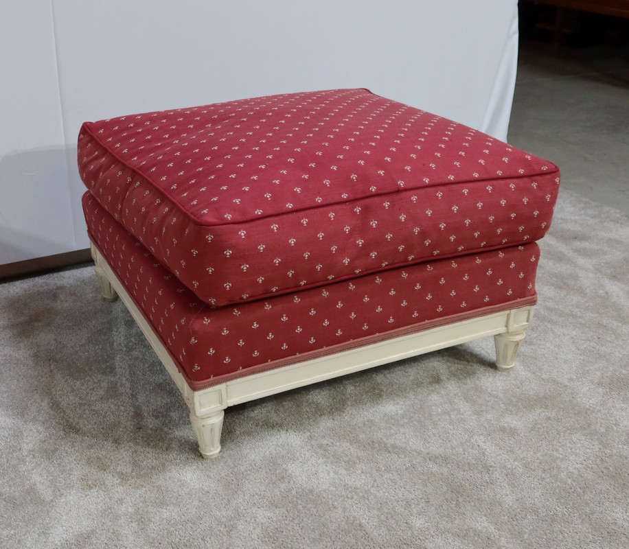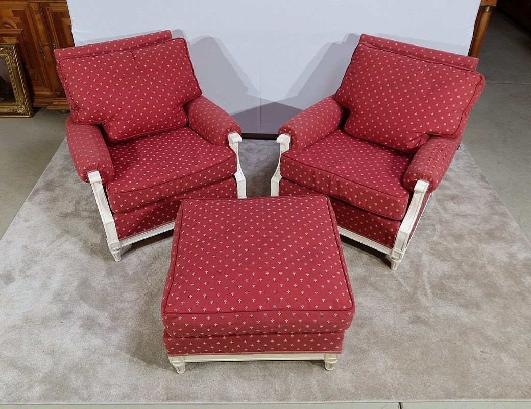 Charmants fauteuils accompagnés d’un ottoman assorti, dotés d’une ossature en hêtre teinté crème et d’un tissu framboise décoré de fleurettes stylisées. Ce tissu est en état d’usage.