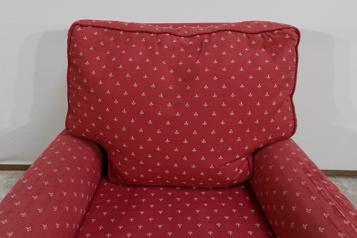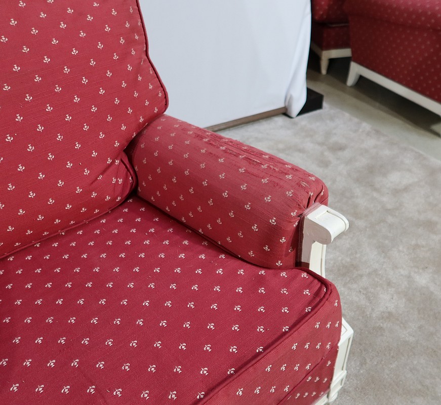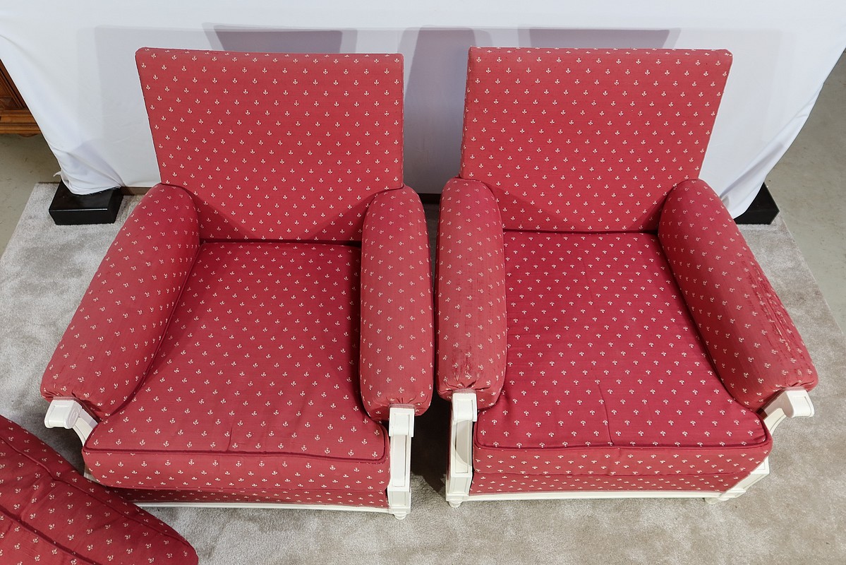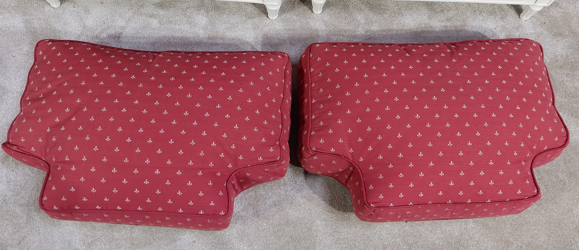 Charmants fauteuils accompagnés d’un ottoman assorti, dotés d’une ossature en hêtre teinté crème et d’un tissu framboise décoré de fleurettes stylisées. Ce tissu est en état d’usage.