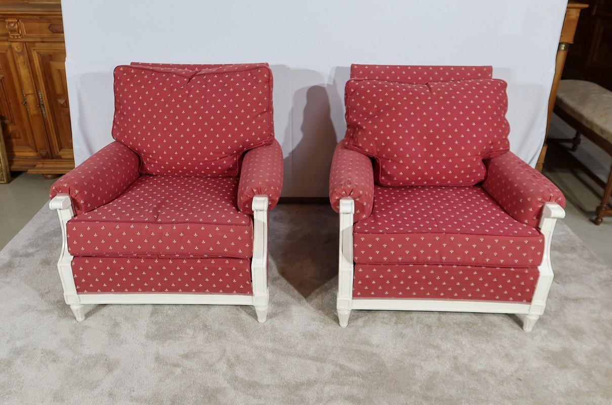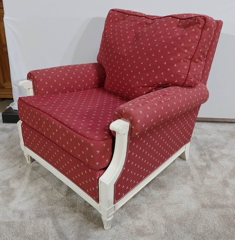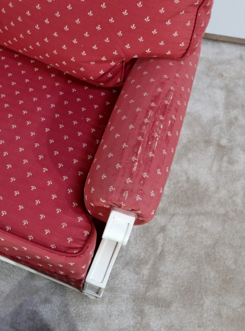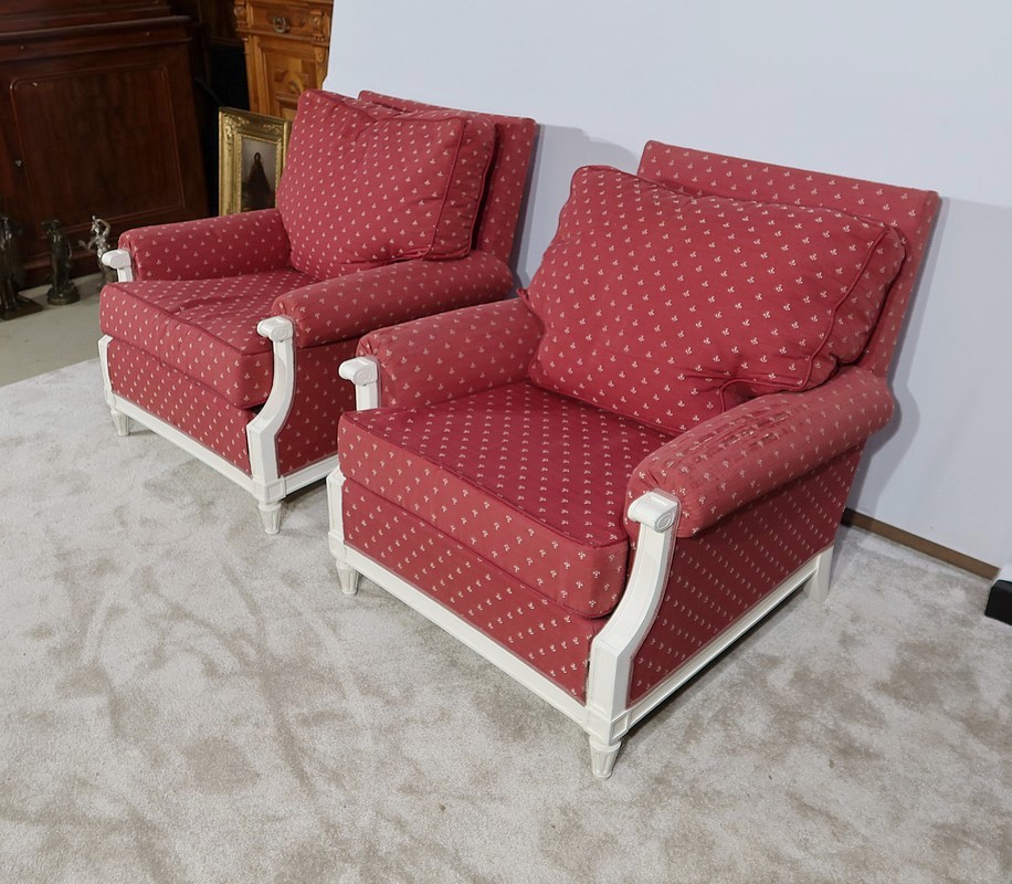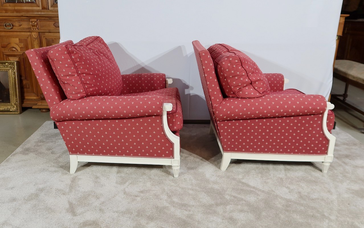 Charmants fauteuils accompagnés d’un ottoman assorti, dotés d’une ossature en hêtre teinté crème et d’un tissu framboise décoré de fleurettes stylisées. Ce tissu est en état d’usage.