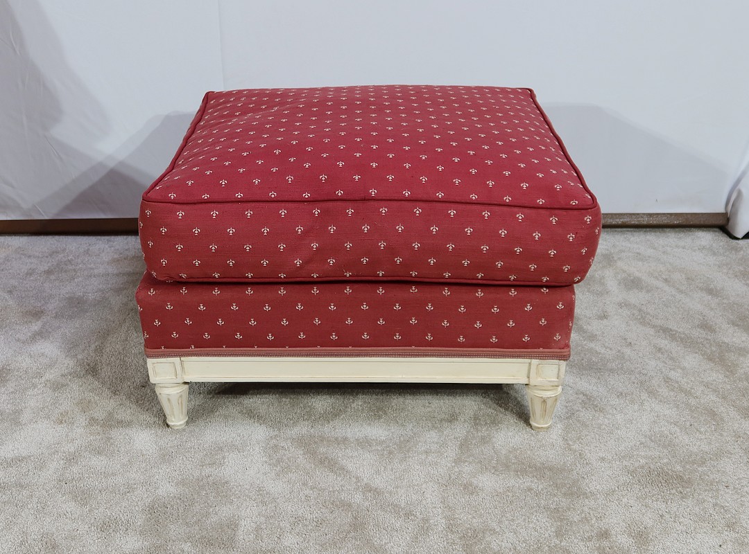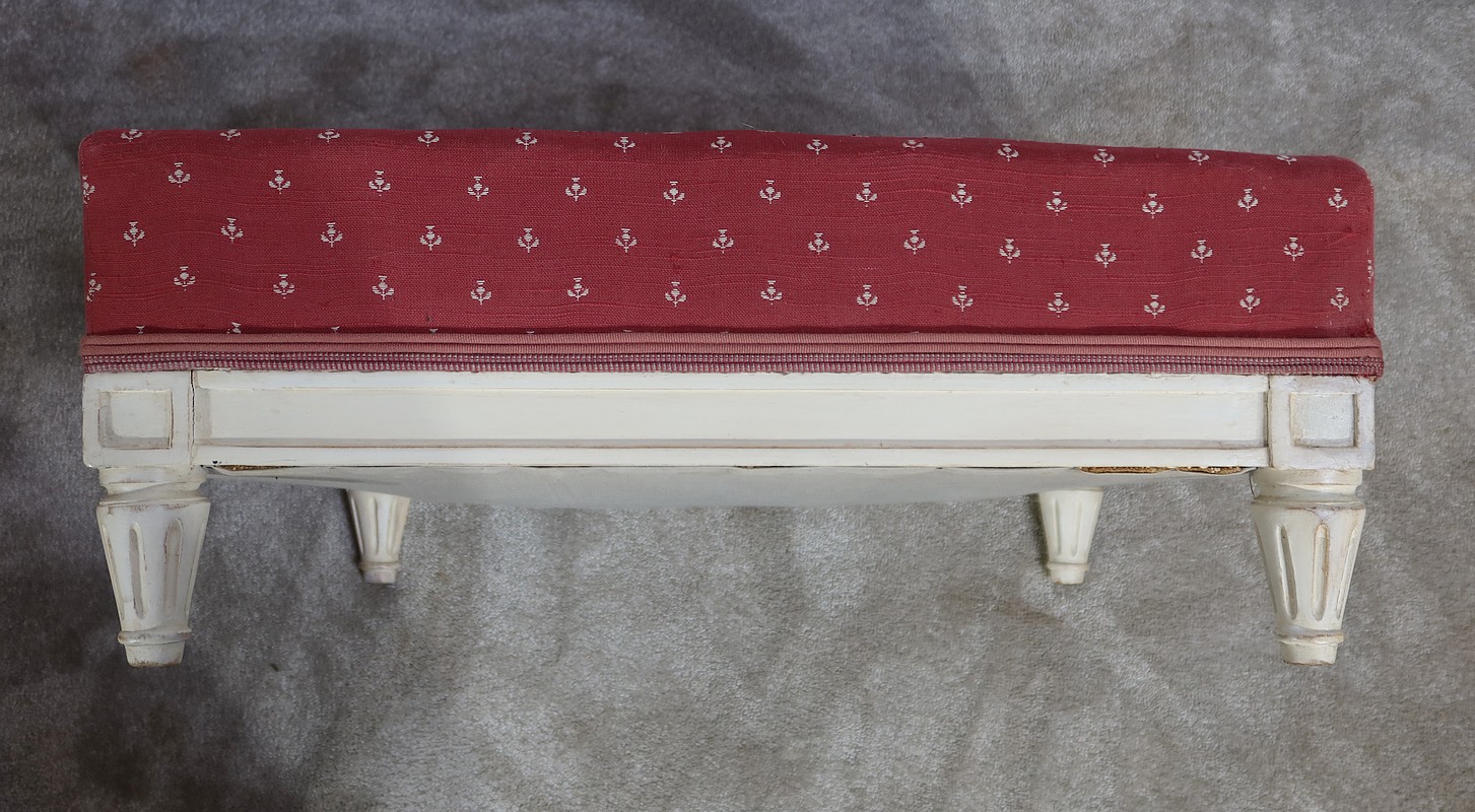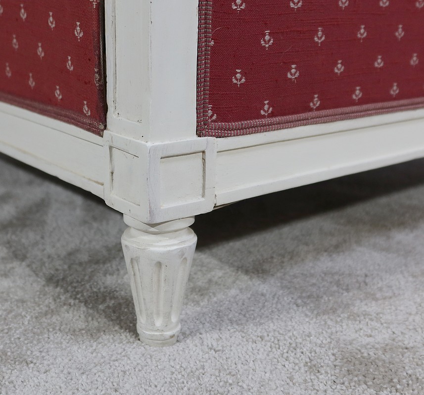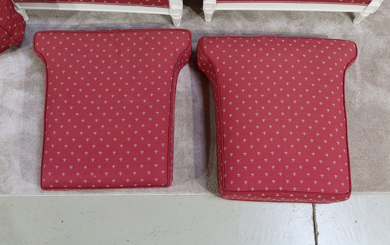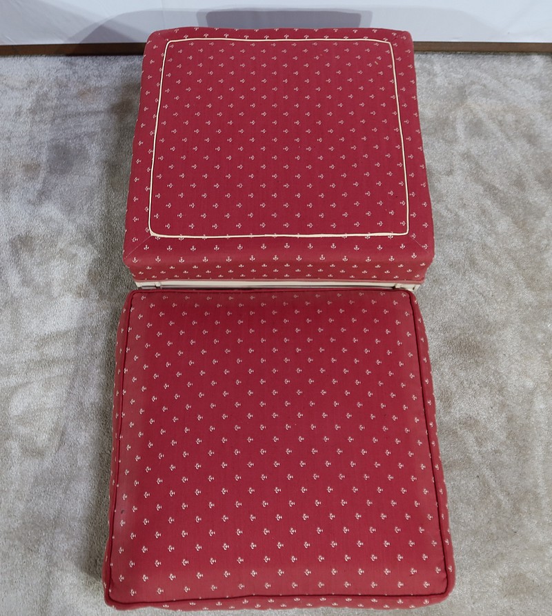 Ces assises reposent sur des pieds toupie Louis XVI à cannelures. Ces sièges solides se complètent d’un large ottoman.