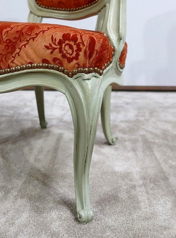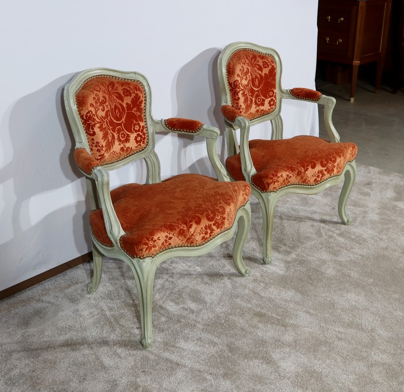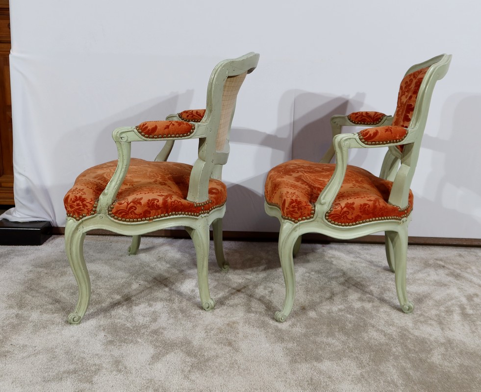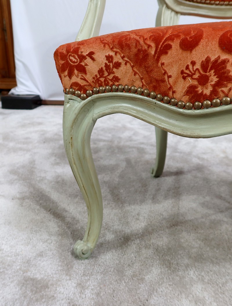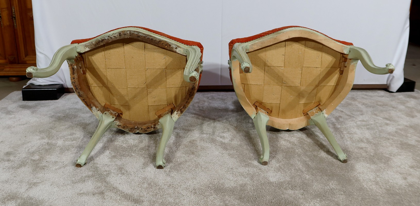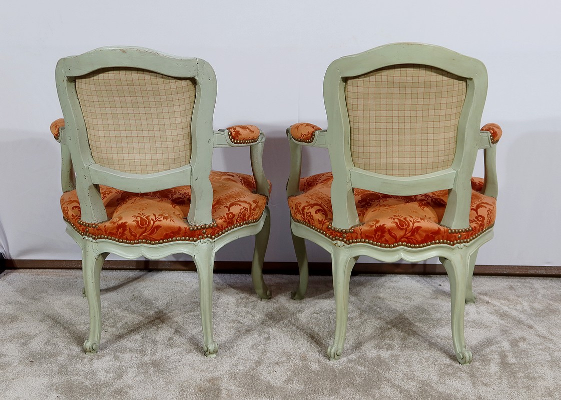 Paire de fauteuils cabriolets, dotés d’une large assise et d’un dossier étroit dans le pur style Louis XV. Les dossiers, assises, accotoirs sont moulurés et les pieds cambrés. Cette structure est peinte d’un vert pastel.