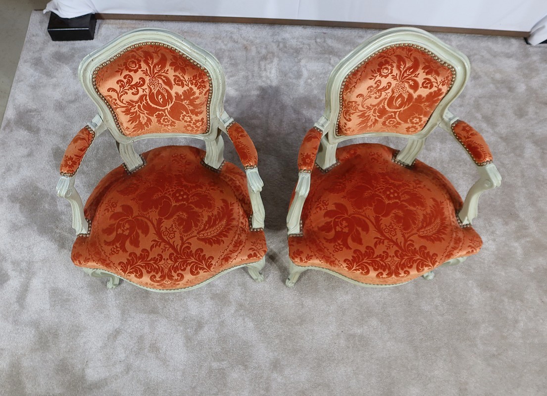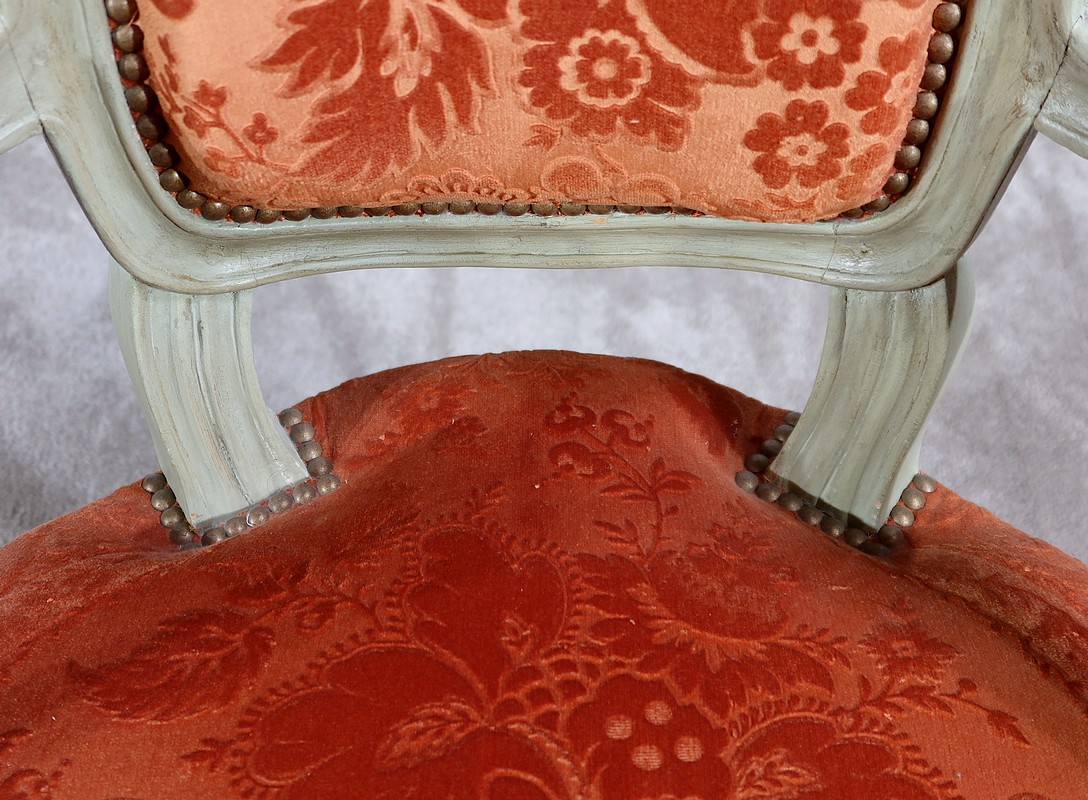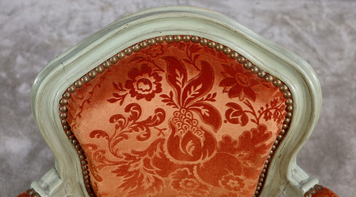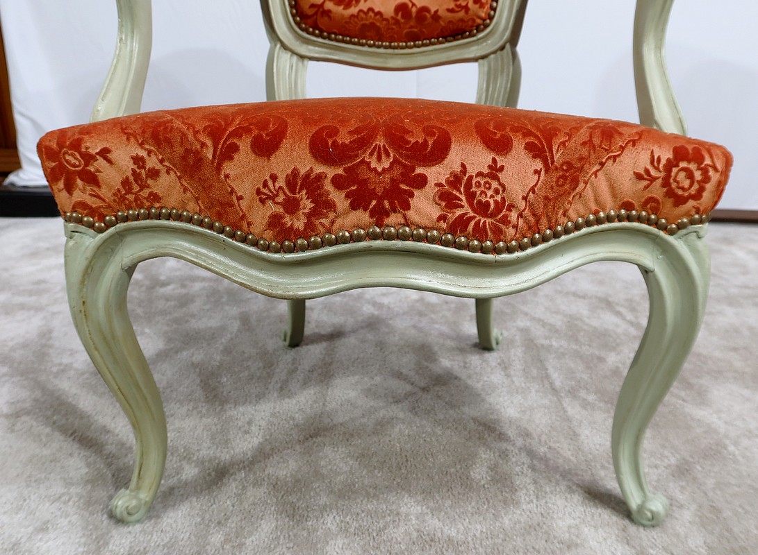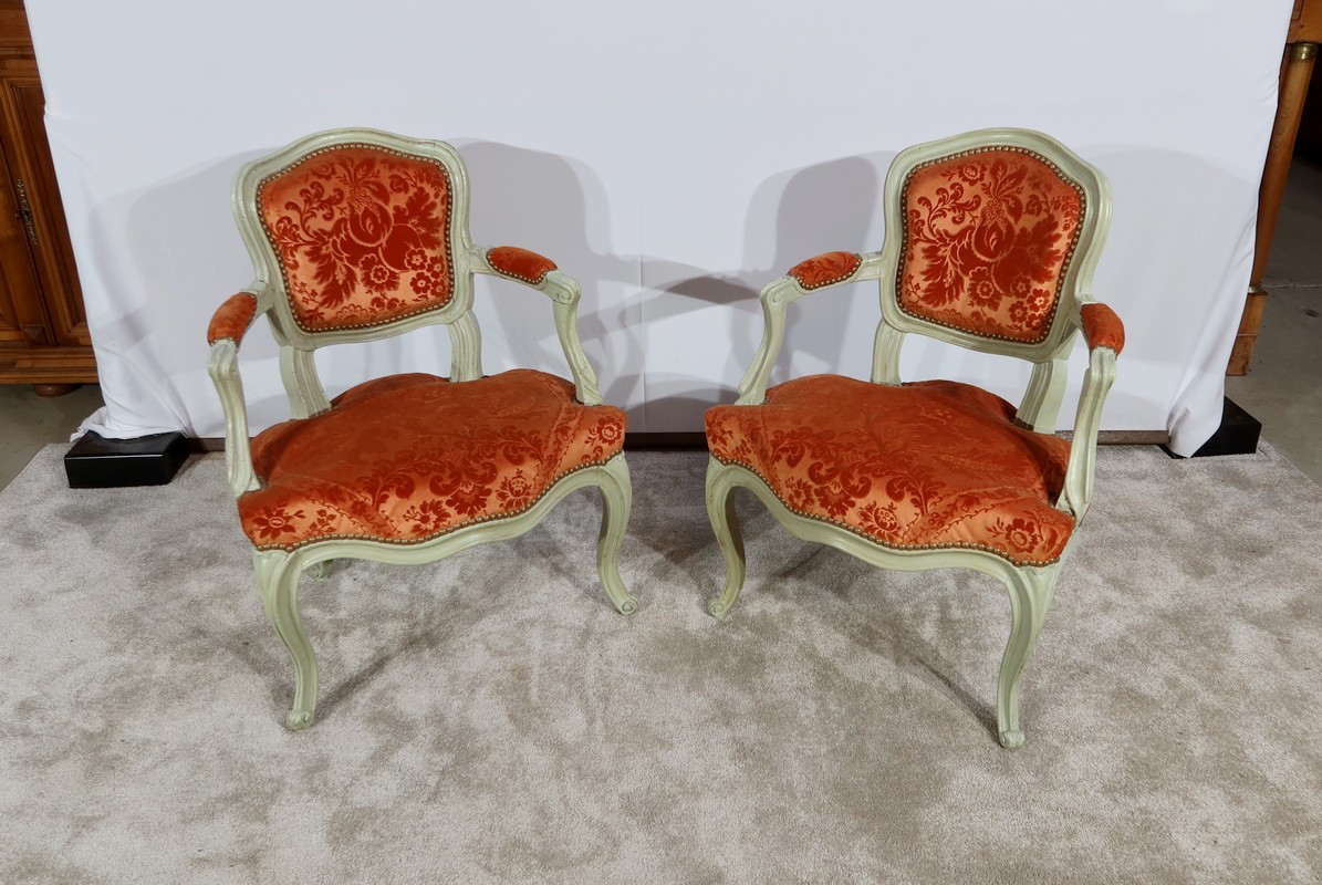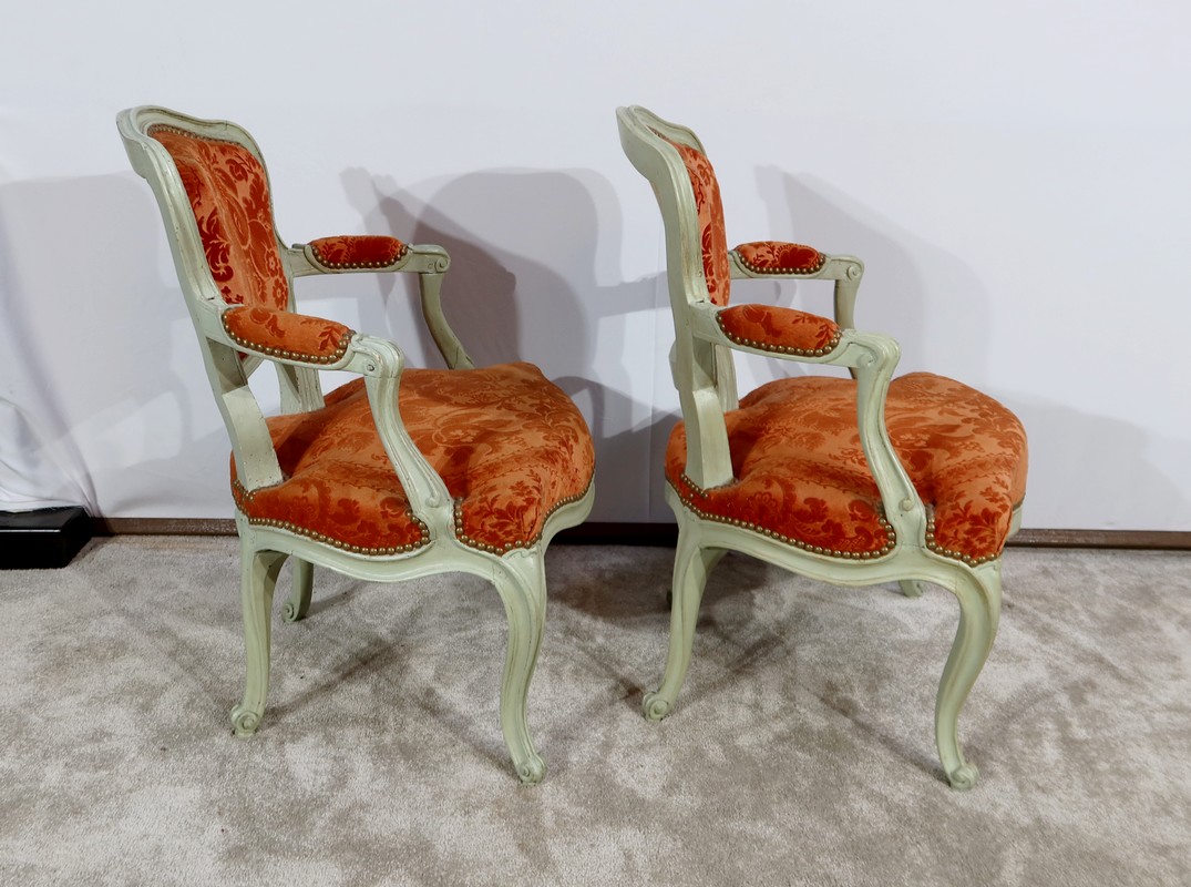 Paire de fauteuils cabriolets, dotés d’une large assise et d’un dossier étroit dans le pur style Louis XV. Les dossiers, assises, accotoirs sont moulurés et les pieds cambrés. Cette structure est peinte d’un vert pastel.
