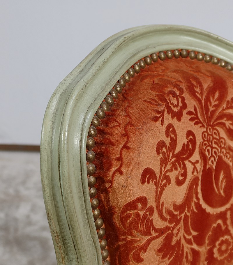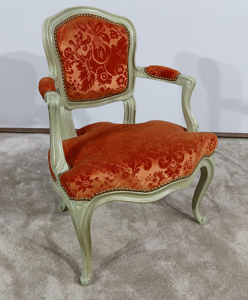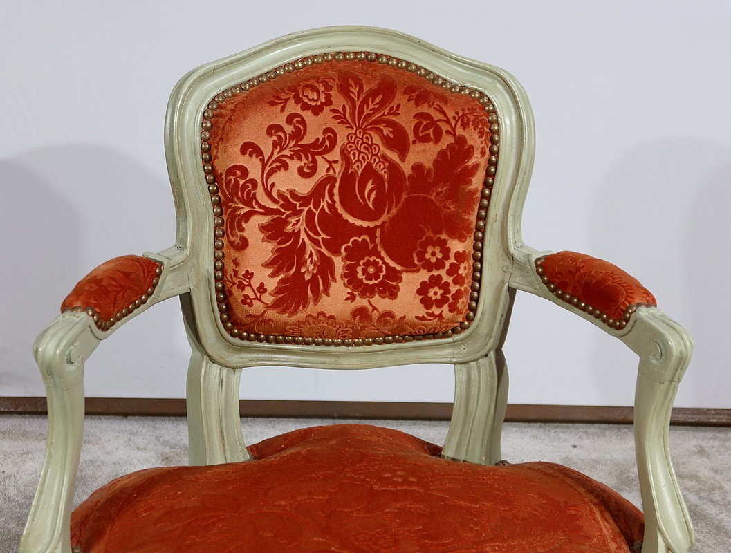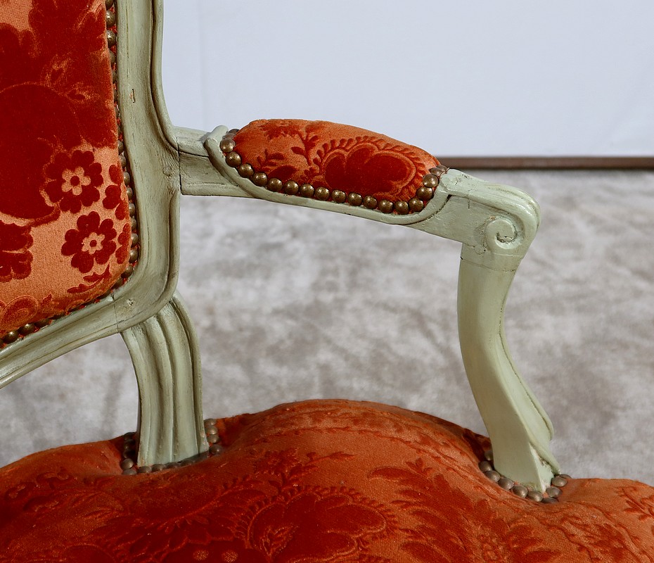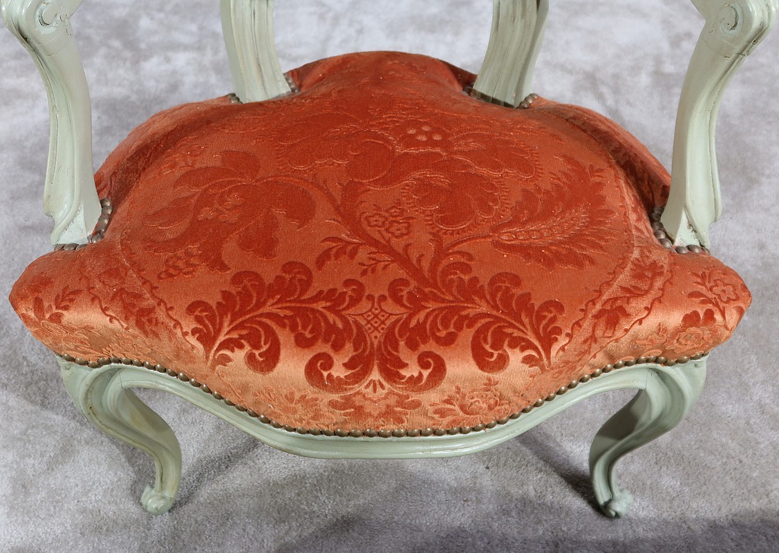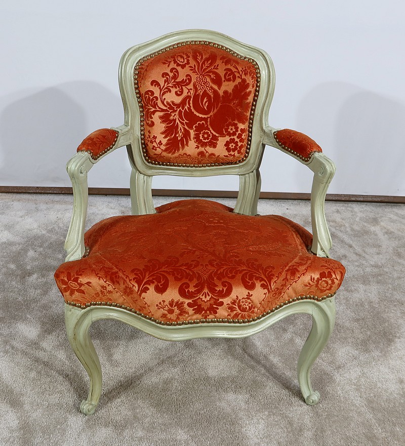 Paire de fauteuils cabriolets, dotés d’une large assise et d’un dossier étroit dans le pur style Louis XV. Les dossiers, assises, accotoirs sont moulurés et les pieds cambrés. Cette structure est peinte d’un vert pastel.
