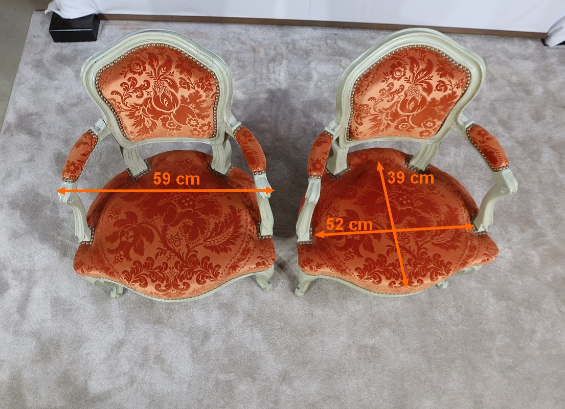 Par ailleurs, ces sièges sont garnis d’un tissu de velours orange, en relief, et d’une assise refaite, traditionnelle, avec sangles, pelotes et crin.