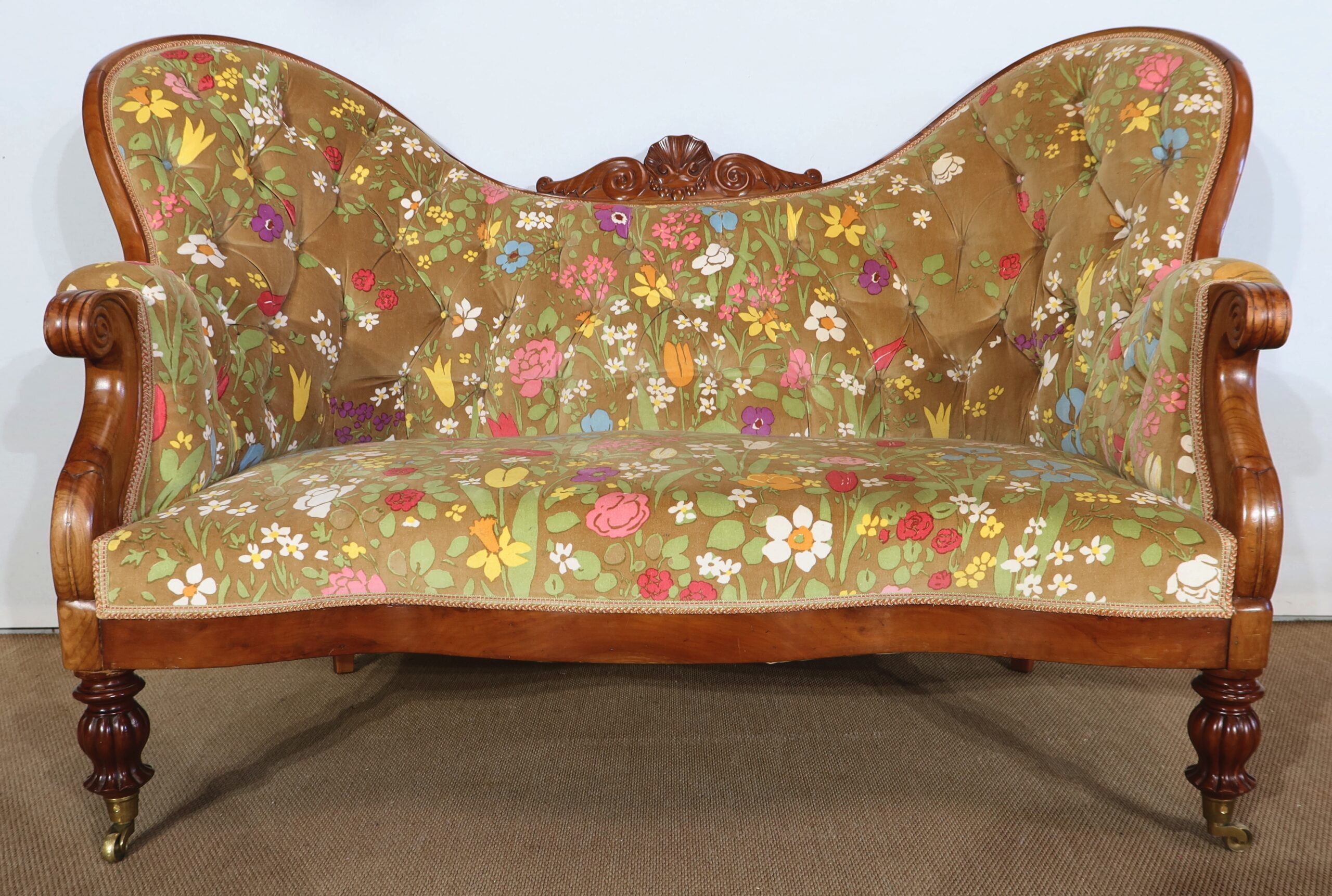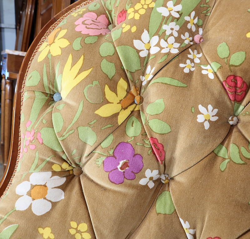 Un tissu printanier multicolore en parfait état recouvre ce canapé harmonieux.