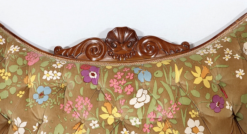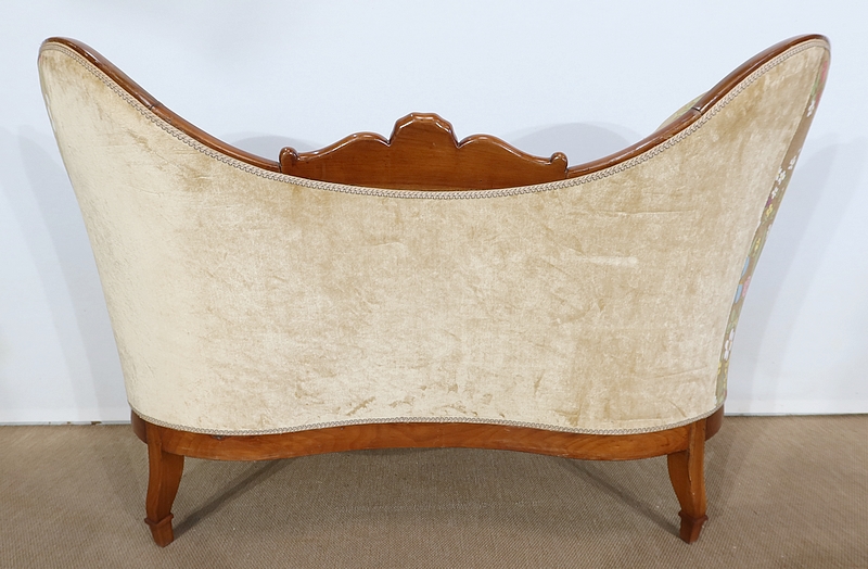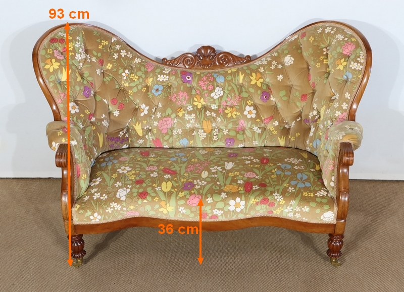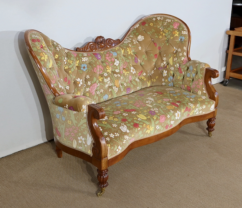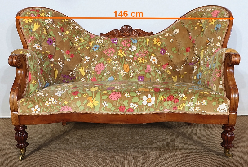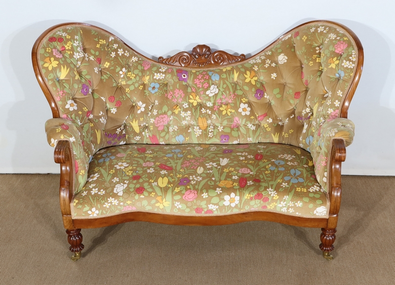 Charmant canapé en merisier aux formes courbes doté d’un large dossier capitonné présentant deux oreilles latérales prononcées. La partie centrale est creusée, en bois sculpté, formant une coquille accompagnée de volutes.