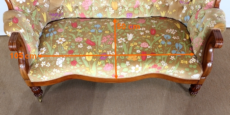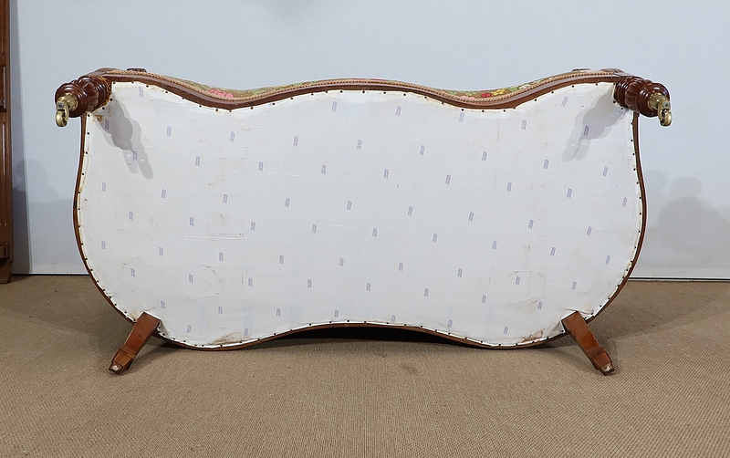 En façade, une ceinture à mouvement concave repose sur des pieds tournés, godronnés et sur roulettes. A l’arrière, des pieds sabres soutiennent ce canapé.
