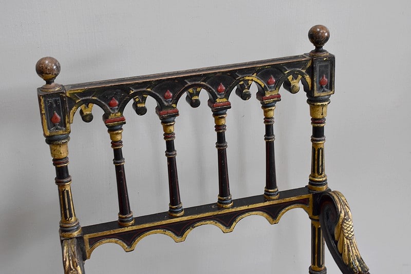 Son dossier est sculpté et ajouré par de petites colonnes, surmonté d’une sphère à chaque bout.