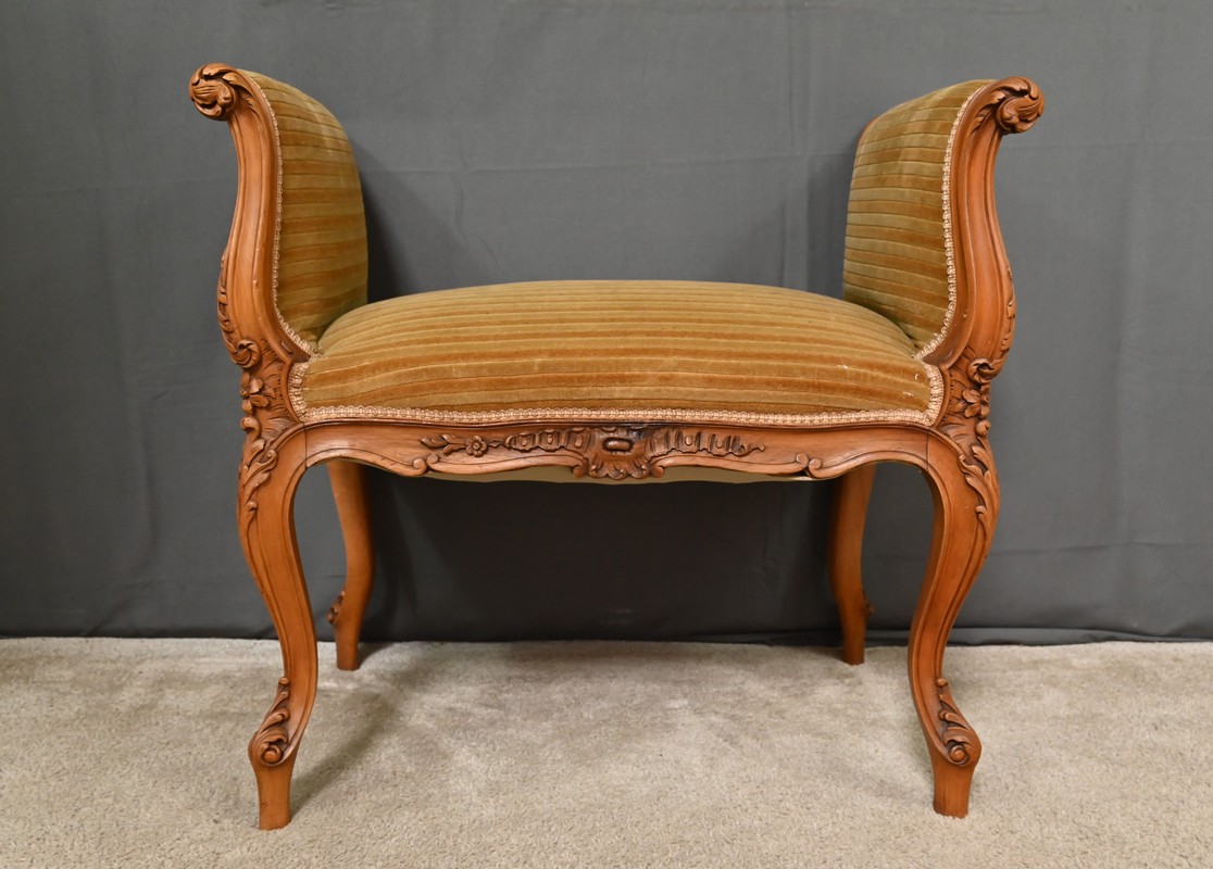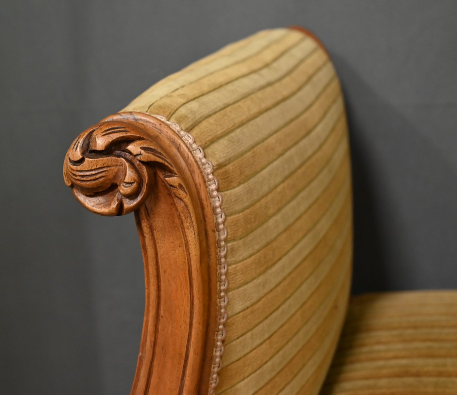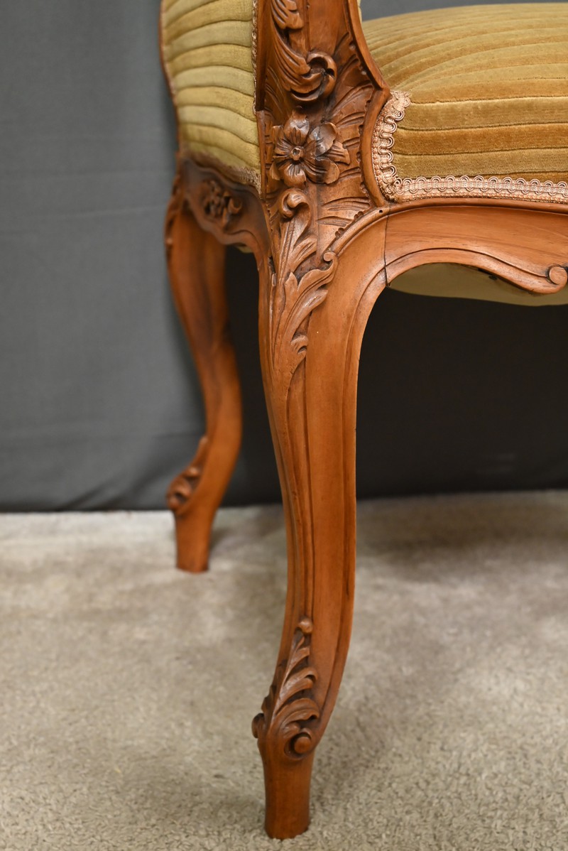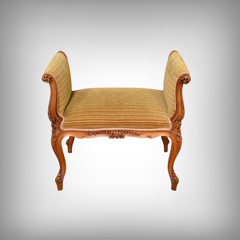 Élégante et raffinée, cette petite banquette une place à accotoirs, en acajou blond, incarne le charme intemporel du style Louis XV.