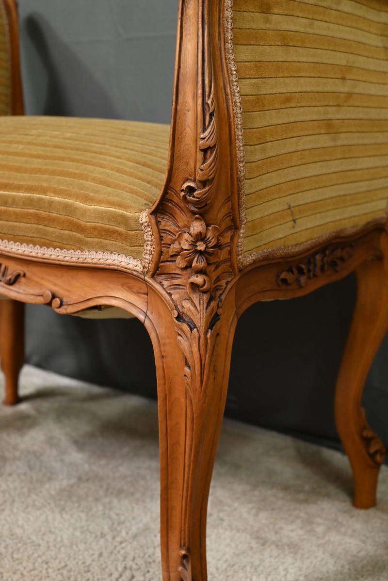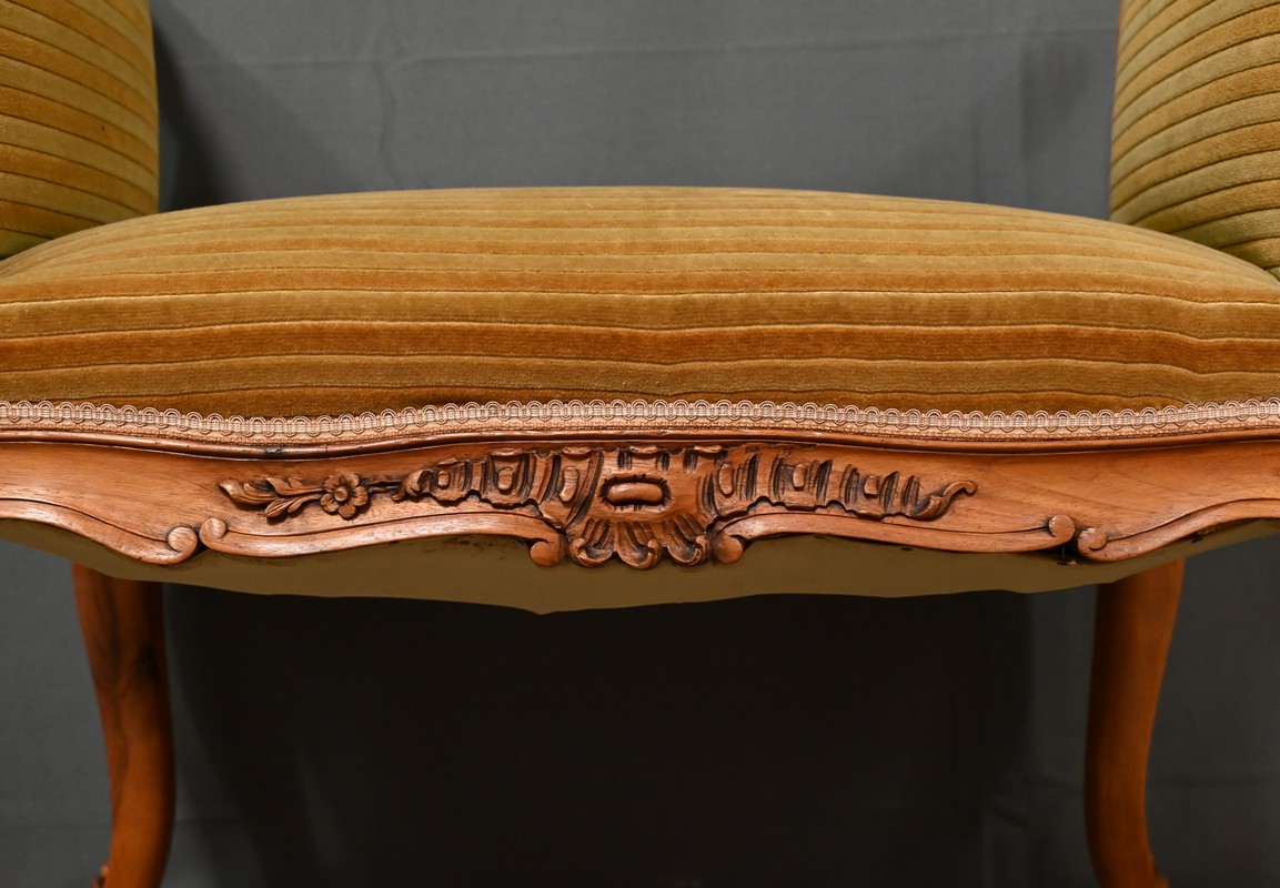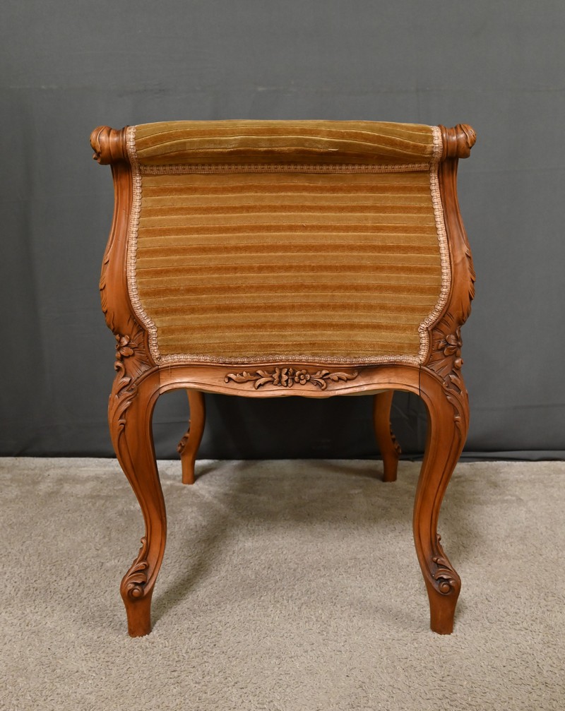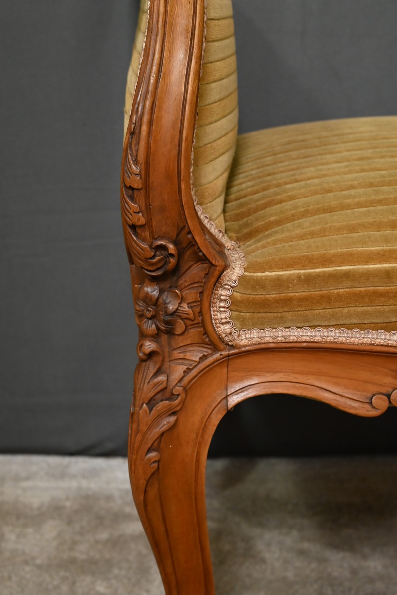Élégante et raffinée, cette petite banquette une place à accotoirs, en acajou blond, incarne le charme intemporel du style Louis XV.