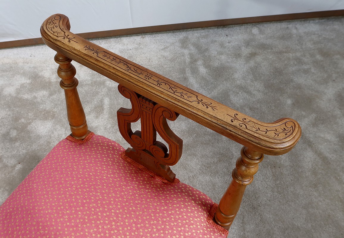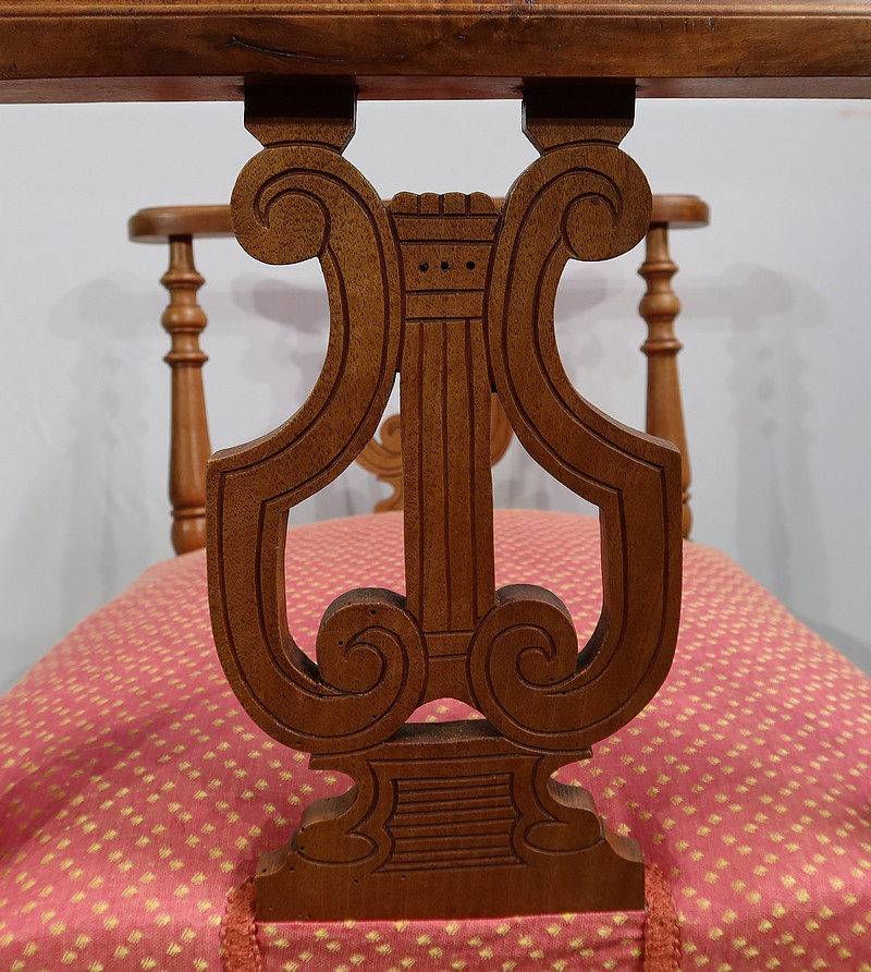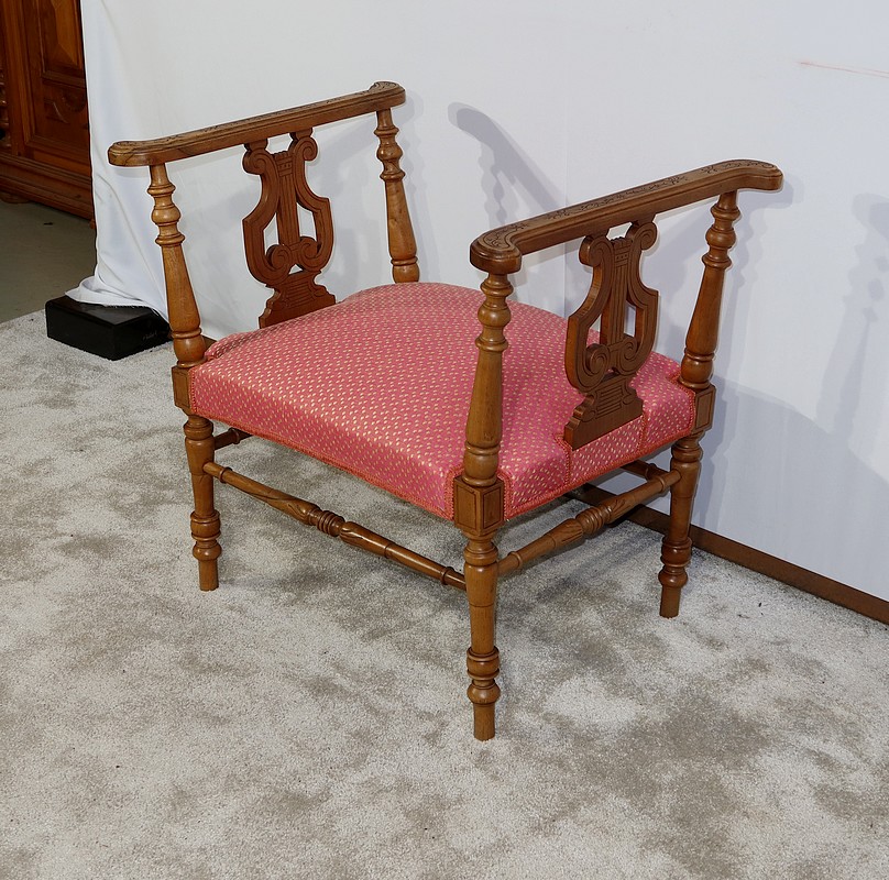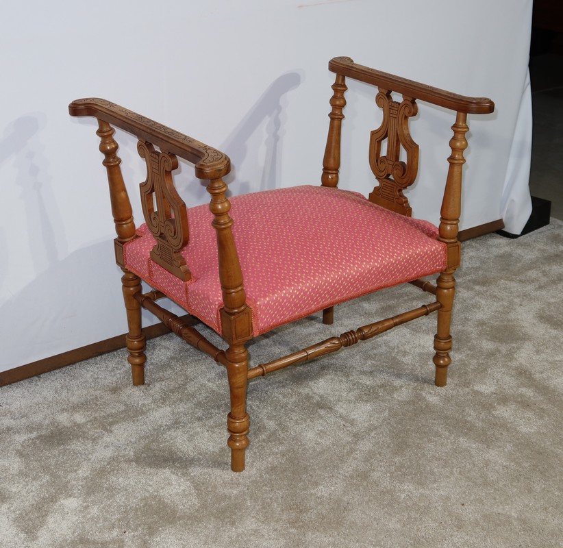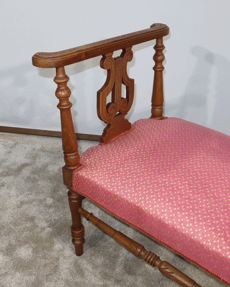 Charmante banquette en noyer massif aux lignes raffinées, possédant des accotoirs ajourés, composés sur le dessus d’un élément de bois sculpté de motifs floraux et recourbé aux extrémités. Ces accotoirs sont agrémentés d’une importante lyre décorative élégamment gravée. Ils reposent sur quatre pieds tournés reliés en partie basse par des barreaux tournés bénéficiant d’une sculpture fantaisie au centre.