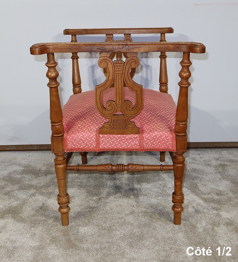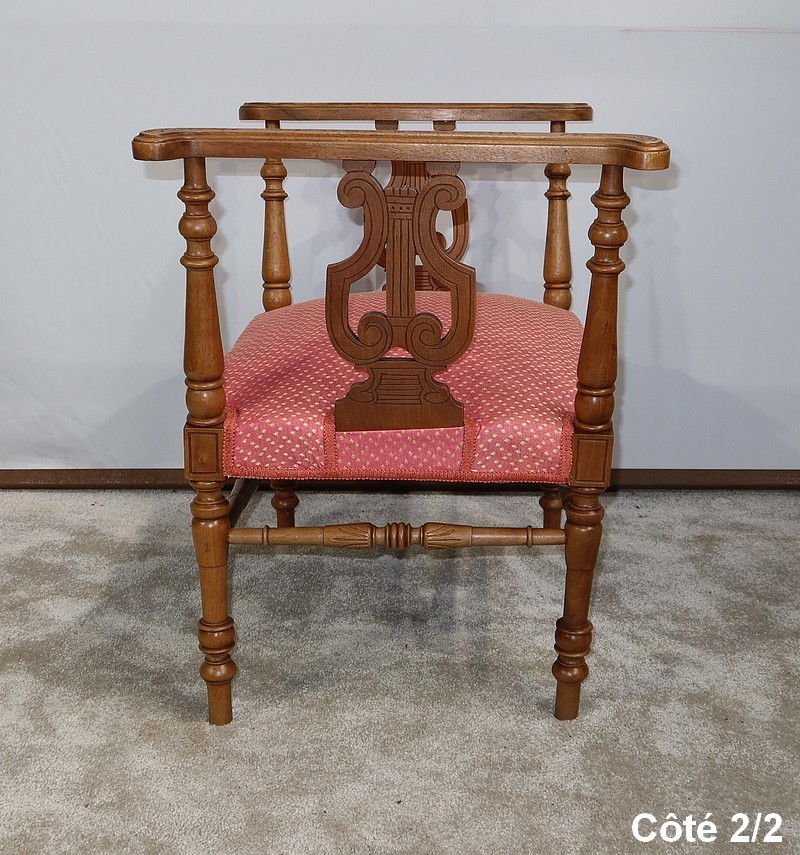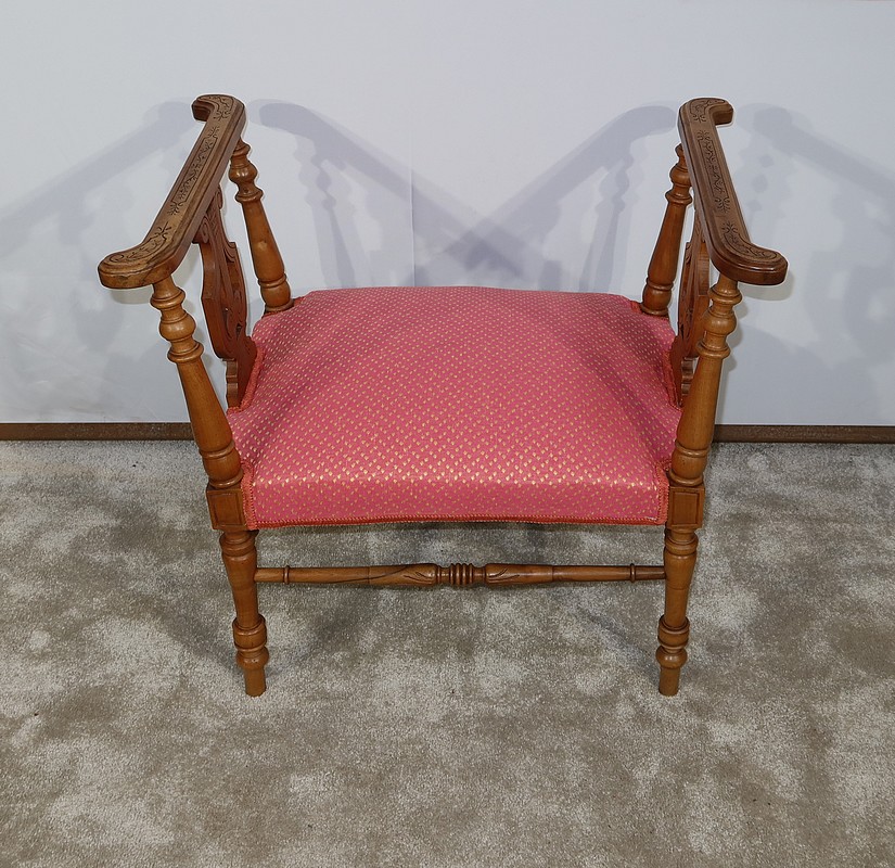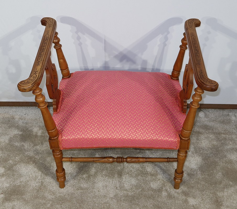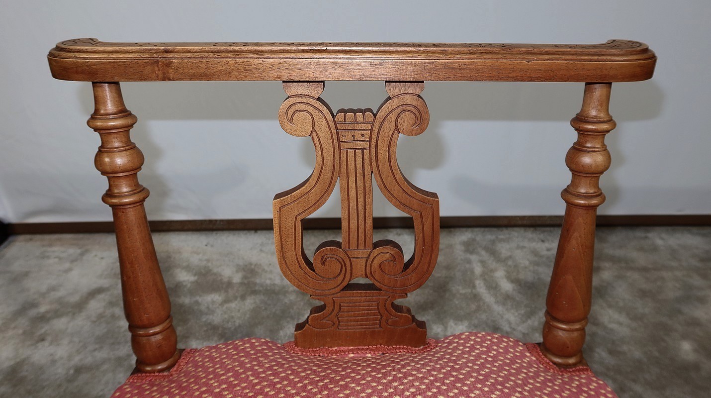 Charmante banquette en noyer massif aux lignes raffinées, possédant des accotoirs ajourés, composés sur le dessus d’un élément de bois sculpté de motifs floraux et recourbé aux extrémités. Ces accotoirs sont agrémentés d’une importante lyre décorative élégamment gravée. Ils reposent sur quatre pieds tournés reliés en partie basse par des barreaux tournés bénéficiant d’une sculpture fantaisie au centre.