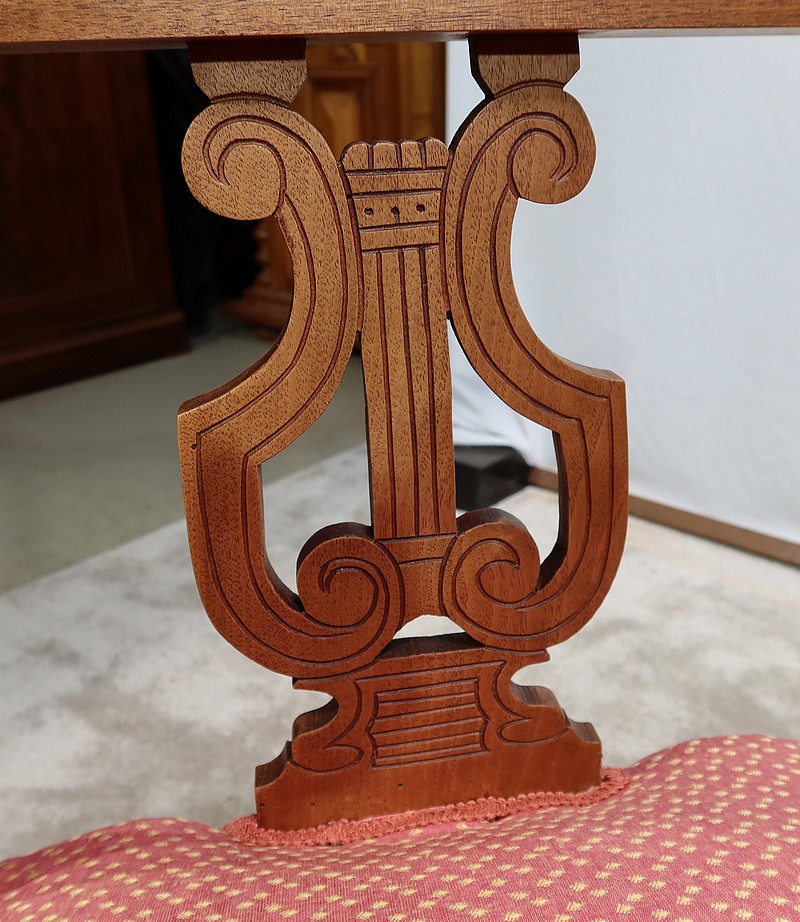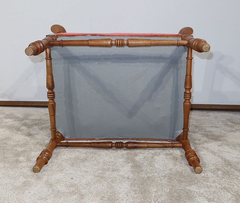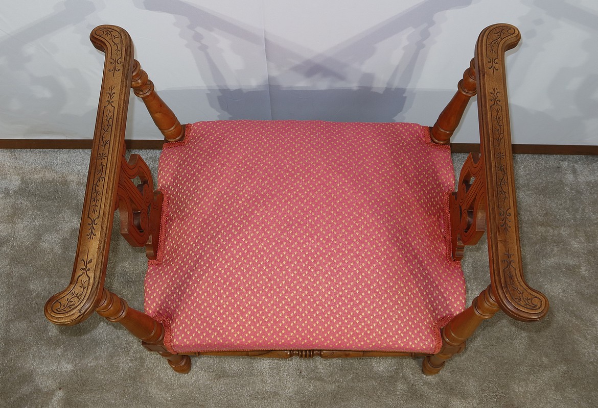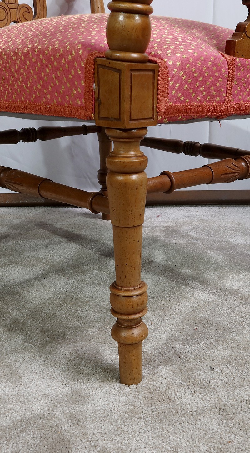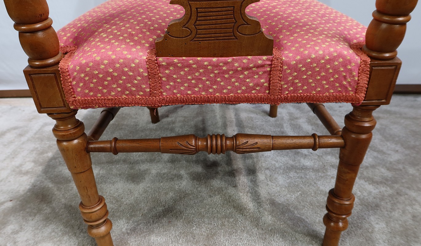 Ce siège est muni d’une assise traditionnelle récente habillée d’un beau tissu rose, décoré de motifs jaunes pâles.