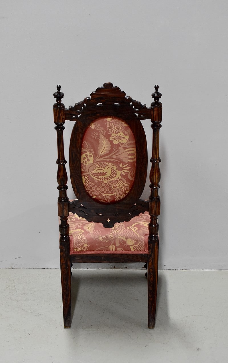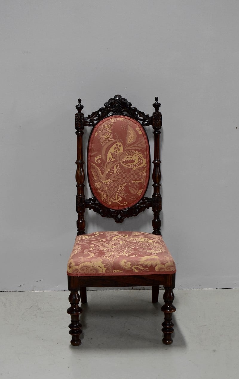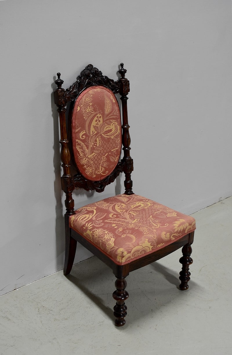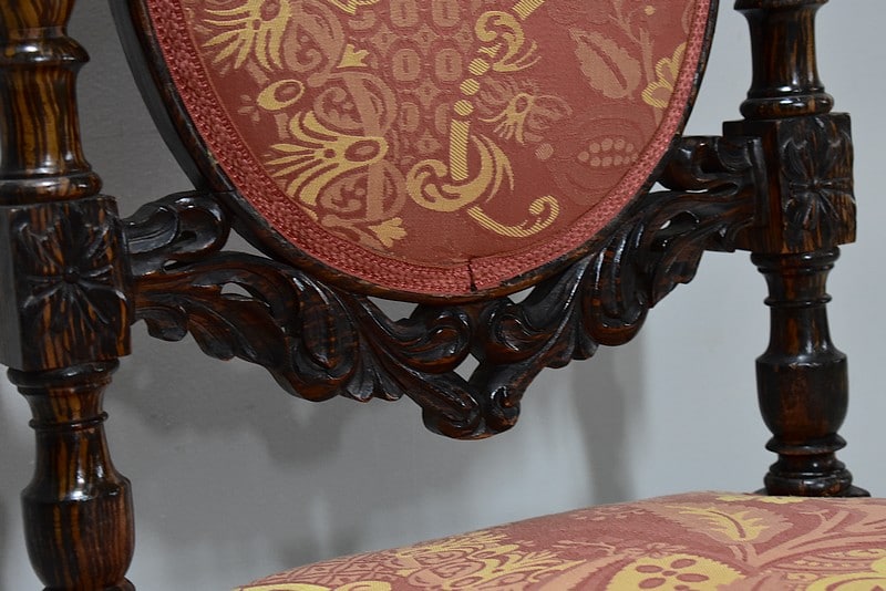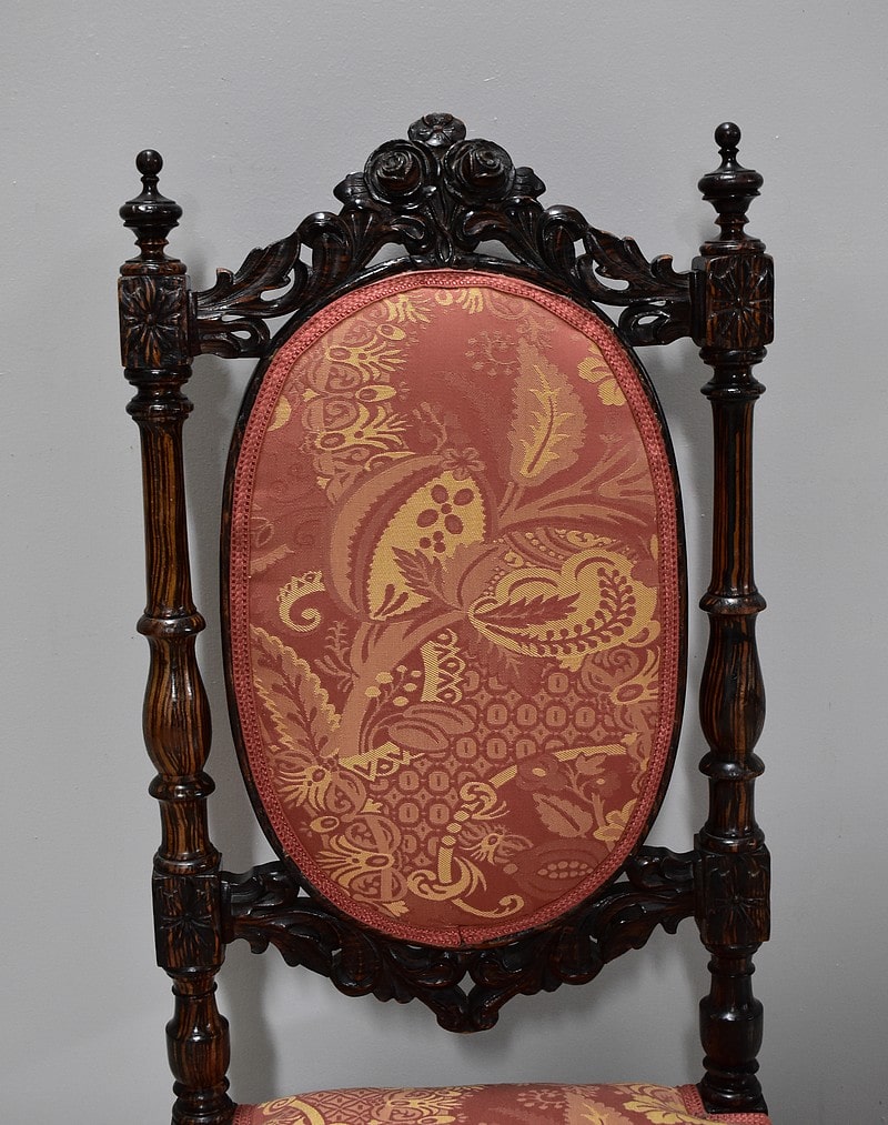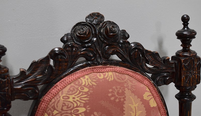 Le dossier en médaillon est encadré de colonnes tournées et sculptées, surmonté d’un décor de roses découpées et sculptées entourées de rinceaux.