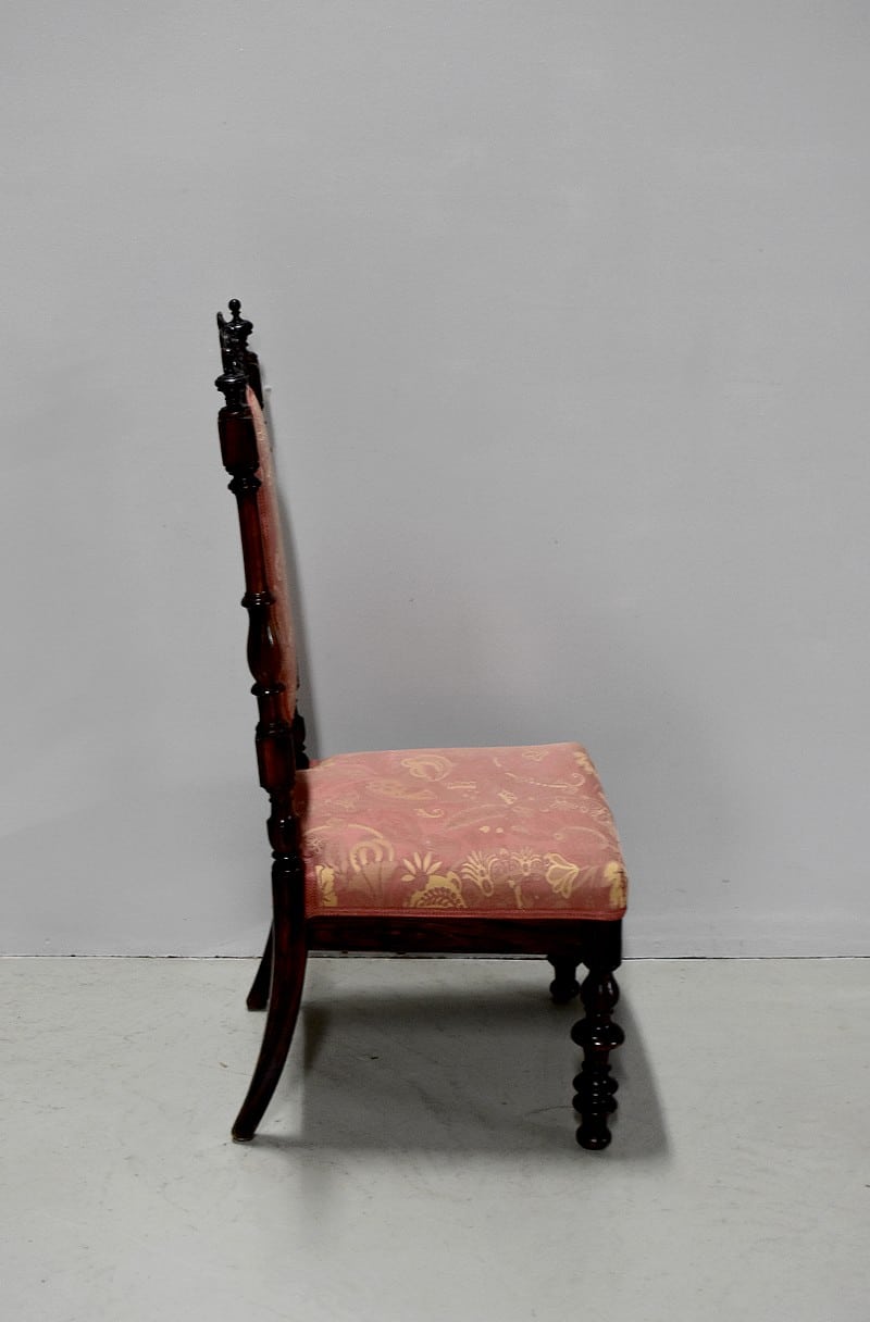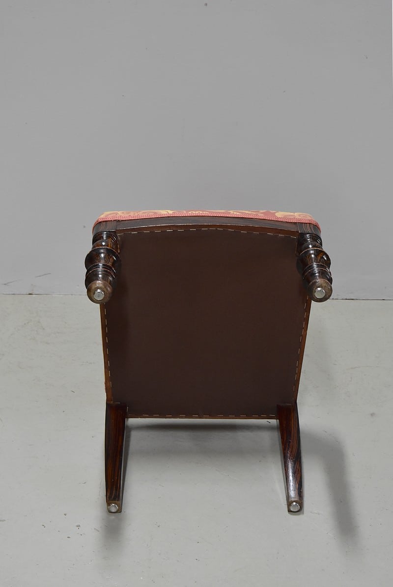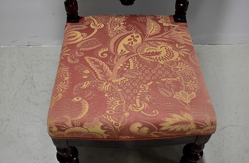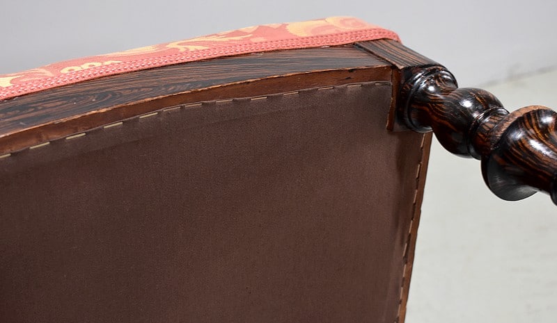 L’assise ainsi que le dossier ont été refaits postérieurement. Le tissu en parfait état, dans des tons rose saumon et jaune, arbore des motifs floraux et est garni d’un galon du rose identique au tissu.