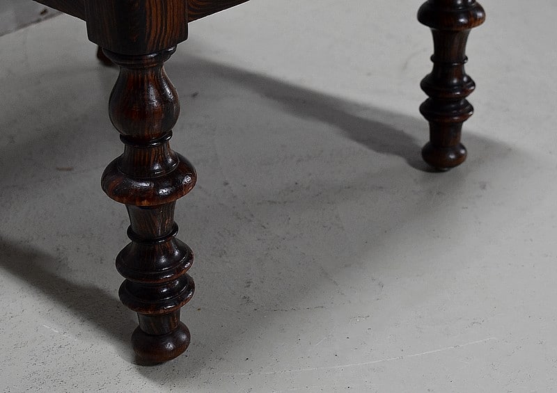 Elle repose sur 2 pieds tournés et moulurés à l’avant et 2 pieds droits et galbés à l’arrière.