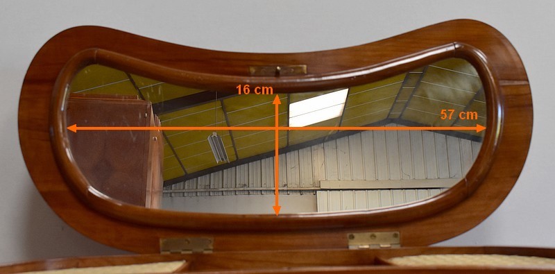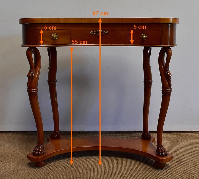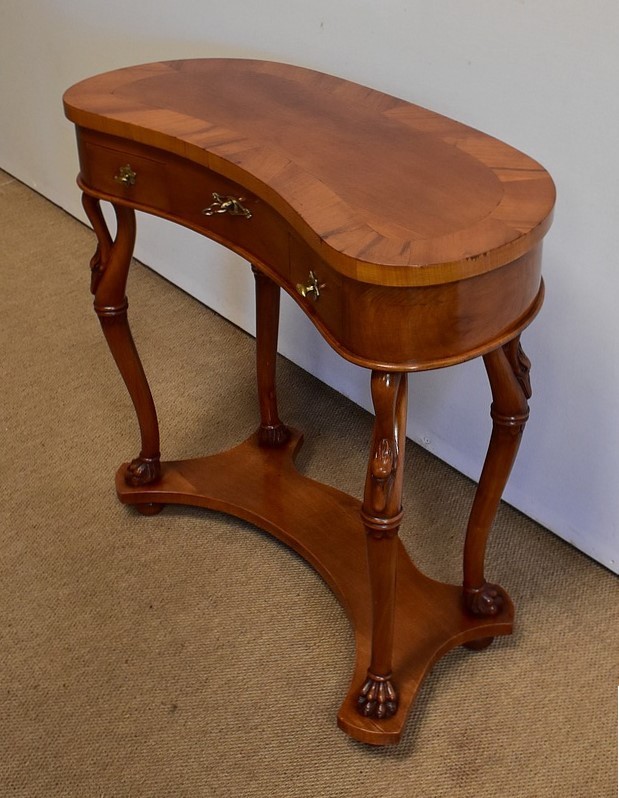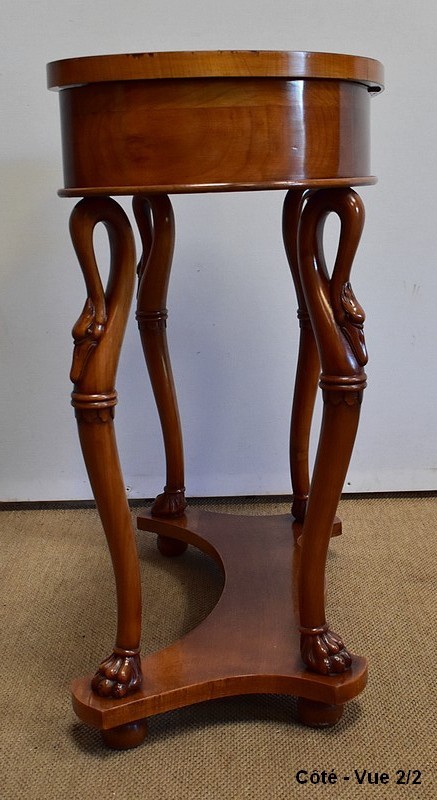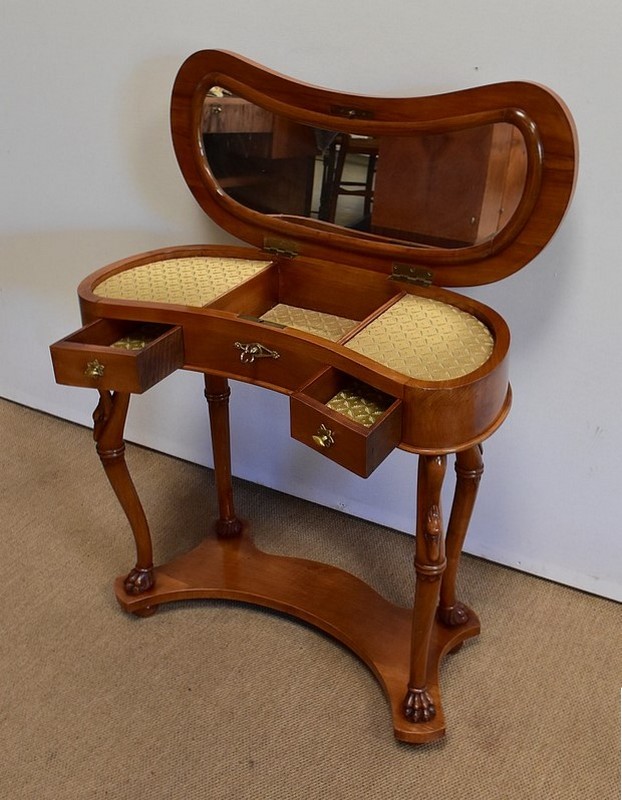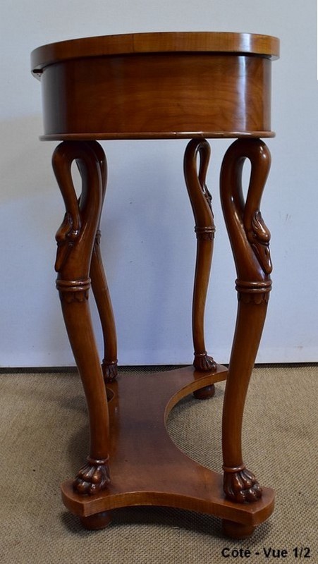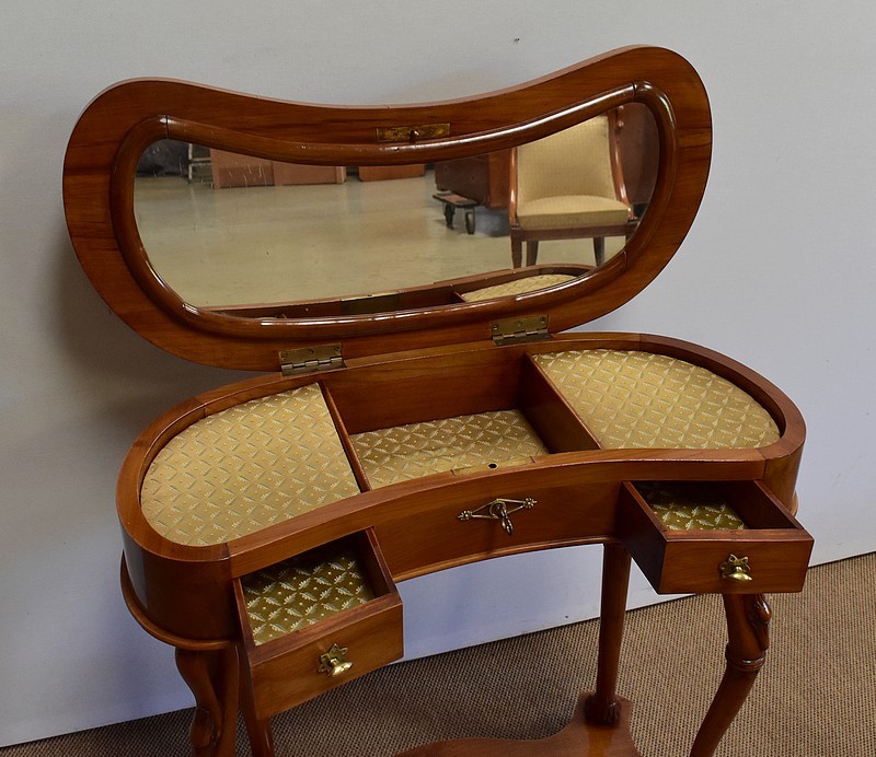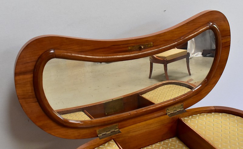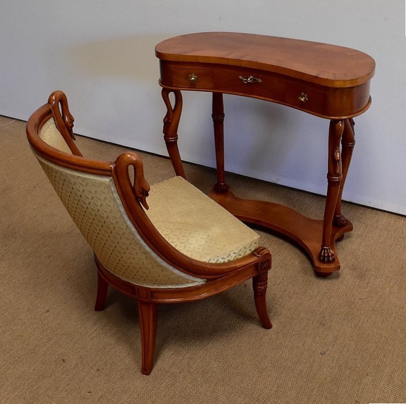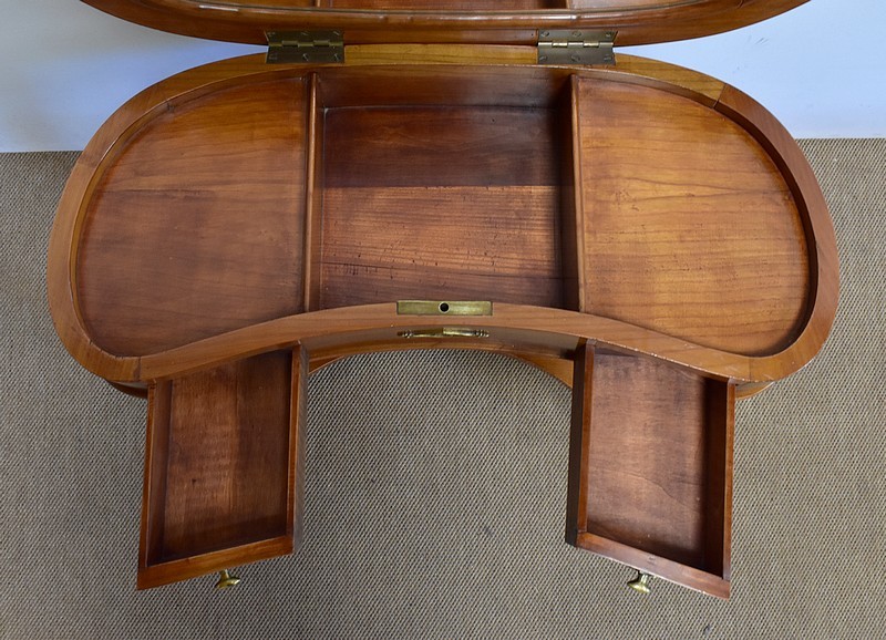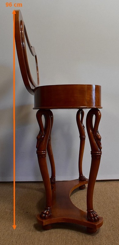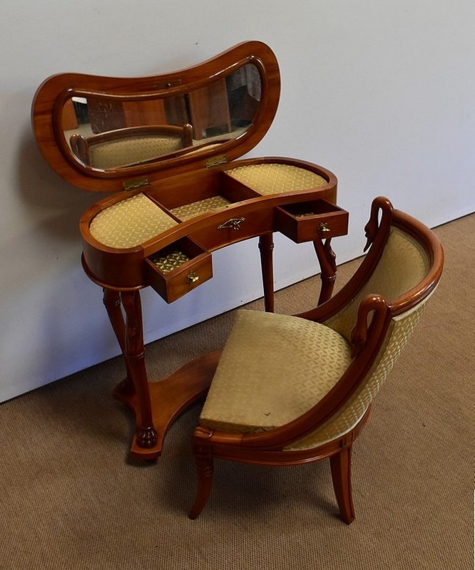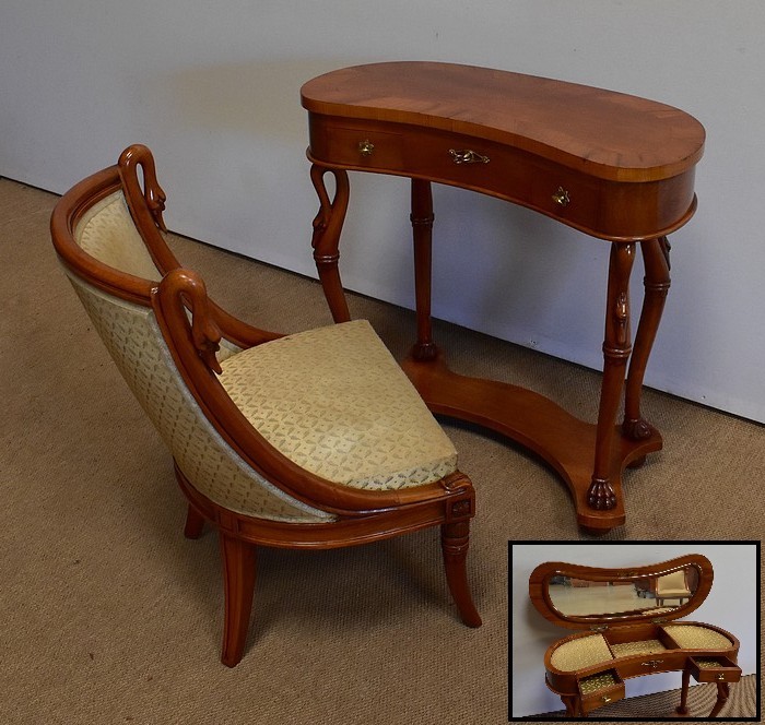 Ensemble de deux meubles en Merisier, constitué, en premier lieu, d’une petite coiffeuse de forme rognon, dans le goût retour d’Égypte. Son dessus, avec encadrement et placage de fil au centre, s’ouvre sur un intérieur compartimenté garni de fonds amovibles en tissu. Cette coiffeuse offre également un miroir au pourtour souligné par une large moulure, et aux lignes épousant celles de l’abattant. On ajoutera que, afin de préserver l’intimité de cet espace, il est équipé d’une serrure d’origine en état de fonctionnement et accompagnée de sa clé. En ceinture, ce meuble propose deux petits tiroirs à boutons lentilles en laiton, dans lesquels on retrouvera des fonds identiques à ceux décrits précédemment. Cette coiffeuse toutes faces se compose de quatre montants en merisier massif, sculptés en élégants cols de cygnes et terminés en griffes. Ils reposent sur une entretoise aux bords largement découpés, elle-même installée sur quatre pieds boules.