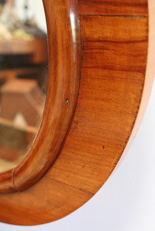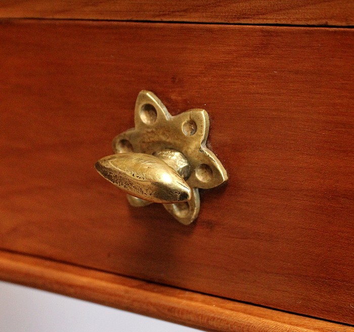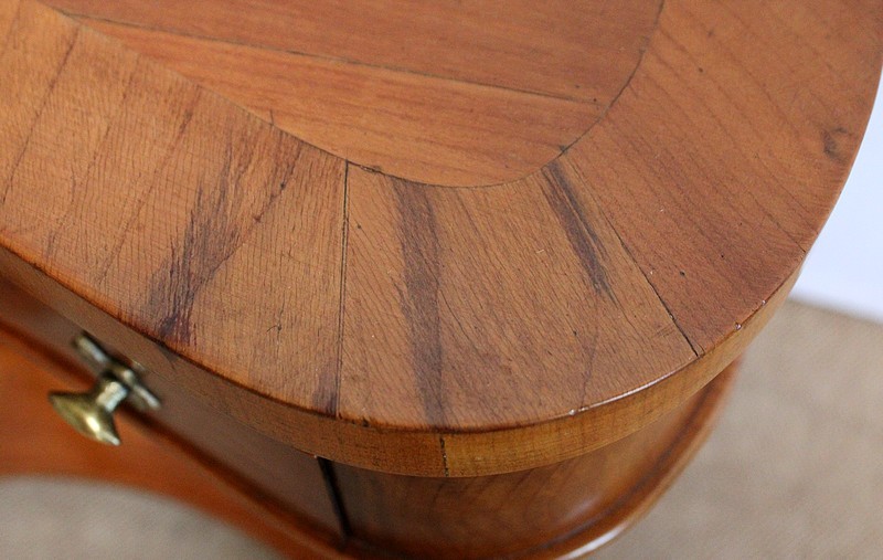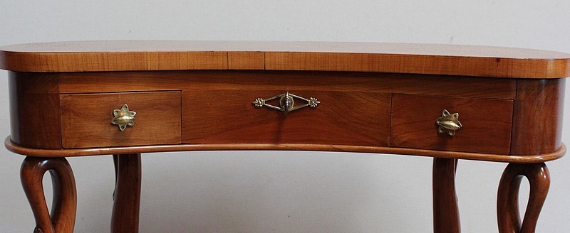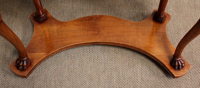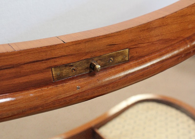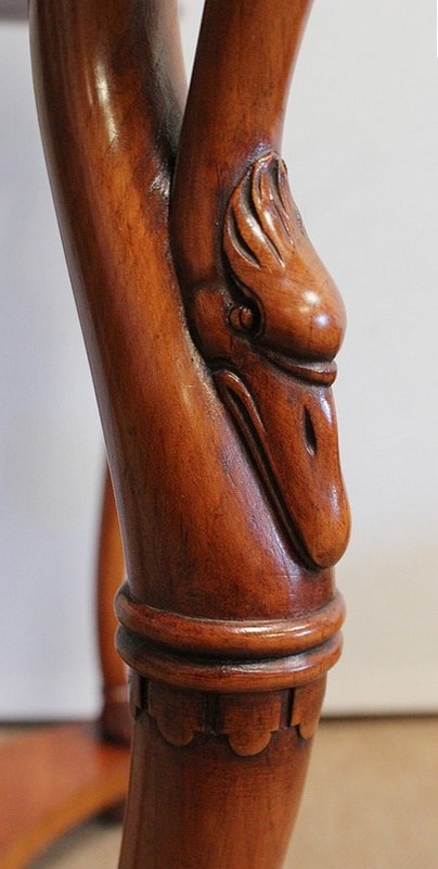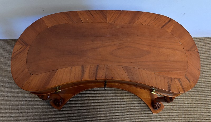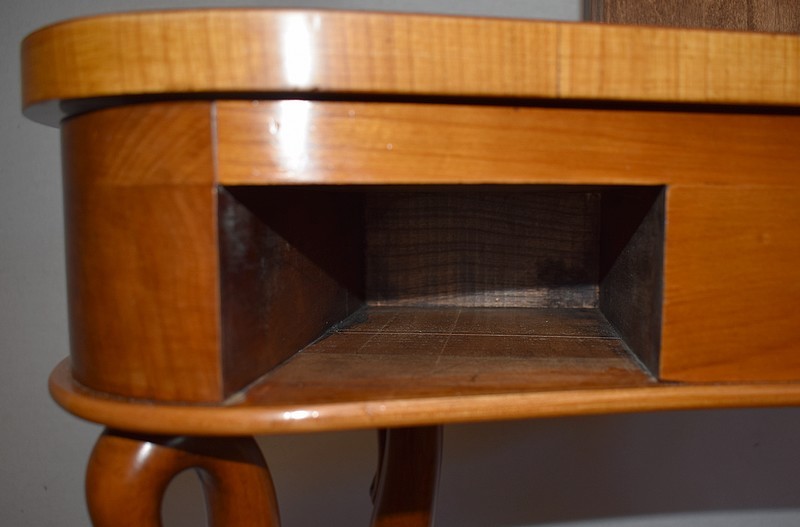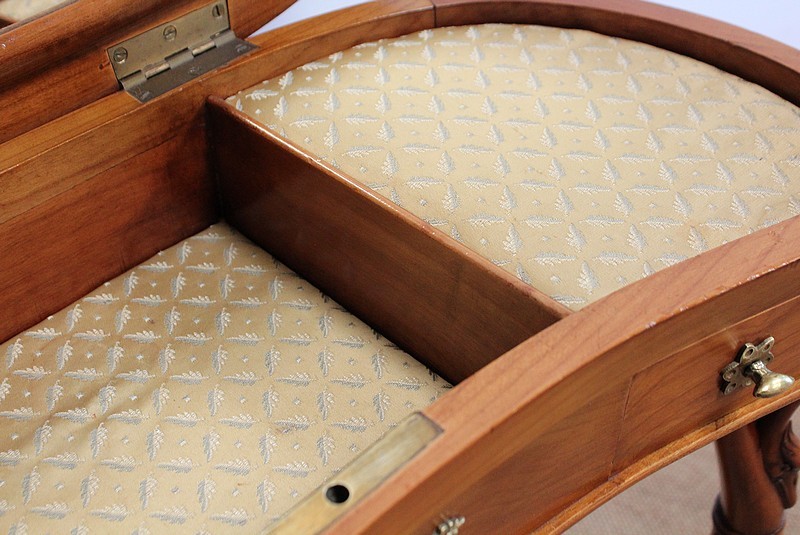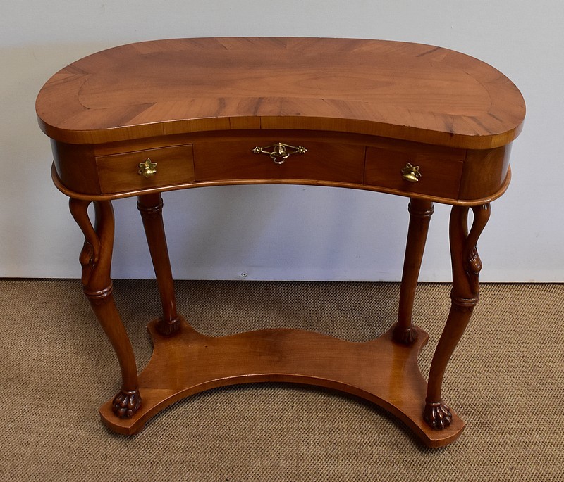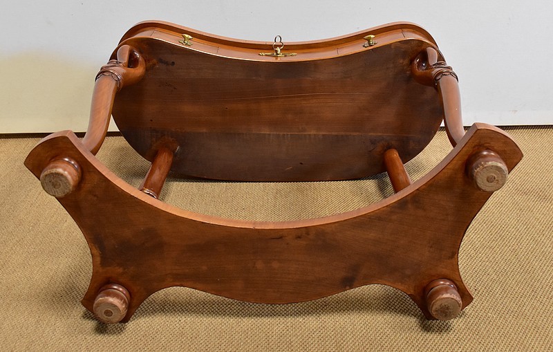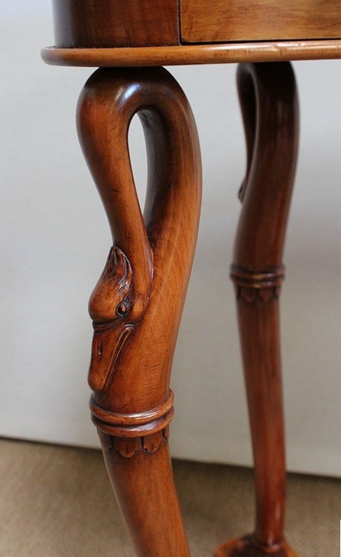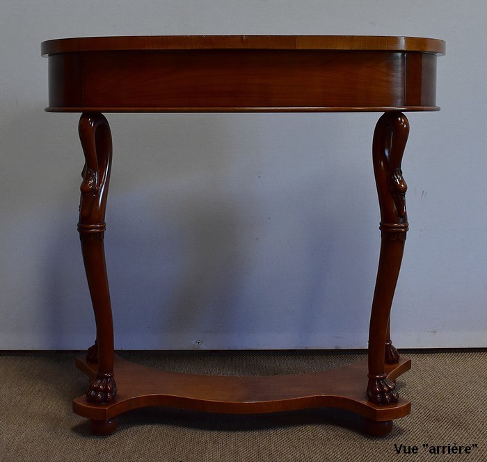 Ensemble de deux meubles en Merisier, constitué, en premier lieu, d’une petite coiffeuse de forme rognon, dans le goût retour d’Égypte. Son dessus, avec encadrement et placage de fil au centre, s’ouvre sur un intérieur compartimenté garni de fonds amovibles en tissu. Cette coiffeuse offre également un miroir au pourtour souligné par une large moulure, et aux lignes épousant celles de l’abattant. On ajoutera que, afin de préserver l’intimité de cet espace, il est équipé d’une serrure d’origine en état de fonctionnement et accompagnée de sa clé. En ceinture, ce meuble propose deux petits tiroirs à boutons lentilles en laiton, dans lesquels on retrouvera des fonds identiques à ceux décrits précédemment. Cette coiffeuse toutes faces se compose de quatre montants en merisier massif, sculptés en élégants cols de cygnes et terminés en griffes. Ils reposent sur une entretoise aux bords largement découpés, elle-même installée sur quatre pieds boules.