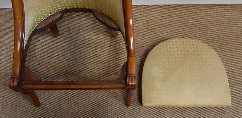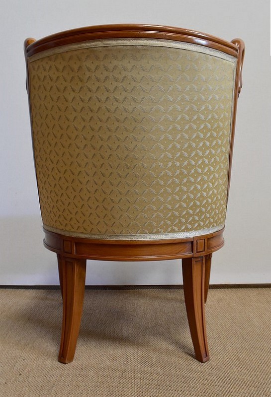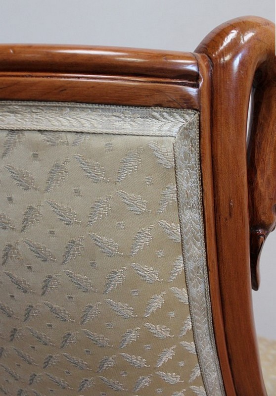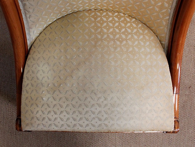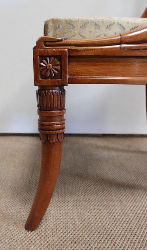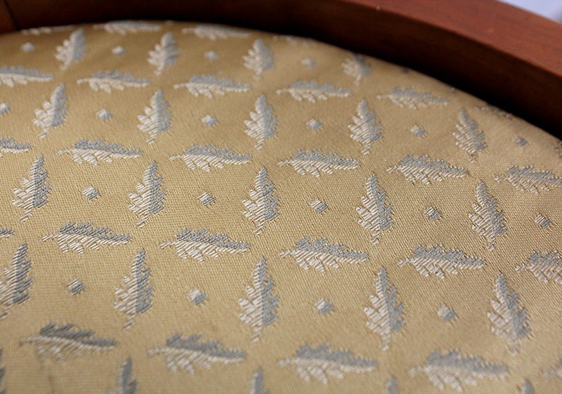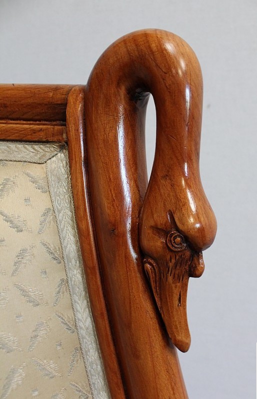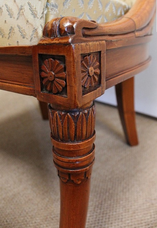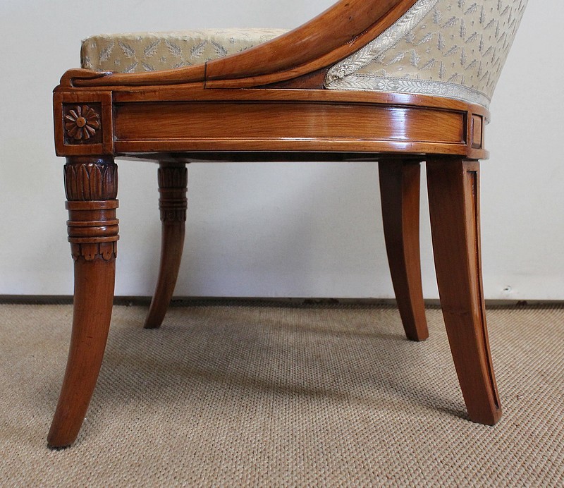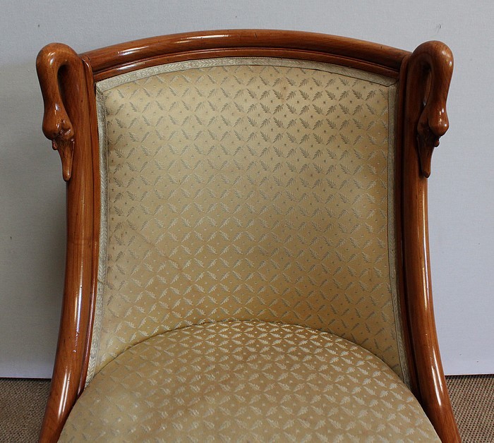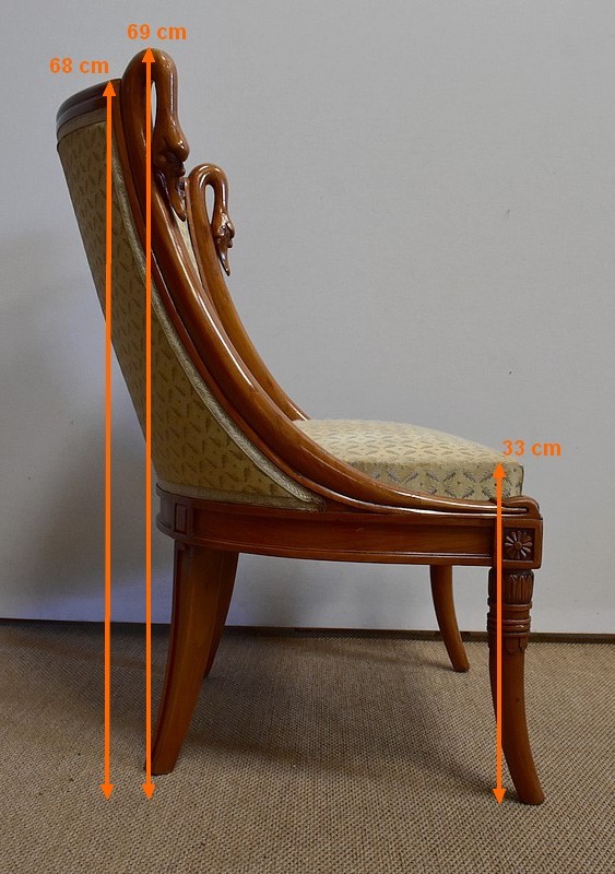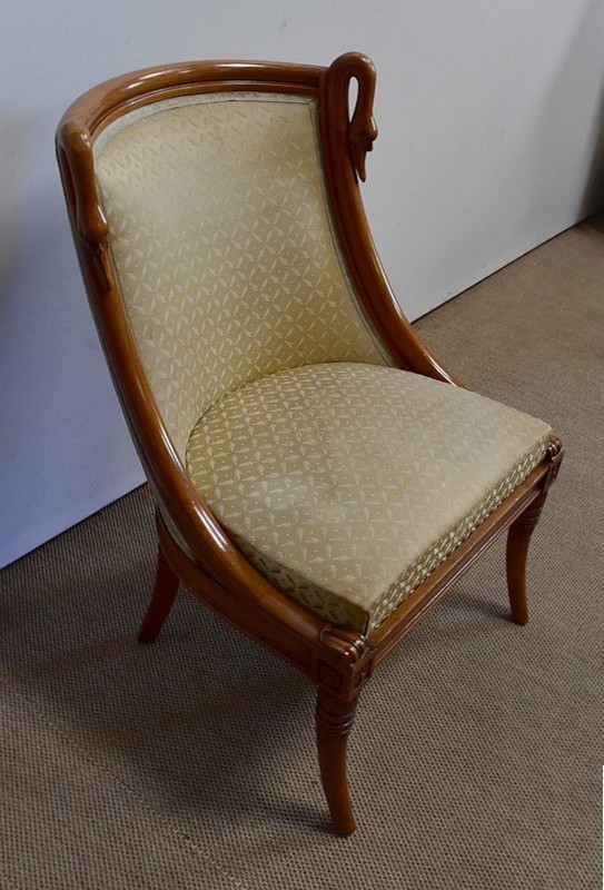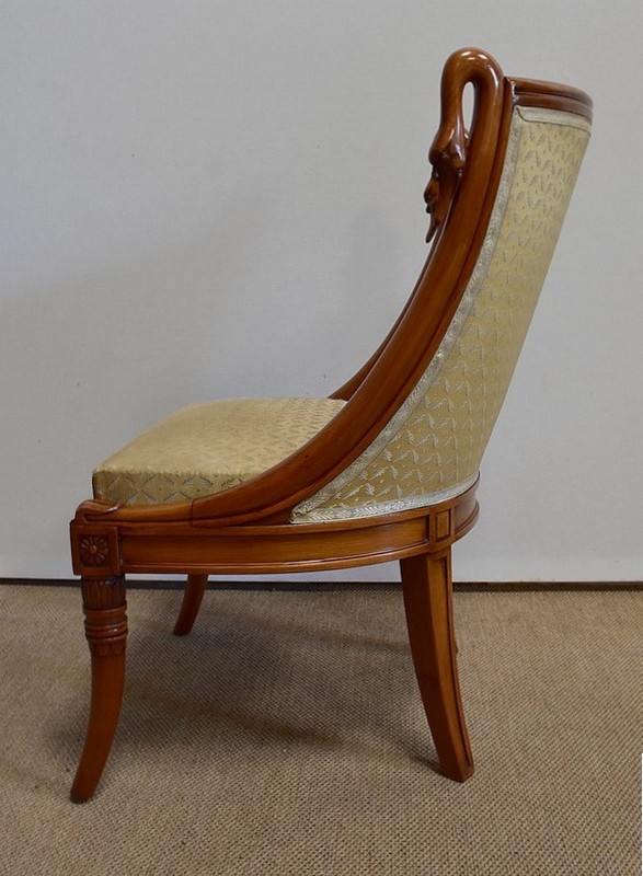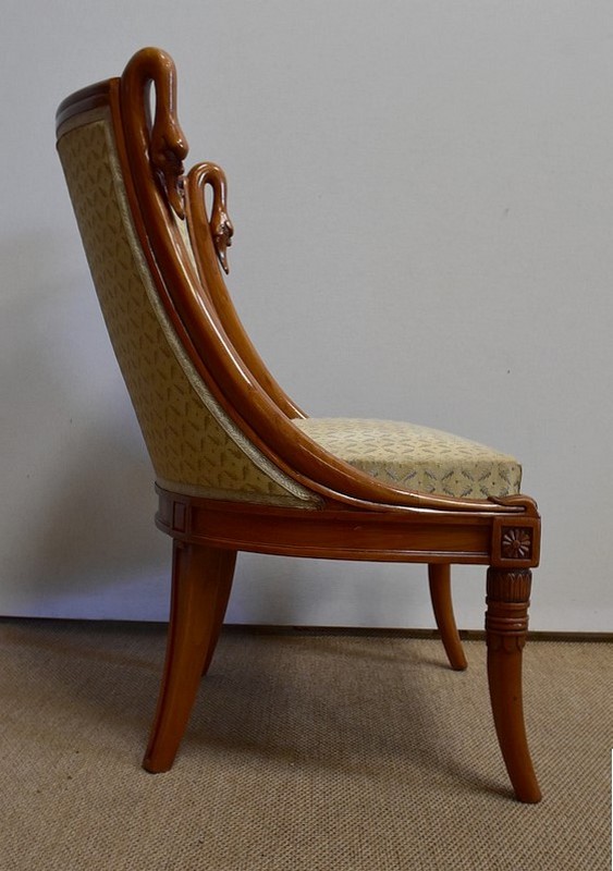On associera à ce meuble une ravissante chauffeuse, à structure en merisier massif. Son dossier, idéalement incurvé, ainsi que son assise, équerrée, sont recouverts d’un tissu jaune champagne à motifs feuillagés, commun à celui utilisé pour la coiffeuse. On retrouvera également sur les montants les gracieux palmipèdes blancs. Ce siège repose sur quatre pieds sabres sommés, pour ceux de l’avant, de dés de raccordement à décors de fleurs.
