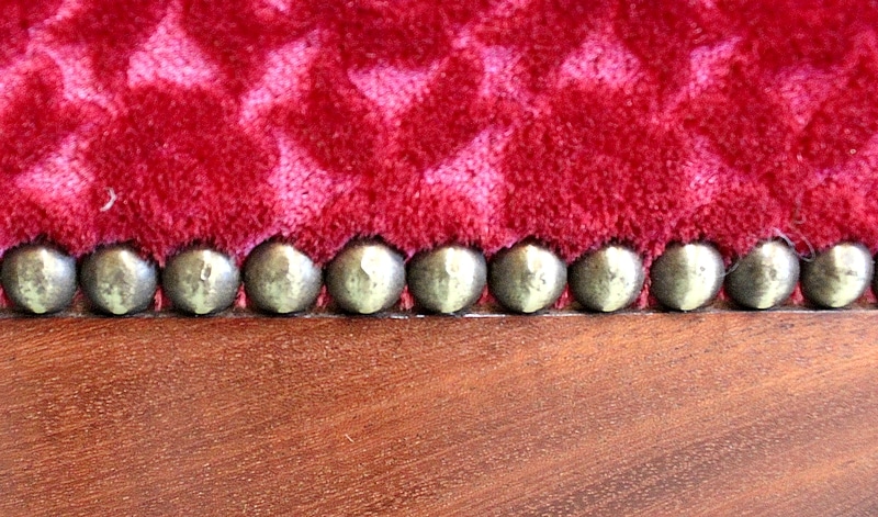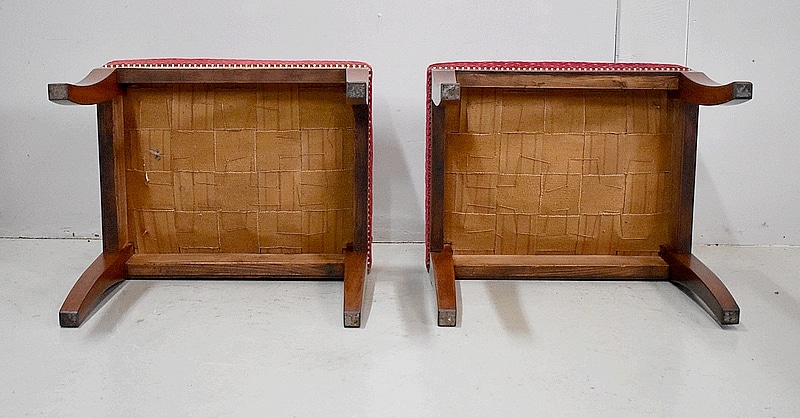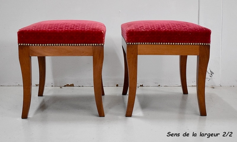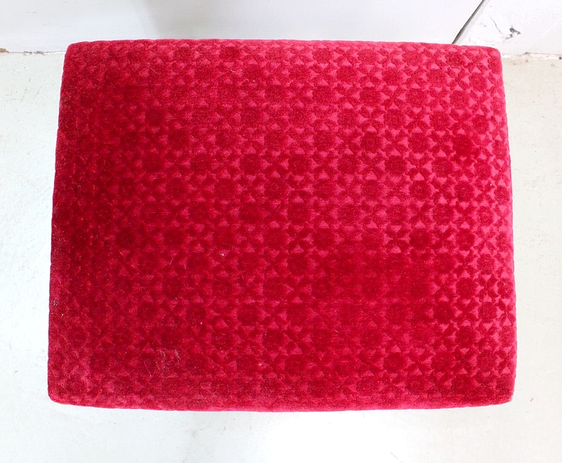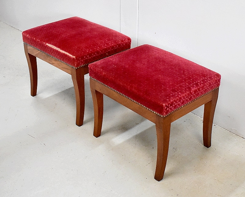 Les assises sont recouvertes d’un Tissu en Velours Rouge Frappé. Ces Tabourets, Confortable et Fermes, ont bénéficié d’une confection Qualitative et Traditionnelle avec Ressorts, Sangles et Crin Animal.