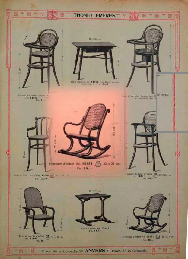 La maison Thonet, créée en 1859, a révolutionné l’industrie du mobilier en brevetant son procédé permettant de cintrer le bois bouilli dans un bain de colle, afin de le rendre courbé.